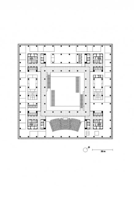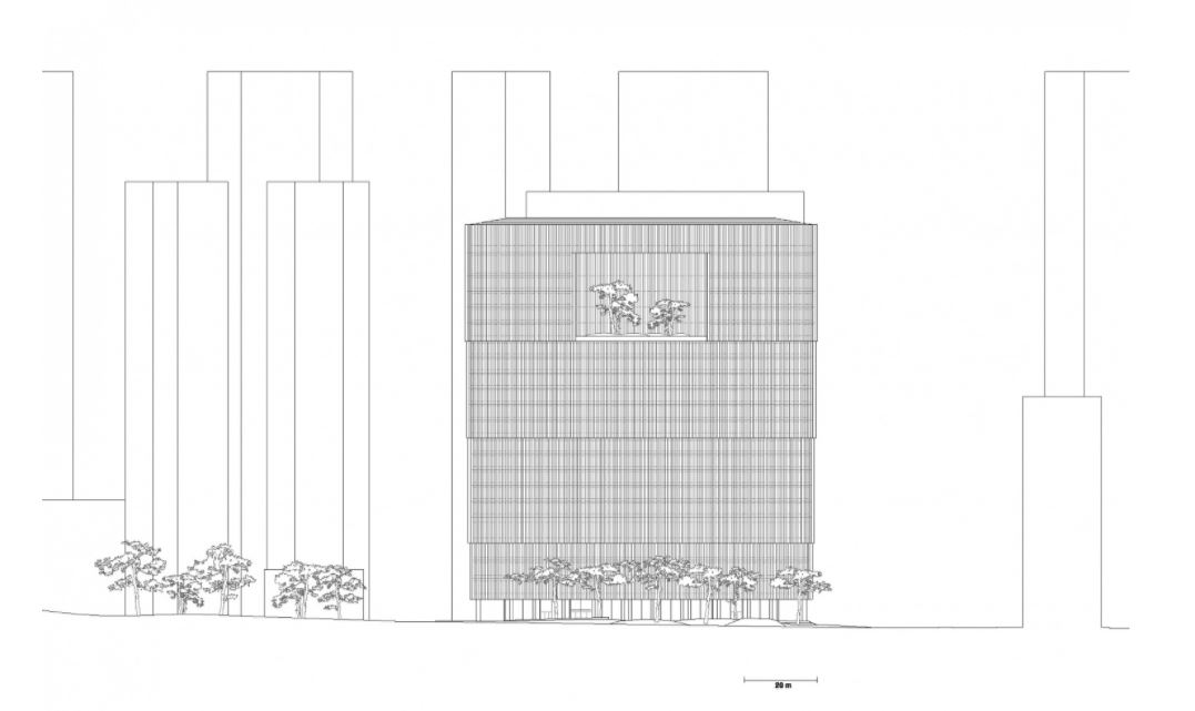 The form of the building is both abstract and gestural. Focusing on a single, clear volume, the proportions of the building have been carefully developed around a central courtyard to maximise the effectiveness of natural ventilation and daylight. Three large urban openings connect this central void with the exterior surroundings, providing views over the city and the mountains in the distance and therefore establishing a sense of orientation and belonging. As ‘hanging gardens’, these openings give scale and allow nature to extend from the adjacent park into all parts of the building.