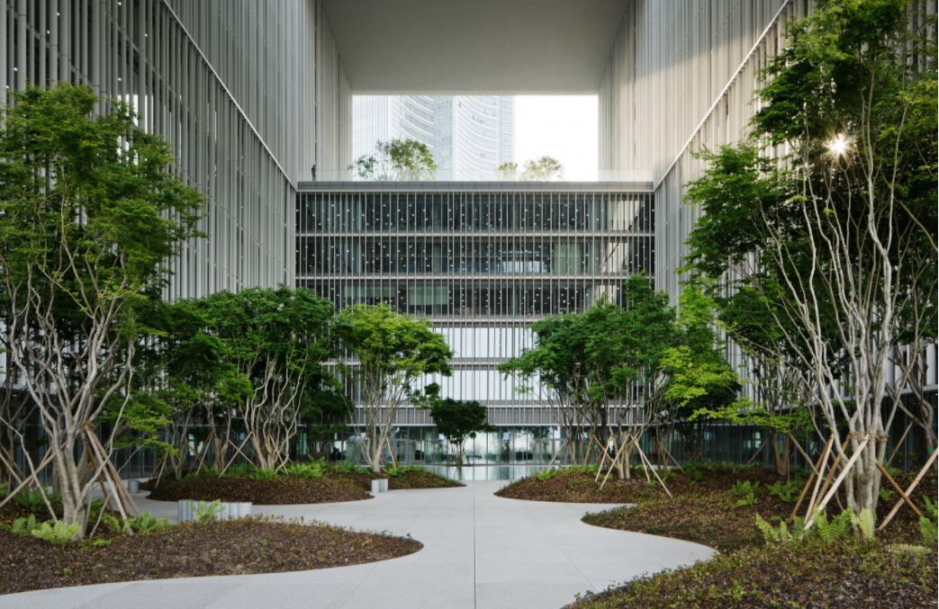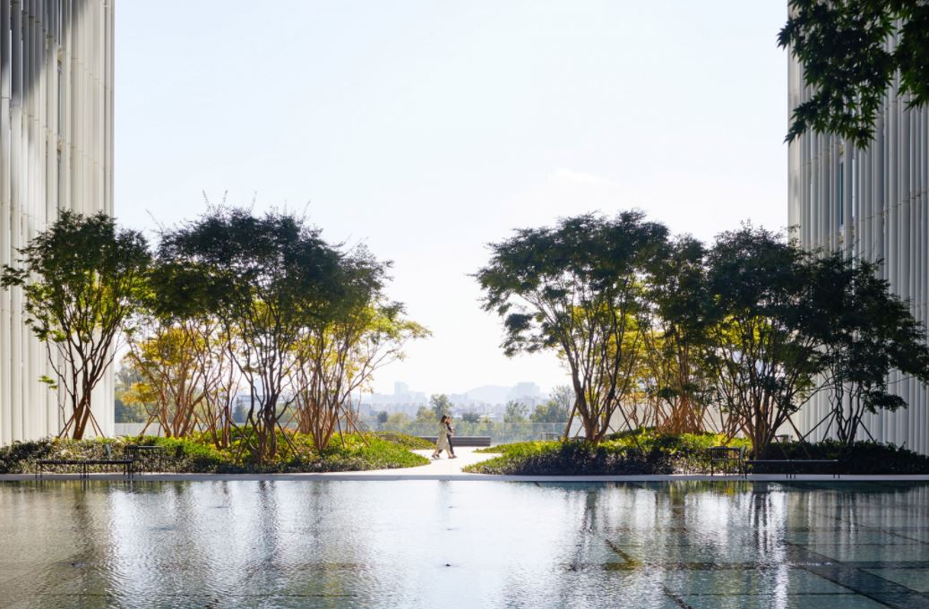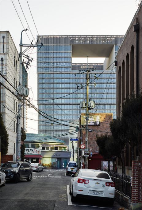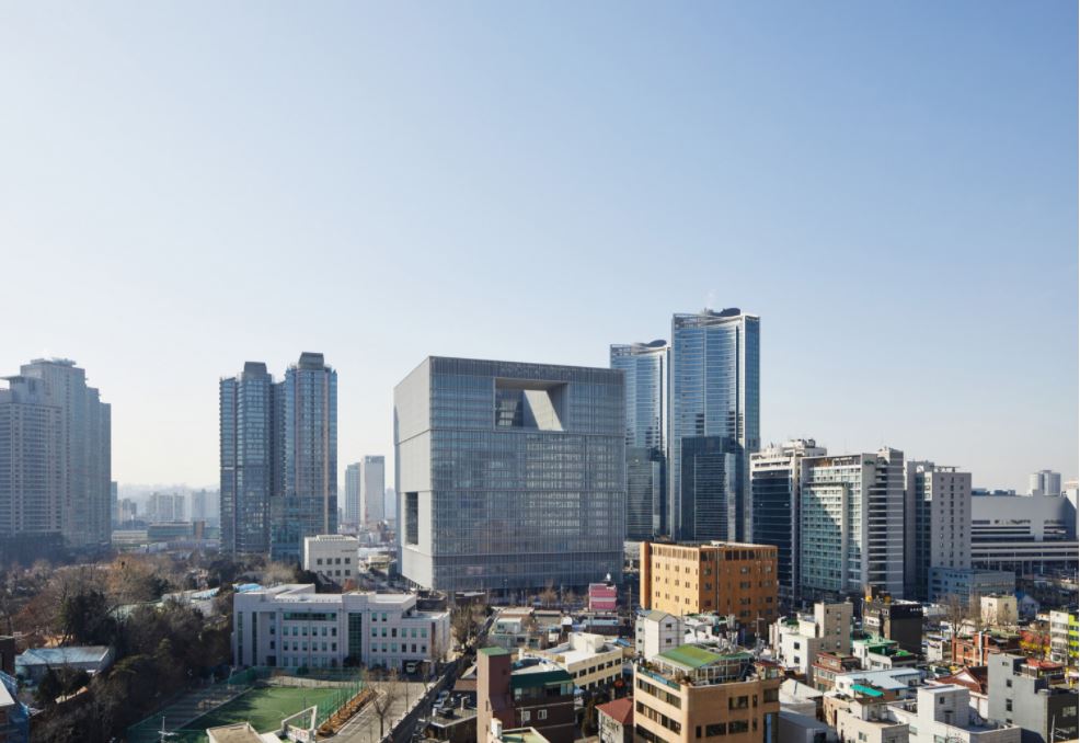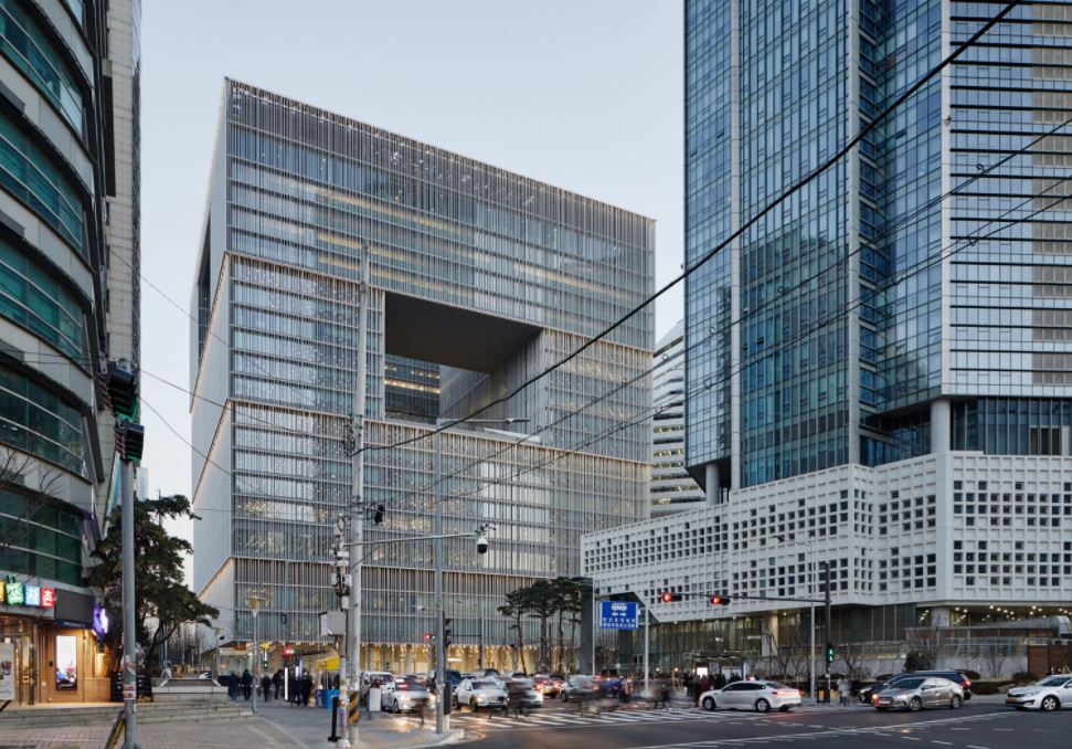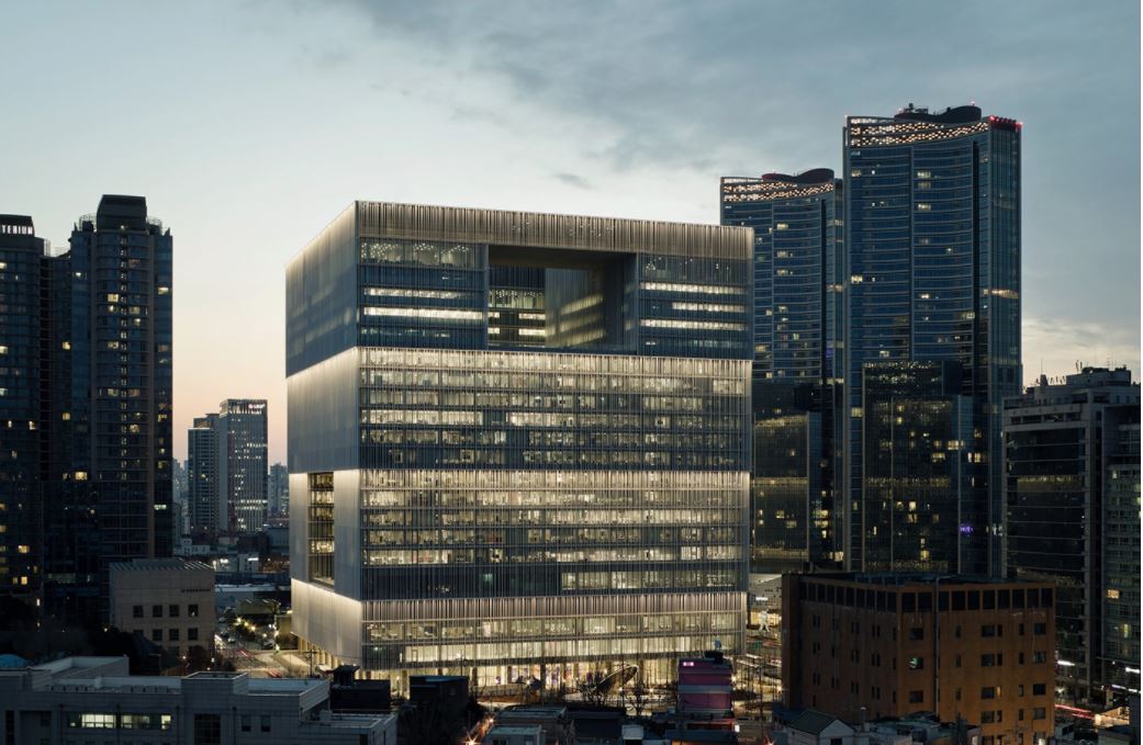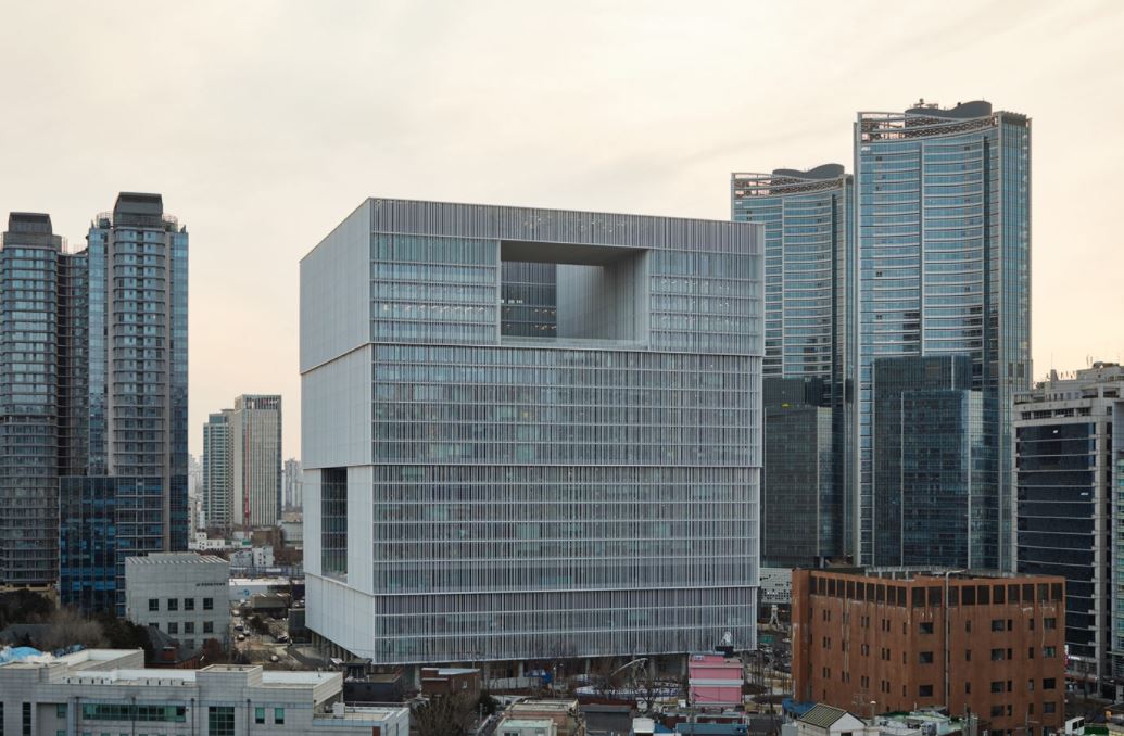 The new headquarters for Amorepacific, Korea’s largest beauty company, is located in the centre of Seoul at a site which has been occupied by the company since 1956. It is situated next to a former US military zone that is being transformed into the spacious public Yongsan Park and a business district, which was part of a masterplan representing the largest high-rise development in Korea that substantially altered the urban fabric of the Yongsan district.