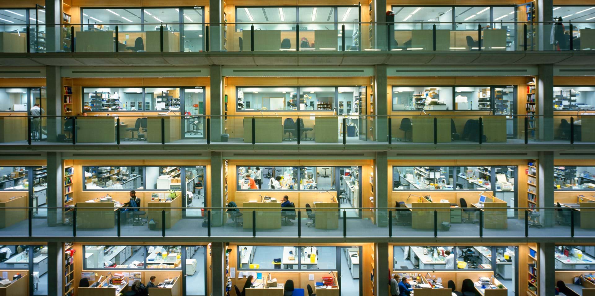 At its heart is a research forum on five levels, where research work not directly associated with the laboratory takes place. It provides an open arena where researchers can meet their colleagues from all disciplines and all levels, and forms the hub of the building’s primary circulation system. Standard and specialist laboratories are wrapped around the forum, as are undergraduate teaching spaces, administration and a café.