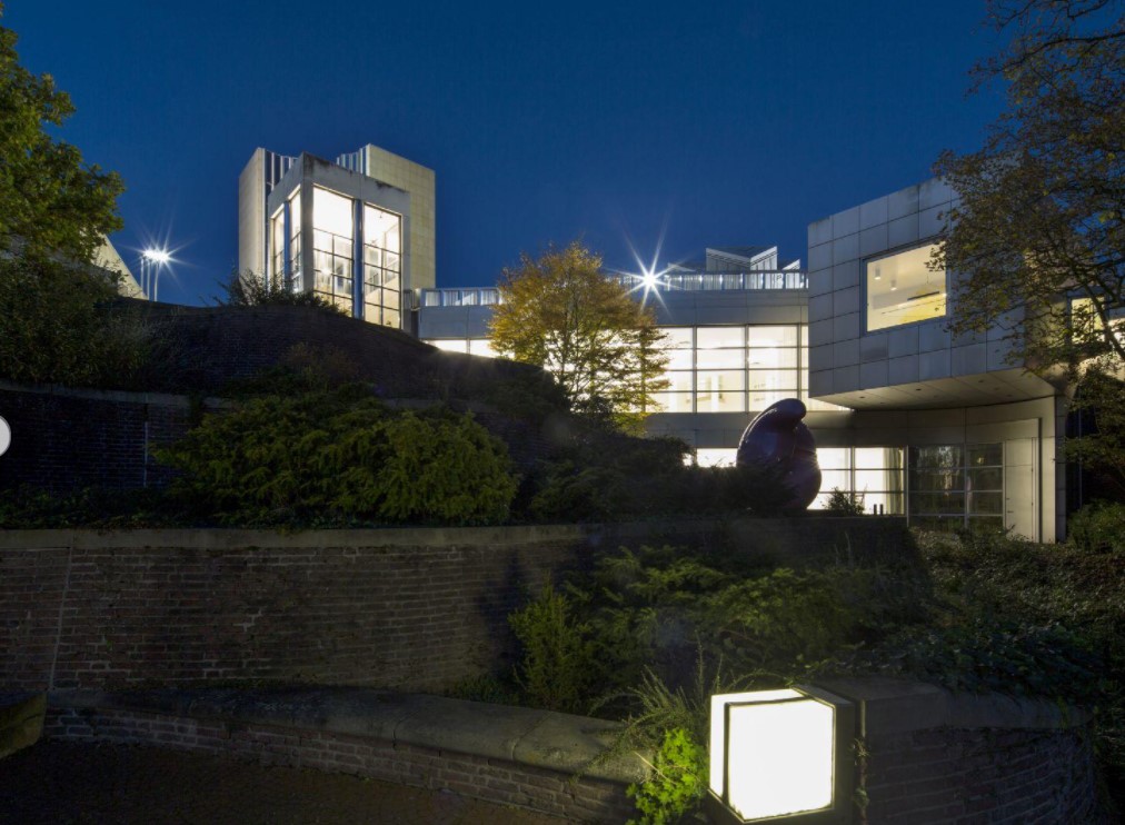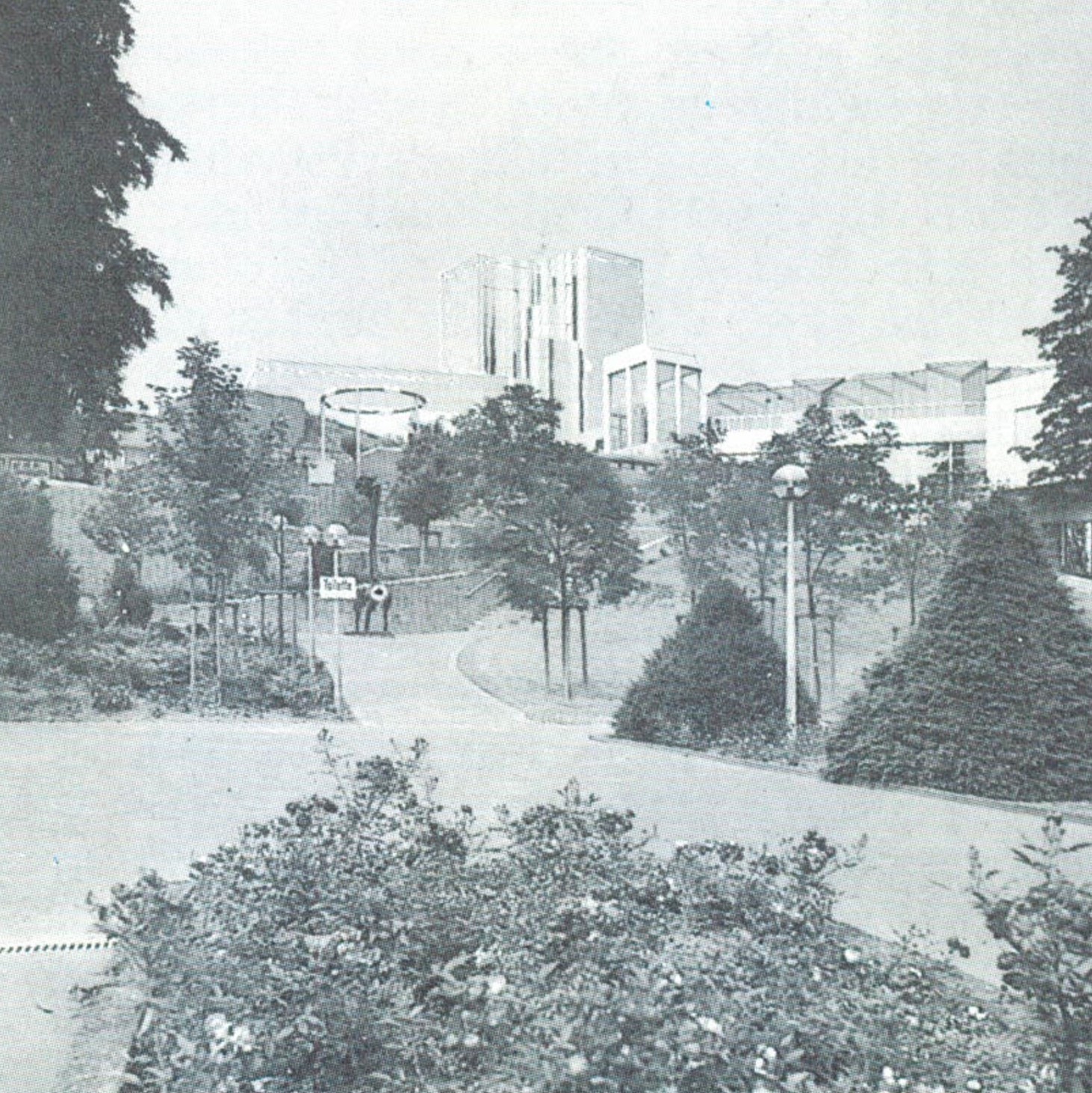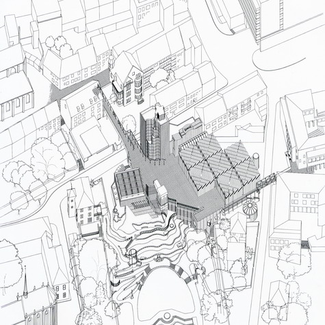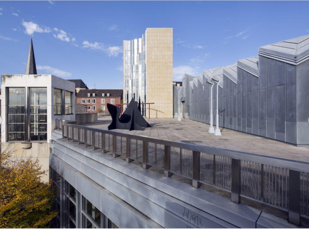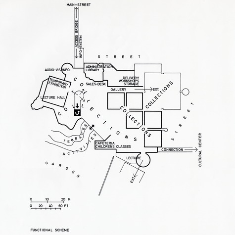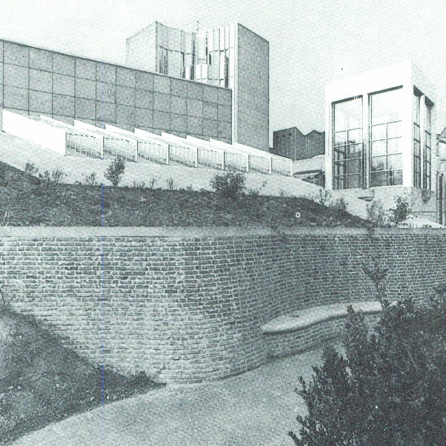 From the town, one enters the museum precinct via an elevated walkway that leads to a stone-faced platform whereon is set a tower containing administrative offices; a library; workshops and storage; a cubic, top-lighted undivided volume for temporary displays; the shedroofed, zinc-clad “clover-leaf” pavilion for the permanent collection; and the entrance temple. The platform also covers museum spaces excavated into the hill, and from it, one can descend gradually to curving terraces, furnished with sculpture, that border the gardens of the former abbey; beneath a portion of the terraces are additional exhibition areas.