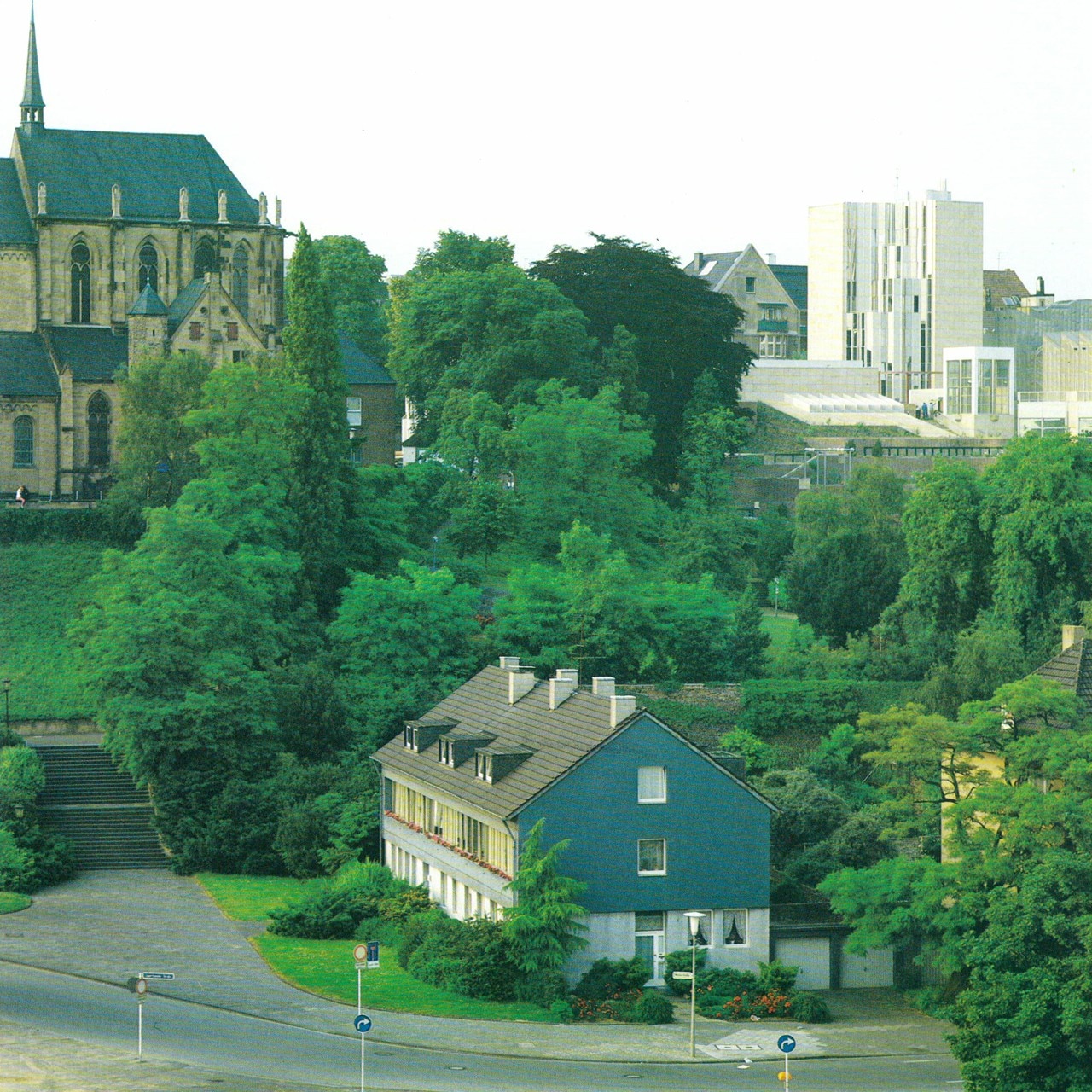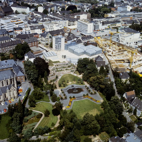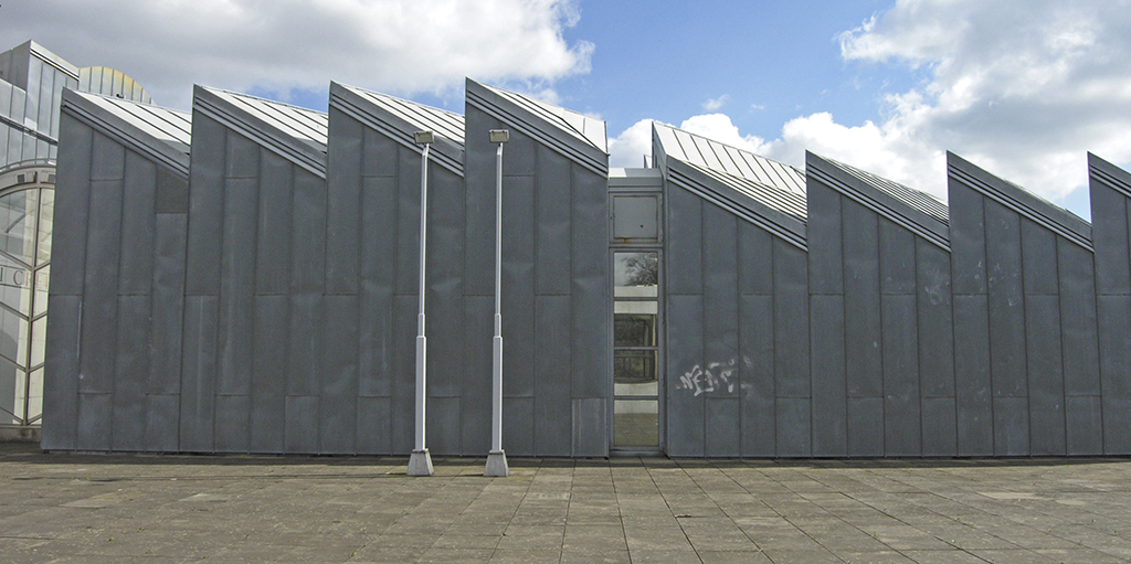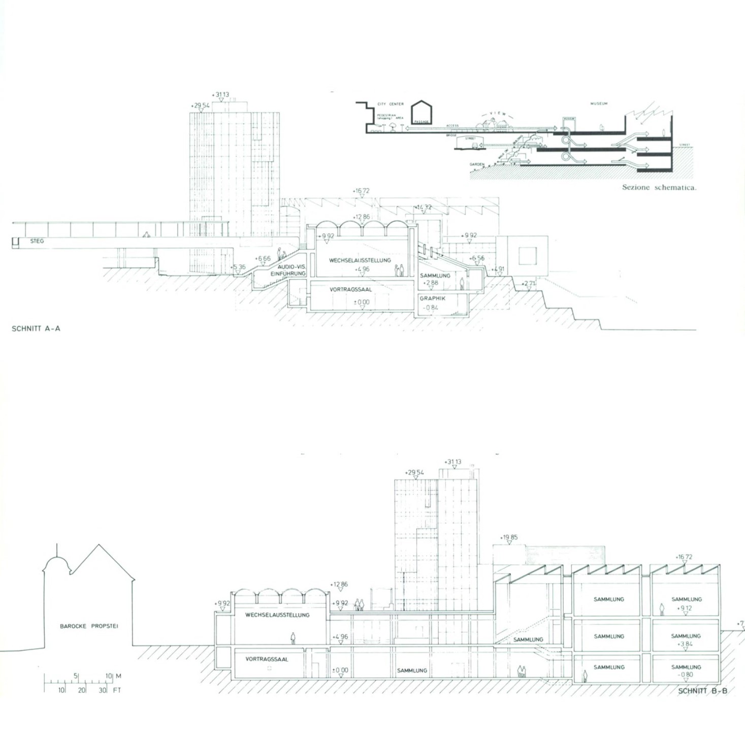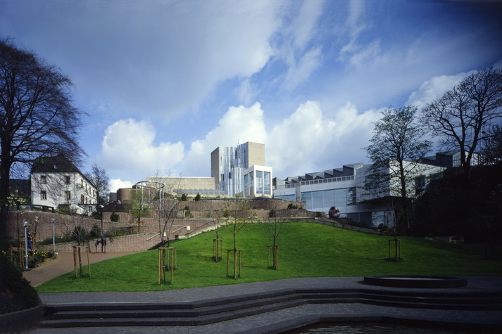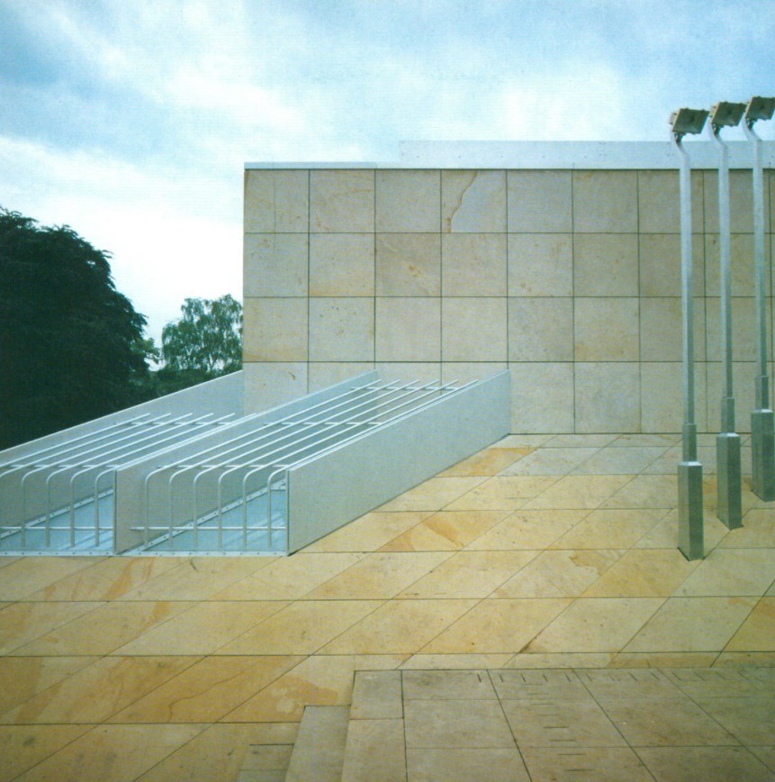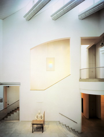 Although Hollein has learned from the institutional buildings of Louis I.Kahn and Alvar Aalto, he listens to his own music, which—to pursue the metaphor—includes concerti from the 18th, symphonies from the 19th, and popular songs from the 20th centuries. His eclecticism served him well in this complex commission, made more difficult by the need for the museum to serve urban as well as aesthetic ends. Hollein has linked Mönchengladbach’s town center on the heights with the medieval Ettal Abbey (today the city hall) on the slopes below, assembling a multi-tiered museum from a series of discrete elements of different sizes and shapes that provide a series of delightfully varied indoor and outdoor rooms. Distributing the individual volumes in space rather than containing them within a monolithic whole allowed him to maintain the picturesque scale of the town; at the subterranean level, the disparate sections are united.