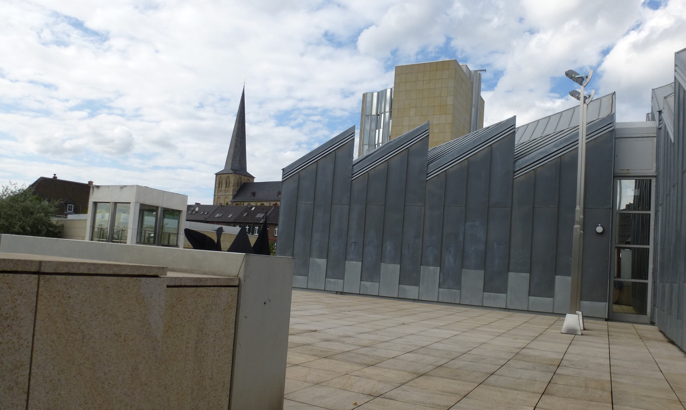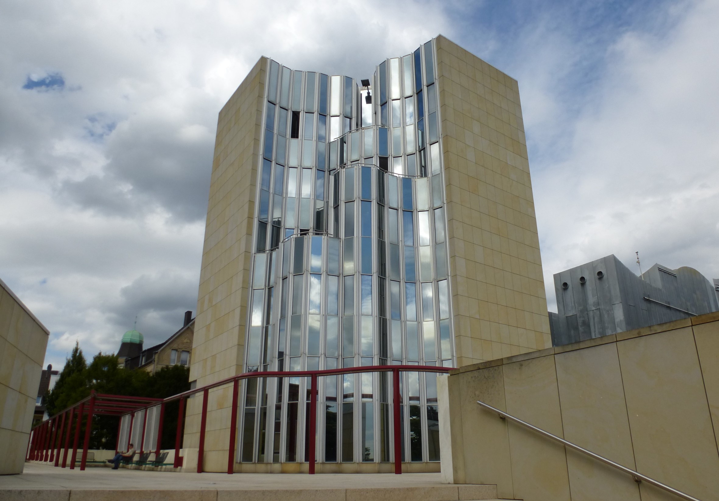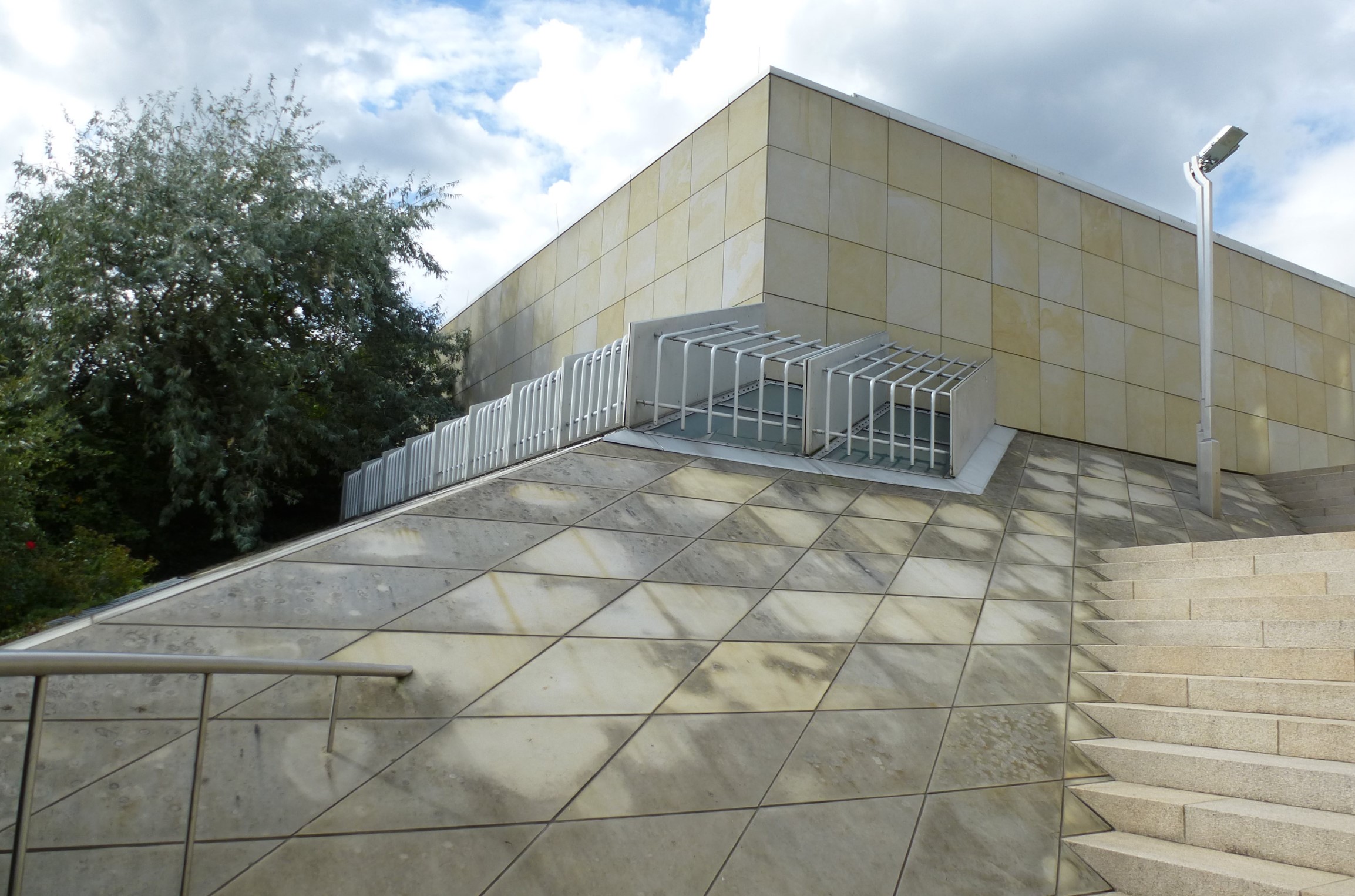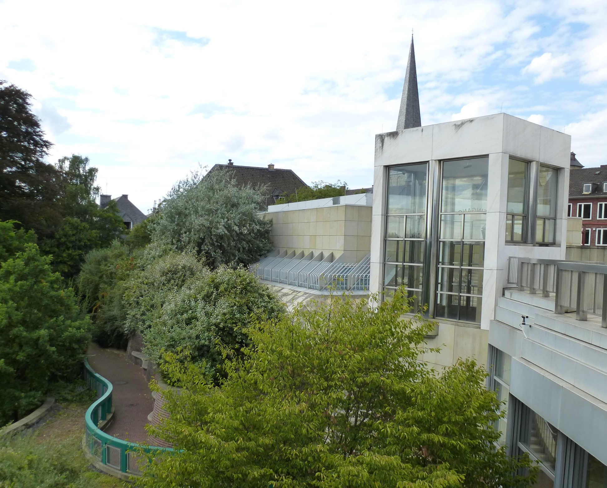 Although Hollein has learned from the institutional buildings of Louis I.Kahn and Alvar Aalto, he listens to his own music, which—to pursue the metaphor—includes concerti from the 18th, symphonies from the 19th, and popular songs from the 20th centuries. His eclecticism served him well in this complex commission, made more difficult by the need for the museum to serve urban as well as aesthetic ends. Hollein has linked Mönchengladbach’s town center on the heights with the medieval Ettal Abbey (today the city hall) on the slopes below, assembling a multi-tiered museum from a series of discrete elements of different sizes and shapes that provide a series of delightfully varied indoor and outdoor rooms. Distributing the individual volumes in space rather than containing them within a monolithic whole allowed him to maintain the picturesque scale of the town; at the subterranean level, the disparate sections are united.