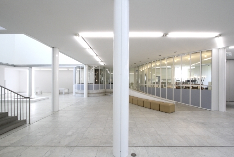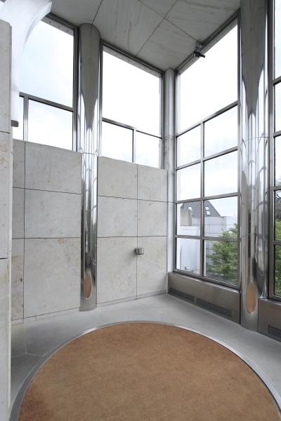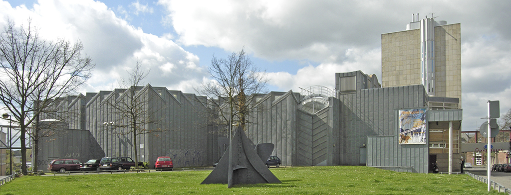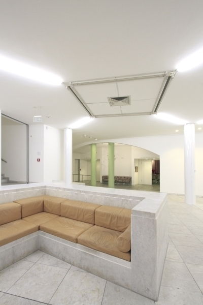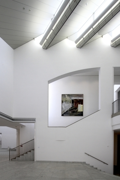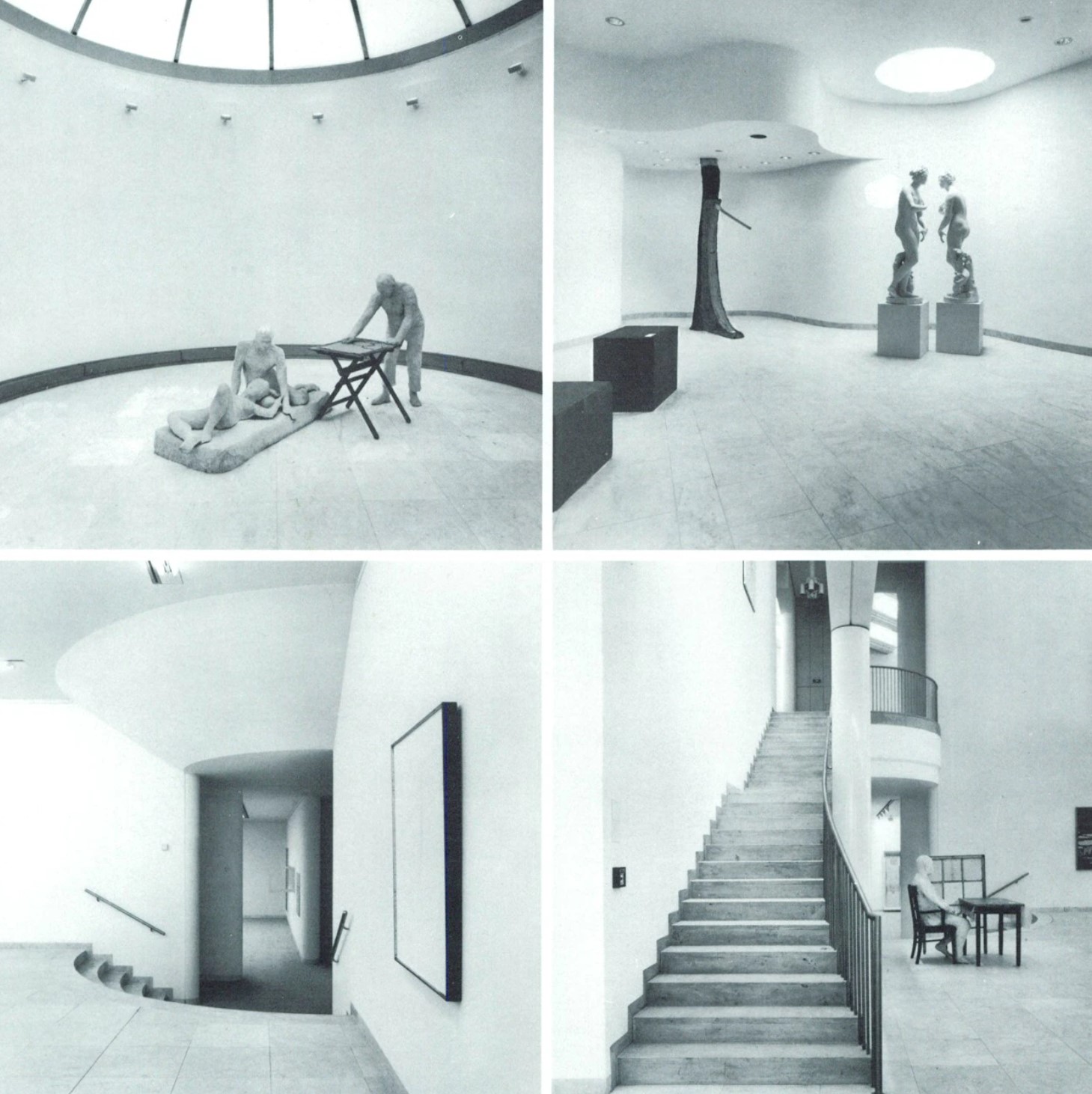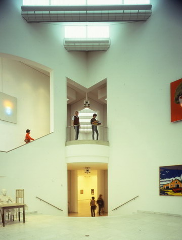 Hollein has rejected the prescribed routes encountered in traditional museums for mysterious, polymorphous paths that compel the viewer to wander on her own and discover unexpected places, then to turn back on them or chance on new chambers. Because chronology is not the issue it would be for a historically based collection, the ad hoc character is stimulating rather than frustrating. Upstairs and downstairs, under- and above-ground, the variously configured galleries illuminated by diverse means—daylight through windows and skylights and artificial light via incandescent, neon, and fluorescent fixtures—permit individual works to be perceived in the setting most sympathetic to their makers’ intentions. The most organized part of the display areas comprises what Hollein calls the “cloverleaf”—a group of seven “kissing squares,” to use Kahn’s formulation, that are traversed at the corners. Set under saw-toothed skylights, these rooms are ideal for big pieces by such artists as Andy Warhol, Frank Stella, Carl Andre, and Roy Lichtenstein. There are also curved rooms, some with undulating walls that are positively Baroque in character; double-height spaces and circular steps add further drama. Hollein’s rejection of the convention of amorphous flexible areas, dominant since the 1940s, in favor of a rich variety of specific and distinctive spaces, would in the 1990s become a popular solution for art museums—yet another example of the way the Museum Abteiberg adumbrates many later schemes for this type of institution.