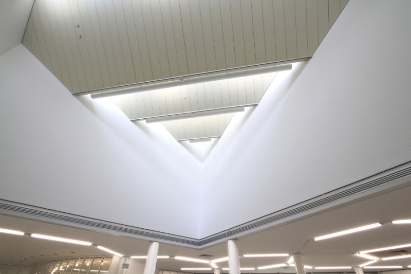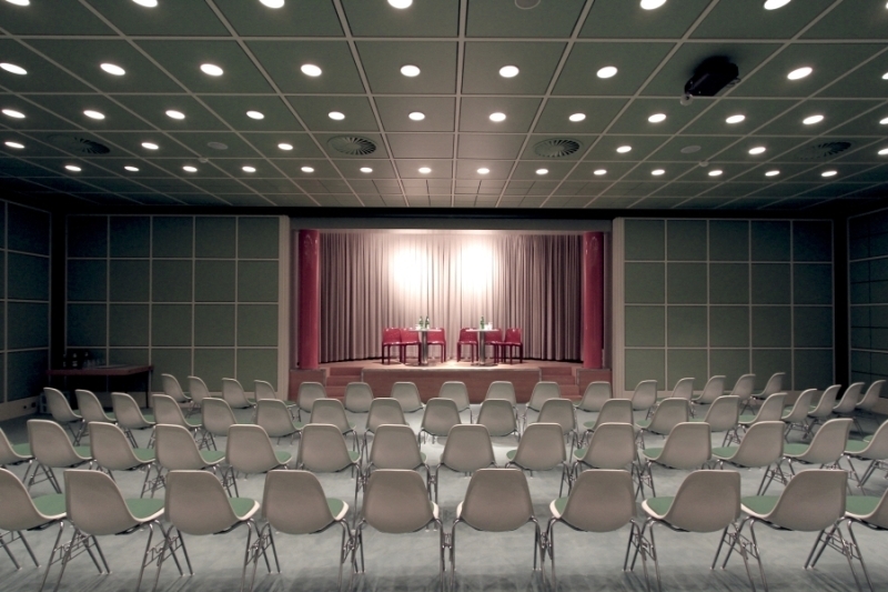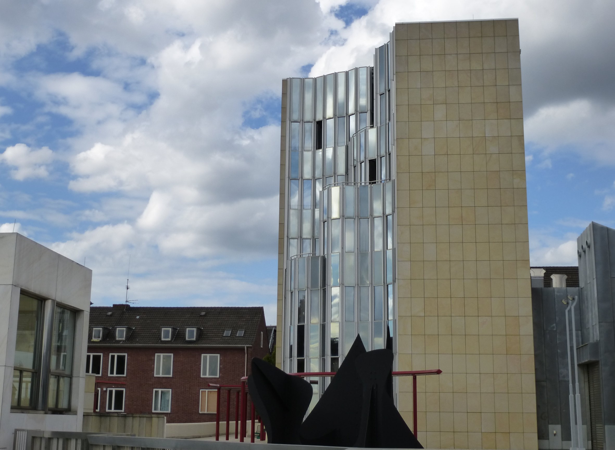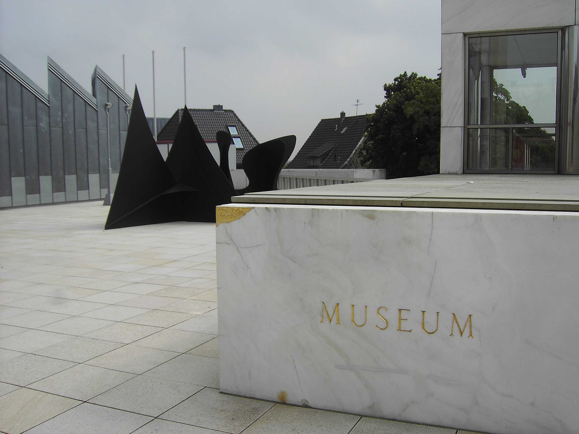 Hollein has rejected the prescribed routes encountered in traditional museums for mysterious, polymorphous paths that compel the viewer to wander on her own and discover unexpected places, then to turn back on them or chance on new chambers. Because chronology is not the issue it would be for a historically based collection, the ad hoc character is stimulating rather than frustrating. Upstairs and downstairs, under- and above-ground, the variously configured galleries illuminated by diverse means—daylight through windows and skylights and artificial light via incandescent, neon, and fluorescent fixtures—permit individual works to be perceived in the setting most sympathetic to their makers’ intentions. The most organized part of the display areas comprises what Hollein calls the “cloverleaf”—a group of seven “kissing squares,” to use Kahn’s formulation, that are traversed at the corners. Set under saw-toothed skylights, these rooms are ideal for big pieces by such artists as Andy Warhol, Frank Stella, Carl Andre, and Roy Lichtenstein. There are also curved rooms, some with undulating walls that are positively Baroque in character; double-height spaces and circular steps add further drama. Hollein’s rejection of the convention of amorphous flexible areas, dominant since the 1940s, in favor of a rich variety of specific and distinctive spaces, would in the 1990s become a popular solution for art museums—yet another example of the way the Museum Abteiberg adumbrates many later schemes for this type of institution.