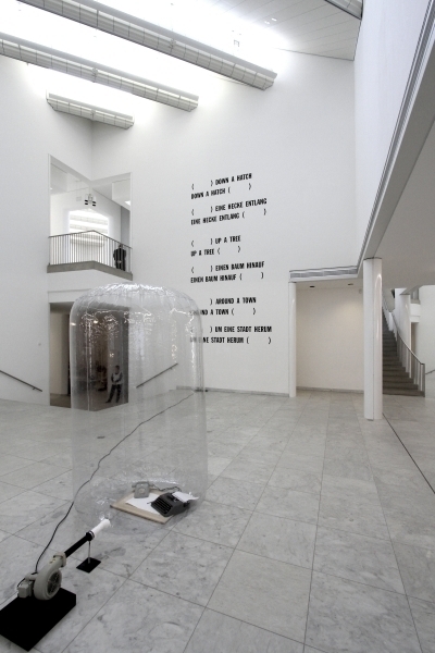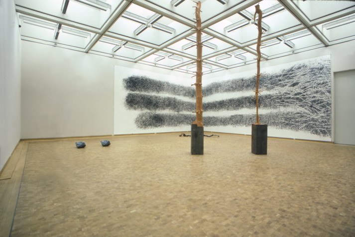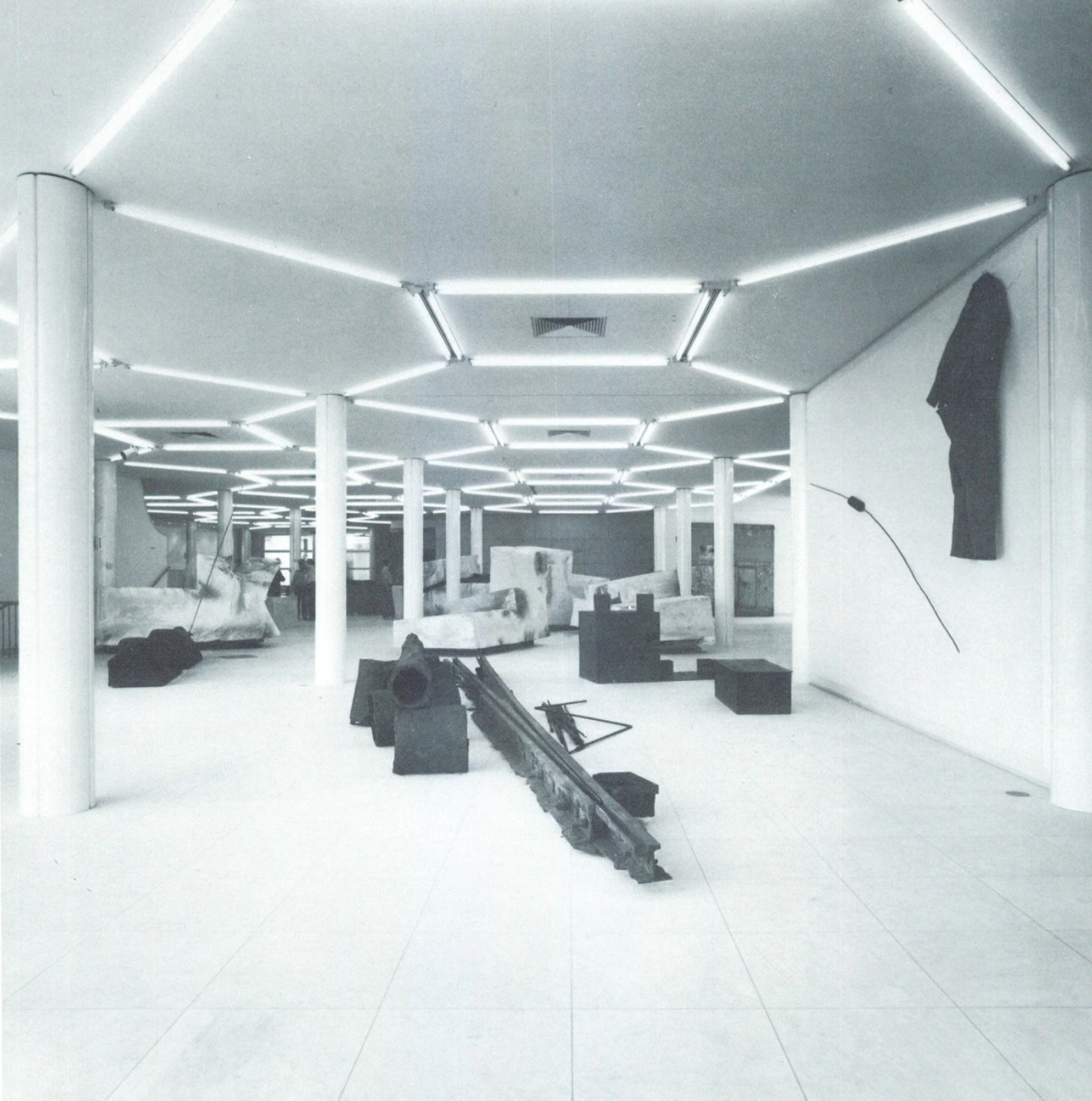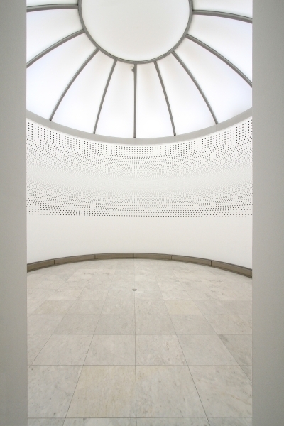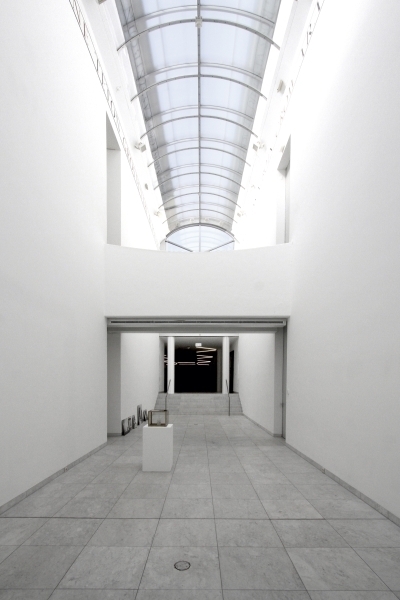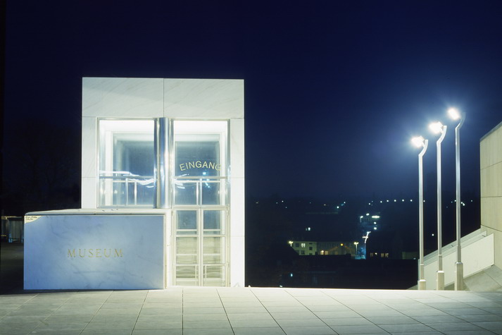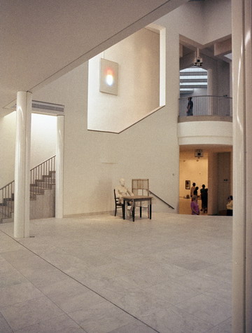 Although designing a museum is always challenging, it is perhaps less onerous when, in contrast to those encyclopedic institutions that are in continual flux, its holdings consist of a focused group of works. Kahn found such a golden opportunity in the Kimbell Museum, and Hollein has exploited the similar possibilities here, where he worked closely with the director, Jonathan Cladders, in formulating the program. They believe that today the museum itself represents a Gesamtkunstwerk (total work of art), “a huge scenario into which the individual work is fitted…not the autonomy of the work at any price but the deliberately staged correspondence between space and work of art” . This especially applies to contemporary art, which frequently is deliberately produced for a museum setting. The plan that Hollein and Cladders evolved is without precedent for this building type. None of the customary tropes, whether conventional or modern—vaulted galleries arranged symmetrically, the universal space, the proverbial white cube—are present. Instead, the combination of small, contained cabinets and larger rooms perfectly accommodates a collection that, although including some historical pieces, is mainly focused on the post-World War II period and, although international, is richly endowed with work by American artists of such competing movements as Minimalism, Post-Painterly Abstraction, and Pop. Many works are in the form of installations without customary boundaries or frames and do not necessarily require natural light.