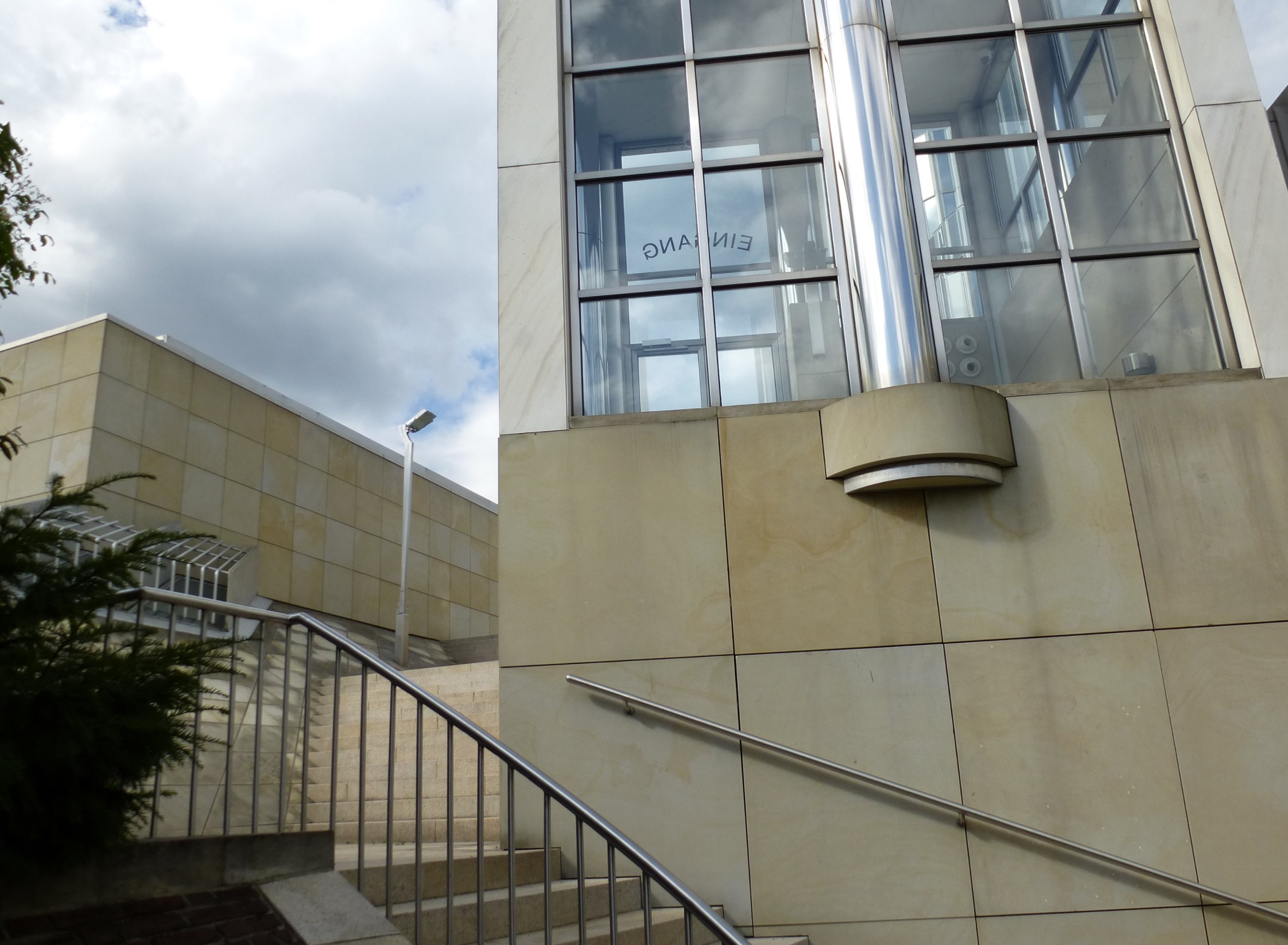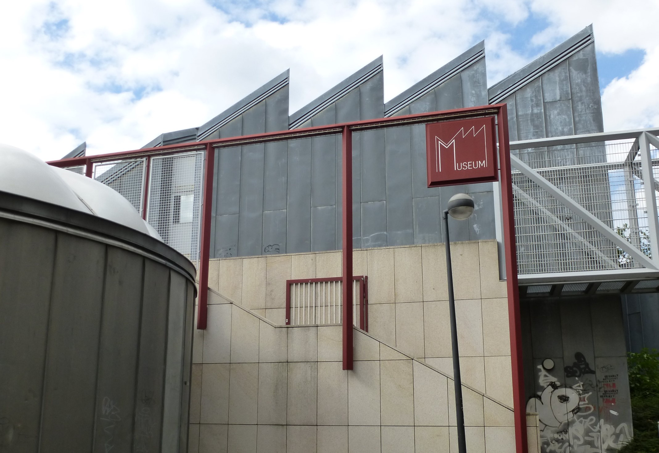 Also prescient is Hollein’s interjection of playfulness and irony into the reverence that typically pervades museum design. Although marble clads some of the surfaces, it is combined with less elevated masonry materials like brick and sandstone. Reflective as well as transparent glass appears; zinc is placed beside chromium and steel. One side of the temple-like pavilion that forms the main entrance sports graffiti in red paint, matching the color of some of the railings. Exterior light fixtures have an industrial character in contrast to the lush surrounding landscape and the textured brick walls and paths. The visitor, constantly encountering the unpredictable, is sensitized to the daring originality of the art displayed.