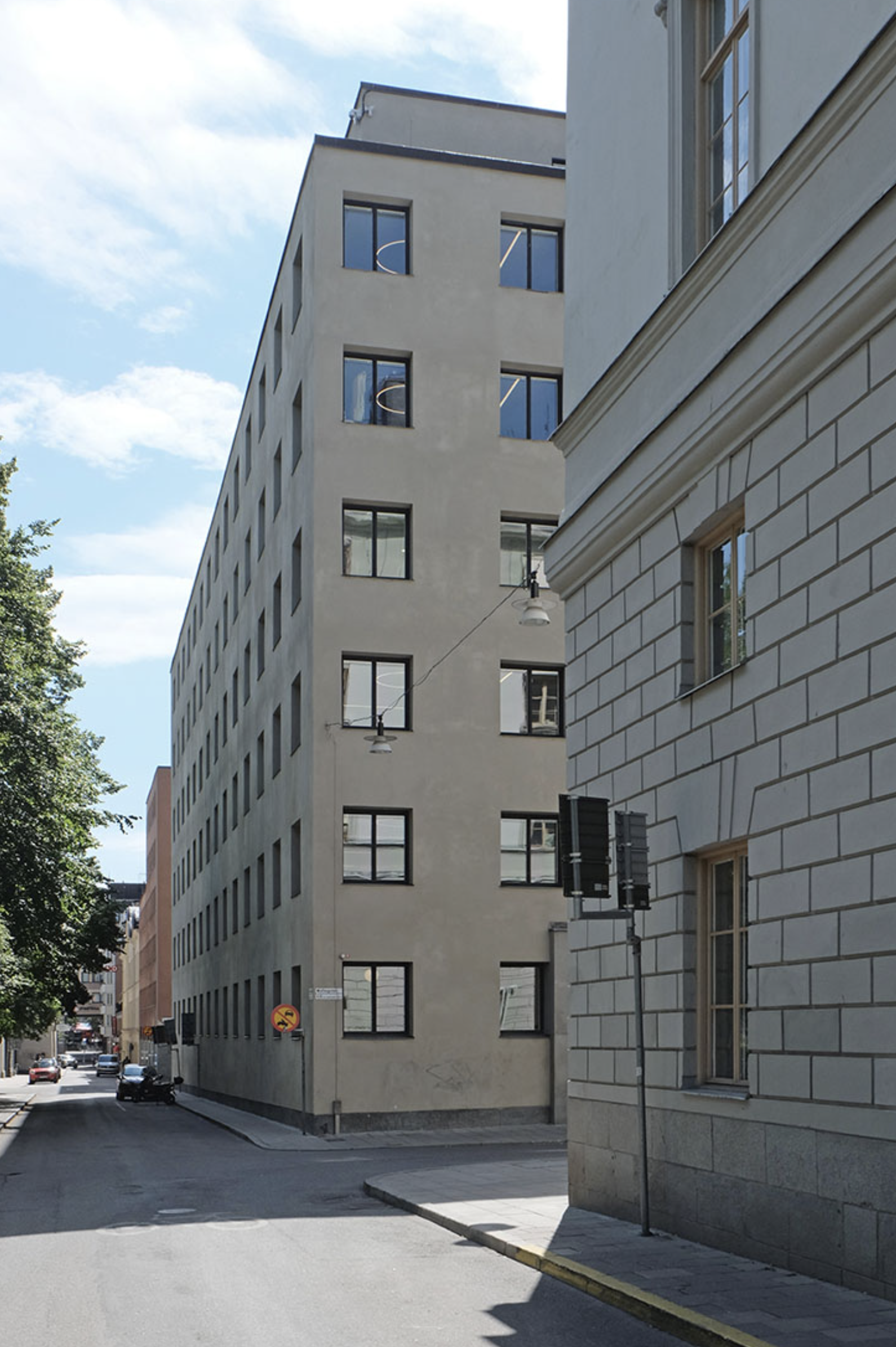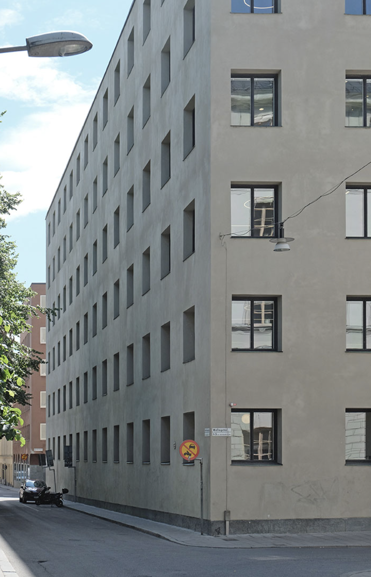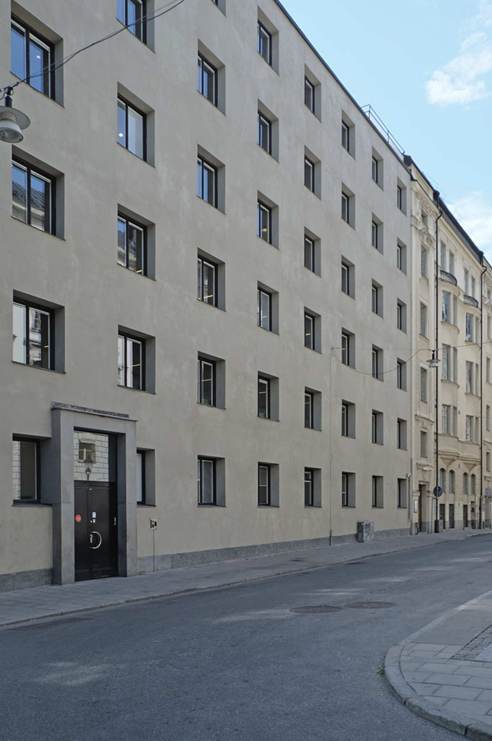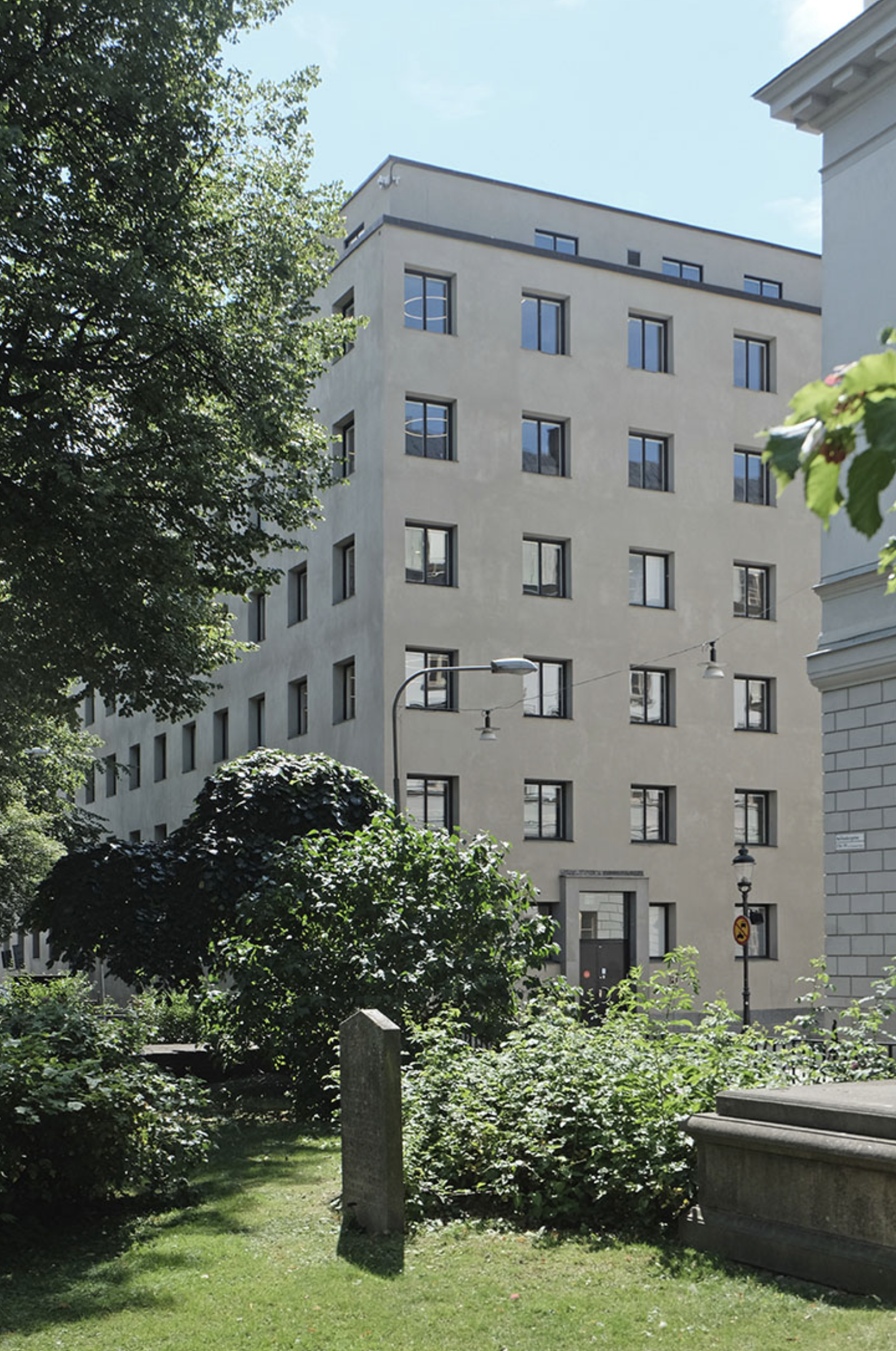 Lewerentz’ winning proposal was a further elaboration of sketches from 1928. The main entrance was on the quiet Wallingatan, which acted as a sort of forecourt. The building was set on a plinth of coarsely hewn granite to a level with the embrasures of the first floor windows. Above, the facade was rendered in light stucco, terminating in a cornice of finely hewn granite. The sloped portions of the roof were clad in copper.