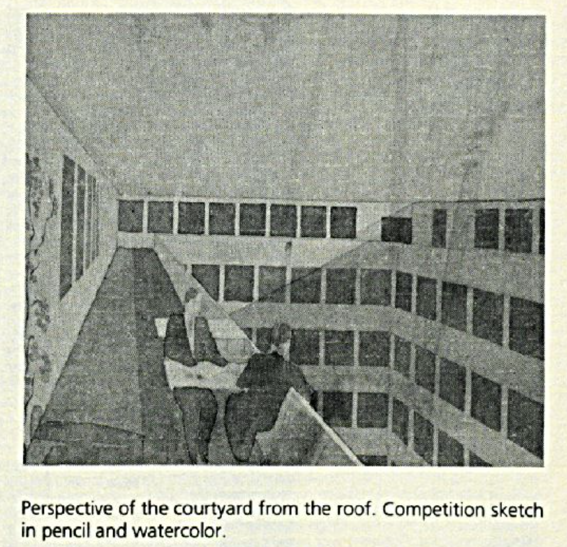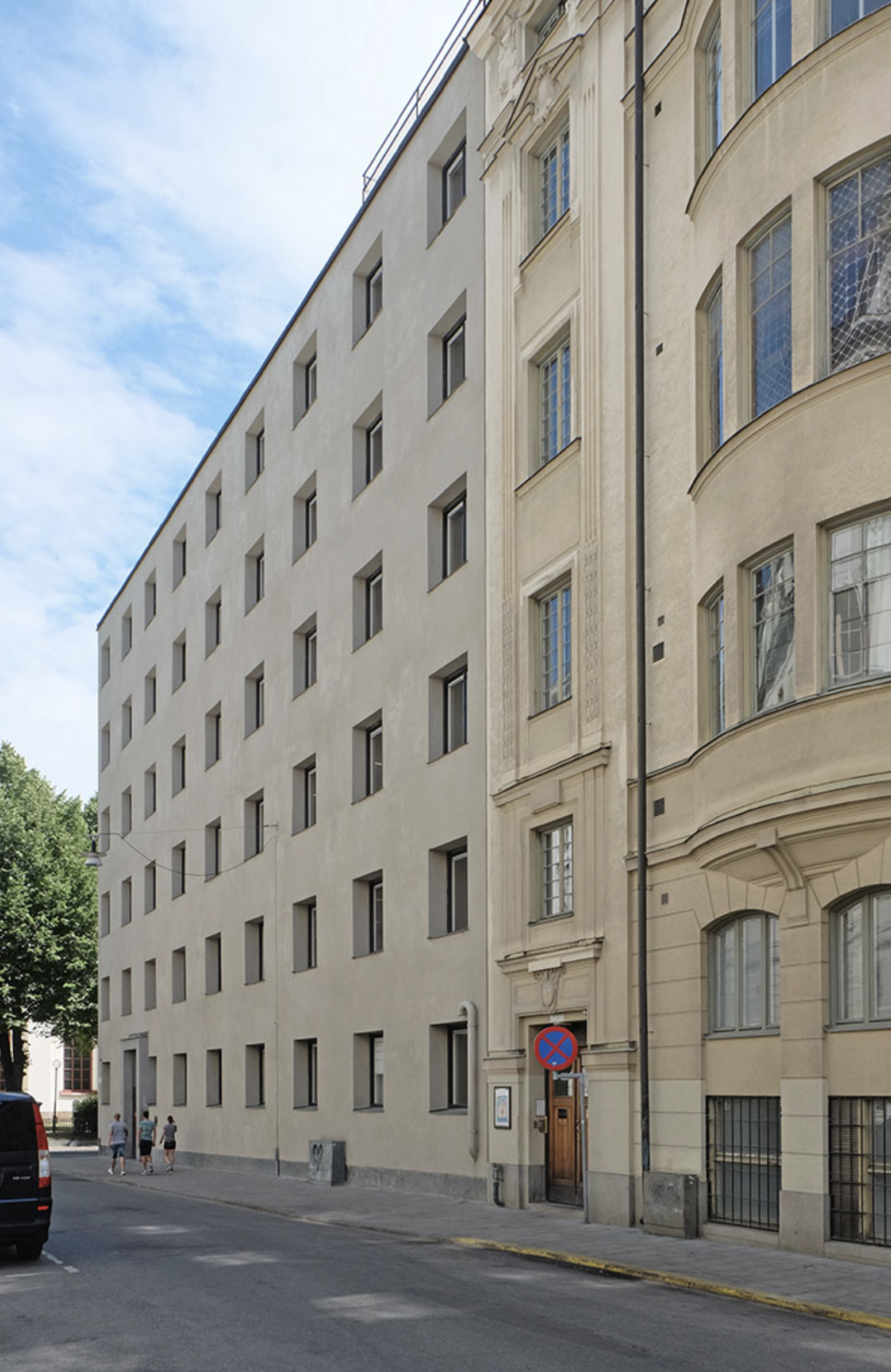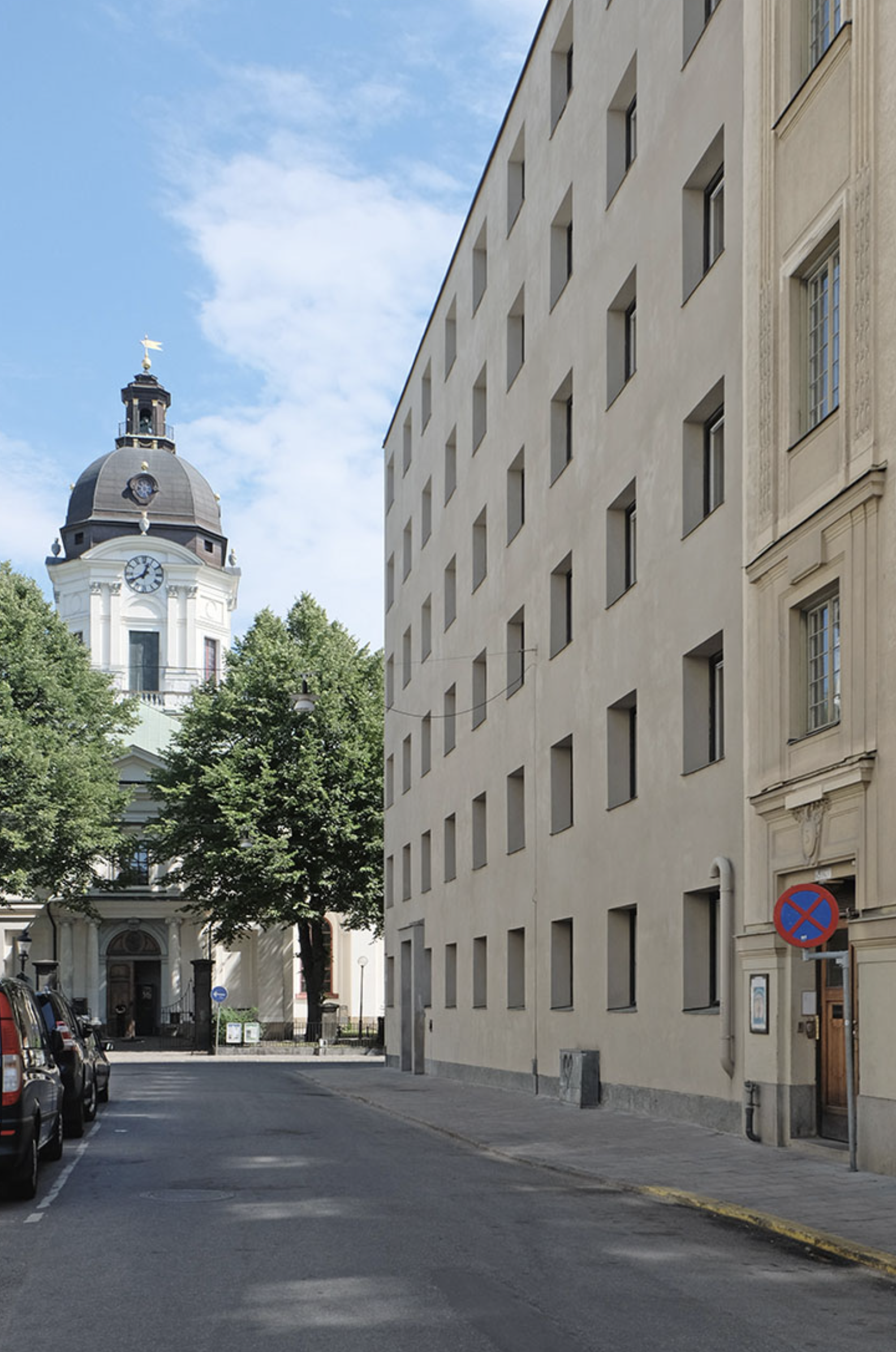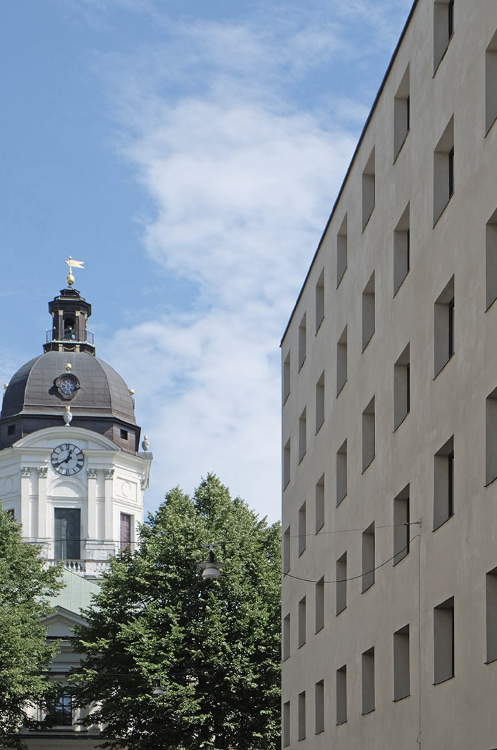 Lewerentz’ winning proposal was a further elaboration of sketches from 1928. The main entrance was on the quiet Wallingatan, which acted as a sort of forecourt. The building was set on a plinth of coarsely hewn granite to a level with the embrasures of the first floor windows. Above, the facade was rendered in light stucco, terminating in a cornice of finely hewn granite. The sloped portions of the roof were clad in copper.
