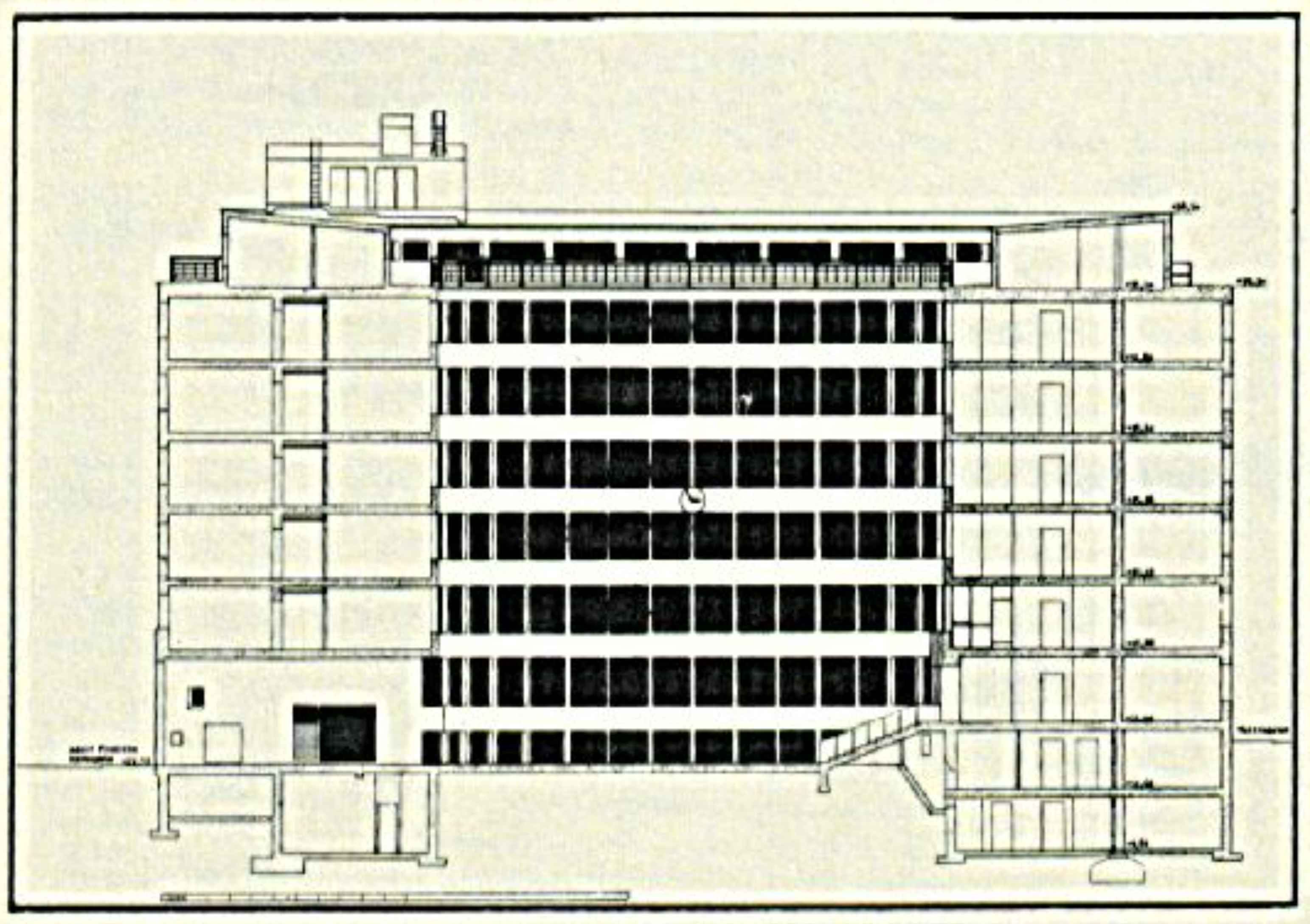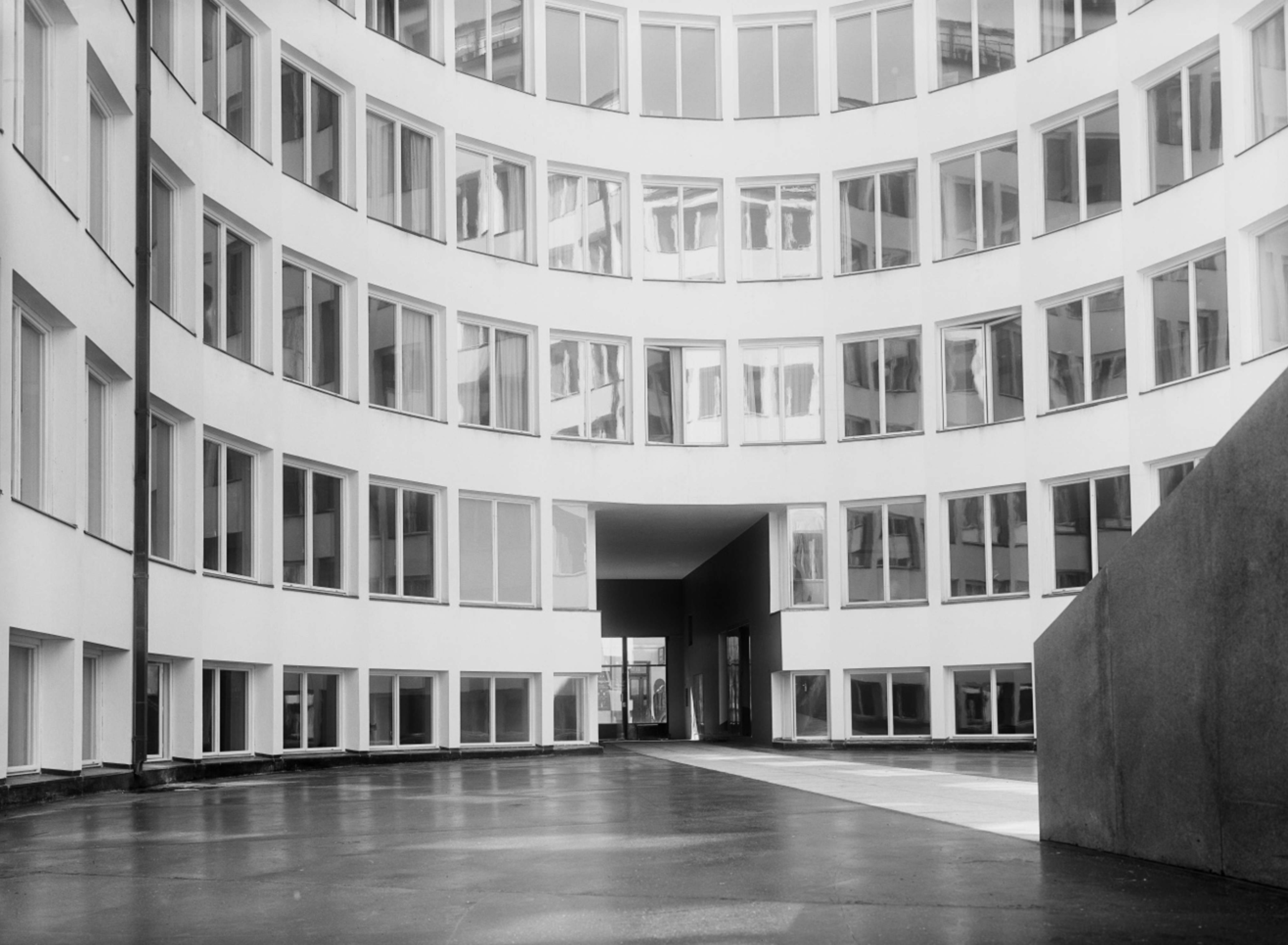 The building was at first to be of a steel frame construction with curtain walls in reinforced concrete. For reasons of economy, only the courtyard was constructed in this manner, while the street facades were of a more traditional construction.