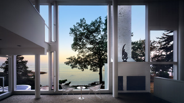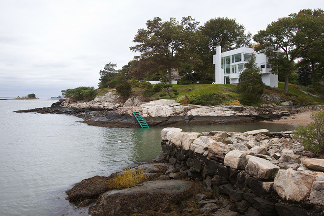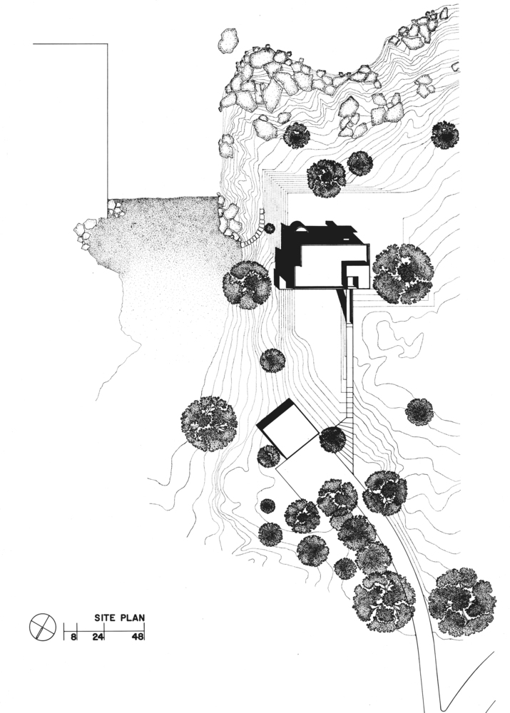 The Smith House, built amidst the rocks and trees of a one-and-a-half-acre site, overlooks Long Island Sound from the Connecticut coast. A dense cluster of evergreens stands at the entrance to the property. Behind, the land clears and rises to the center of the site, then drops sharply to the rocky shoreline and a small, sandy cove.