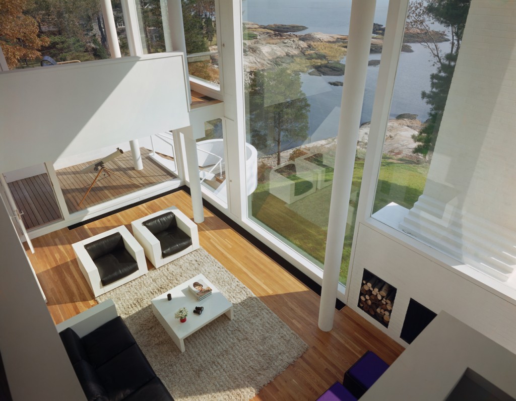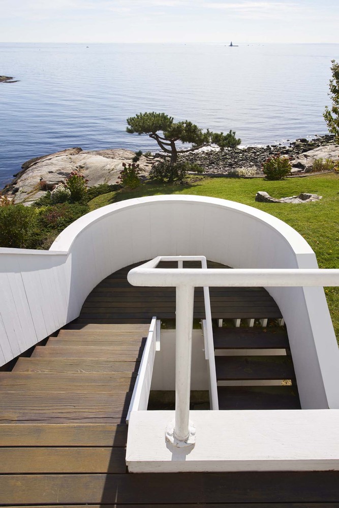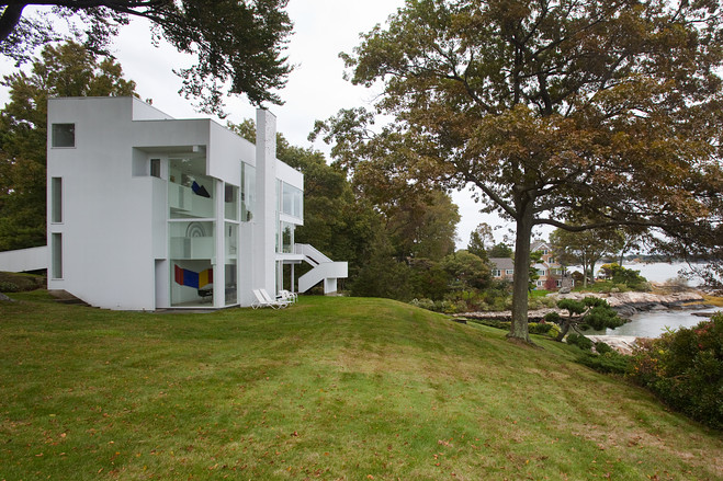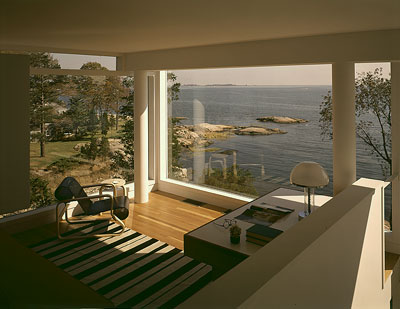 Meier: The site slopes down to the water, so it seemed to make sense to enter at the middle level, and then go down or up. It also enabled us to have the living room elevated, to take advantage of the view and to have the public spaces on the water side and bedroom spaces on the entry side. You enter through the private spaces into the public spaces, rather than the other way around.