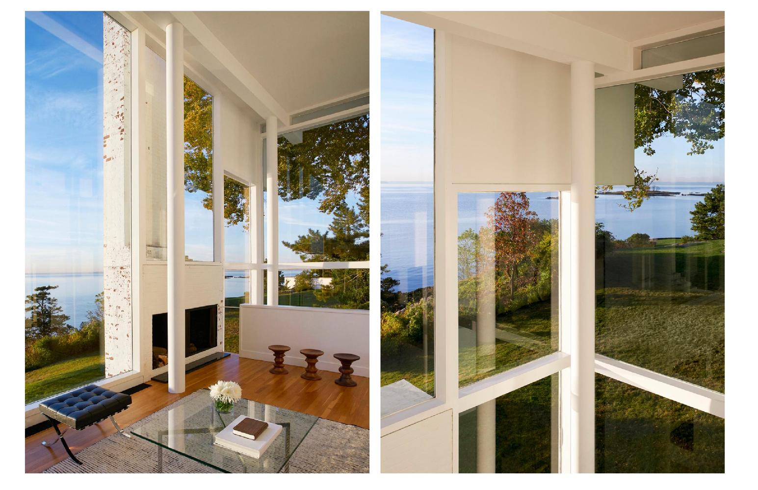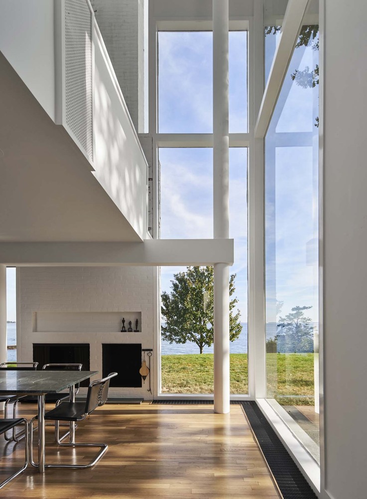 The dramatic view of sea and sky that greets one upon entering is framed and intensified in the transparent skin of the rear façade. Placed directly opposite the entry, a painted brick fireplace pushes to the outside through the tight frame of mullions. Suspended between the chimney and the steel structural columns, the glazed wall creates a subtle tension that draws the occupant across the living space to the outside. The balustrades of the lower and upper levels are set back from the glass, amplifying that tension.