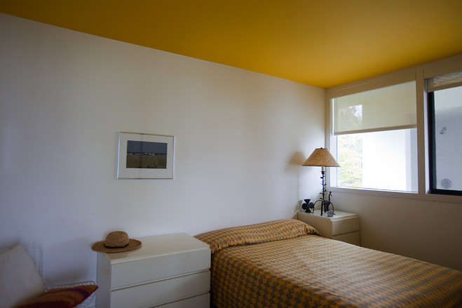 Part of the program was to have a fireplace in the living room. We didn’t want it directly in the middle. The fireplace, in fact, is on [an] axis with the entry. When you enter, you either look to the left or to the right—the fireplace is on the foreground of the space. One of the problems we had—and still have—is keeping the paint on it.