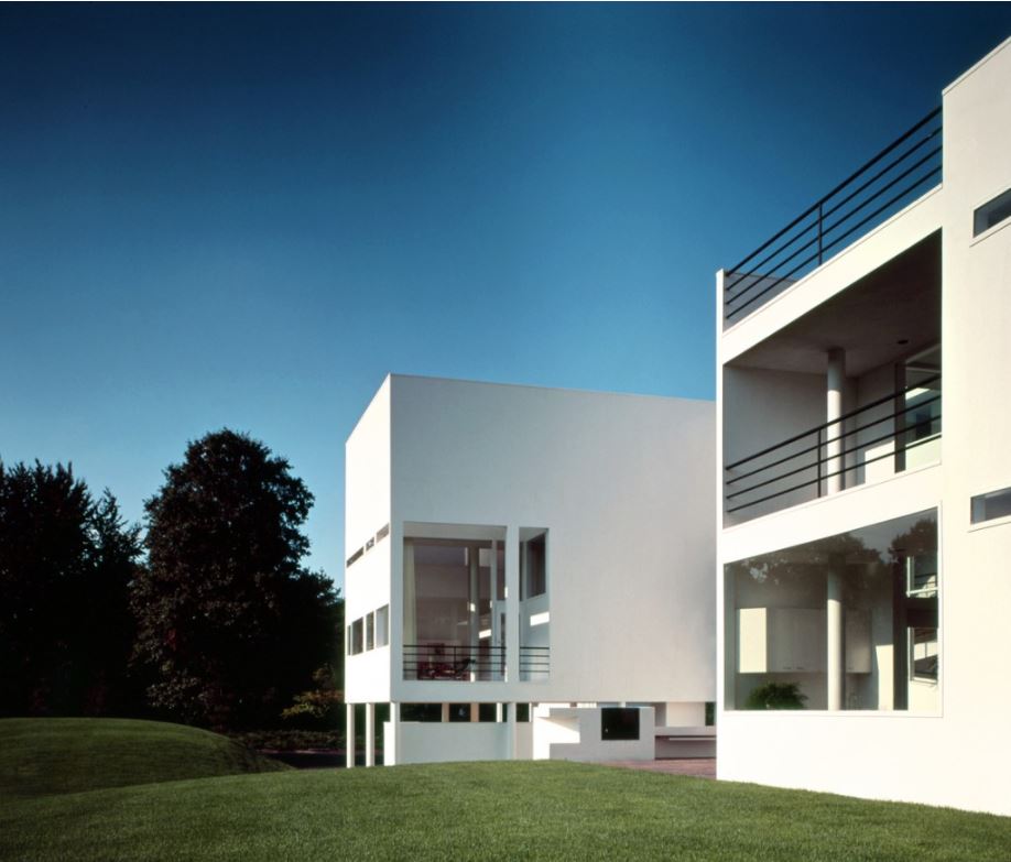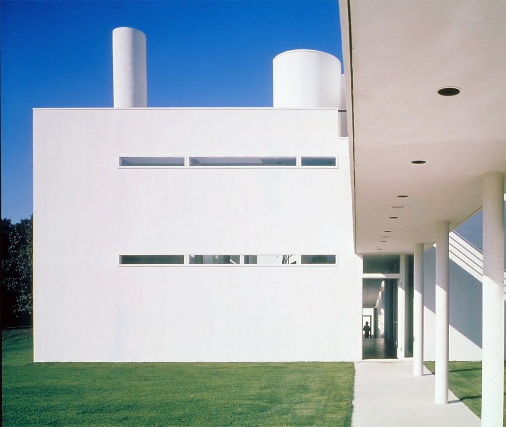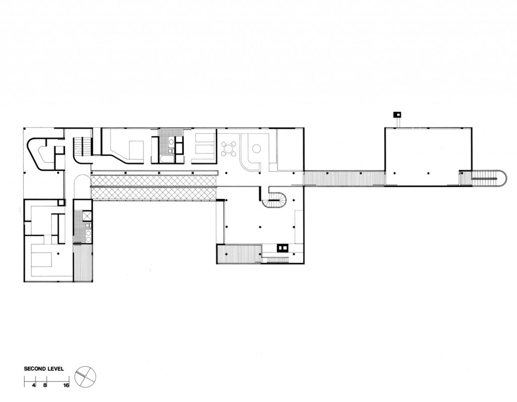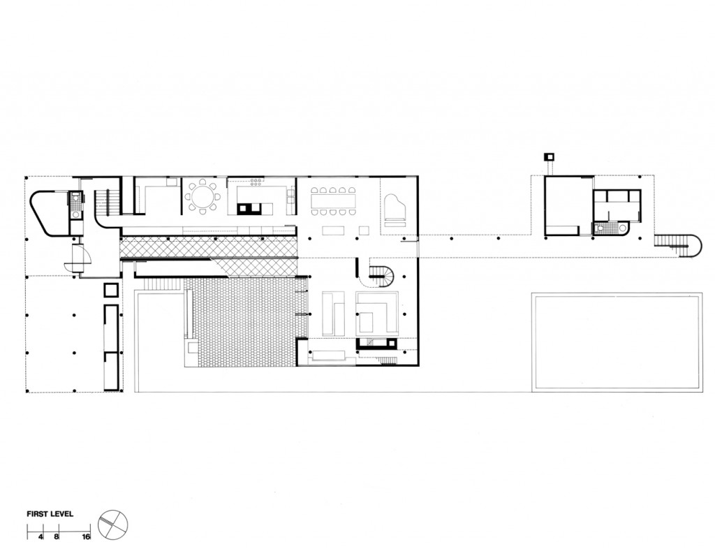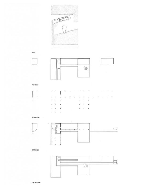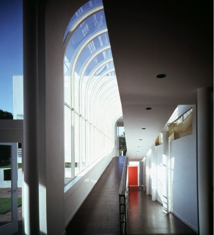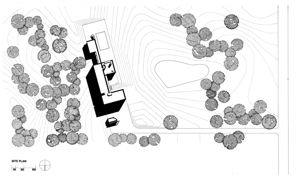 The circulation system became the major organizing element in the design. A freestanding steel column, adjacent to a small gatehouse, is a signpost indicating the beginning of pedestrian movement. From here, the front façade screens the bulk of the house from view, while a glazed cutout around the doorway allows a glimpse through the house along the axis of the circulation spine.