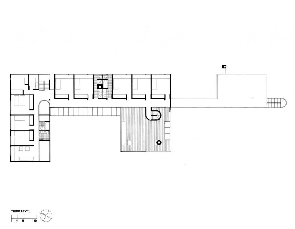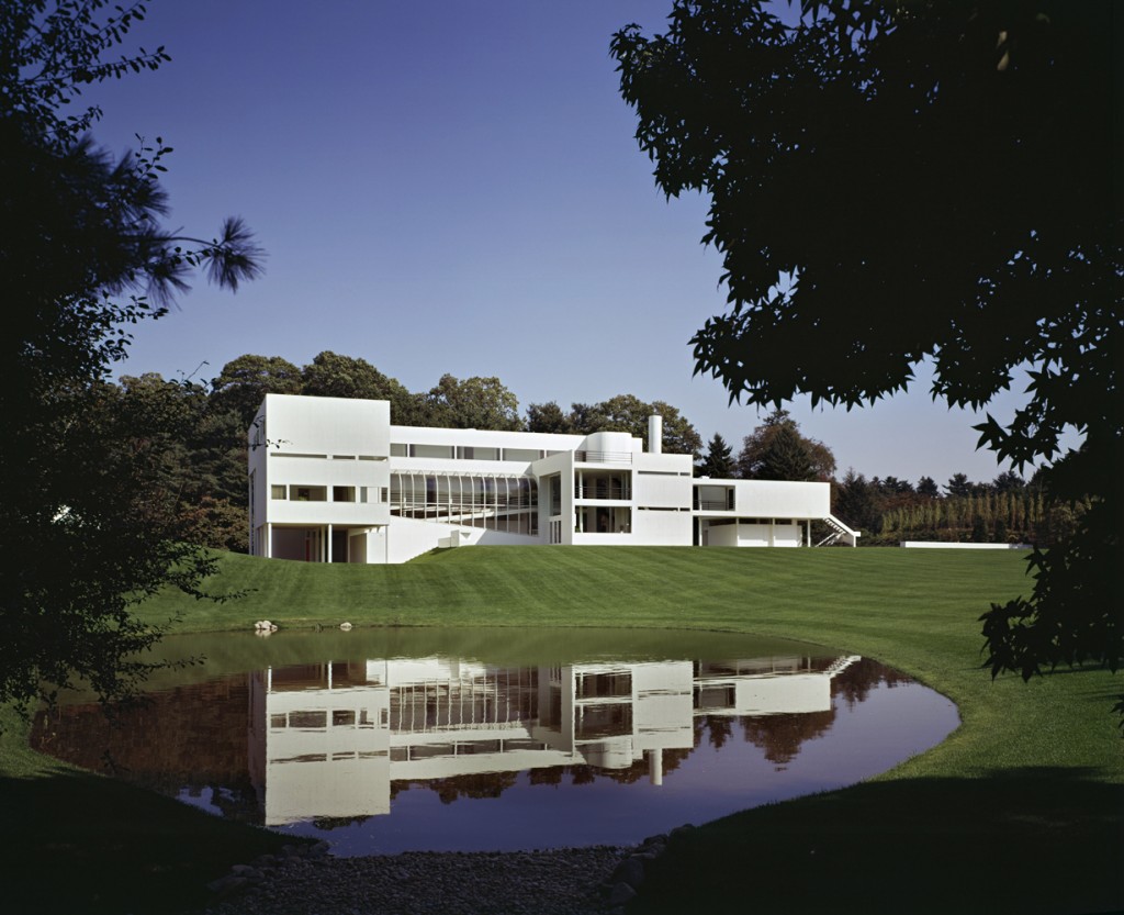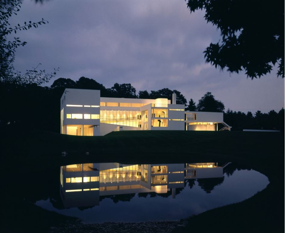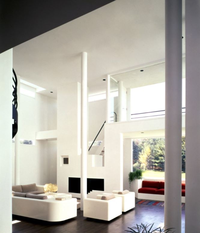 Although only an hour’s drive from New York City, the Long Island site of this house is secluded and rural, situated at the top of a meadow deep into the wooded property. The land slopes gently down across the meadow to a pond on the western edge of the site, and through the dense barrier of trees to the public road beyond. The house is oriented to allow morning sunlight into the bedrooms, and to provide a pastoral view across the landscape. Invisible from the road, the house is approached obliquely via a driveway. The program for this house, for a family with six children, included an unusually large number of bedrooms and bathrooms. At the same time, the design required a clearly defined relationship of public to private space.