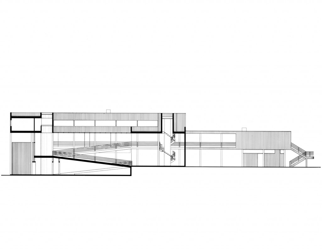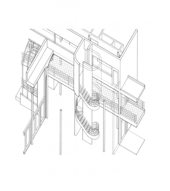 This spine finds expression in a ramp that unfolds into the upper levels of the house. A third-floor skylight admits a column of natural light that bisects the axis of the circulation spine. This motif establishes a theme of light infiltration from various directions. |