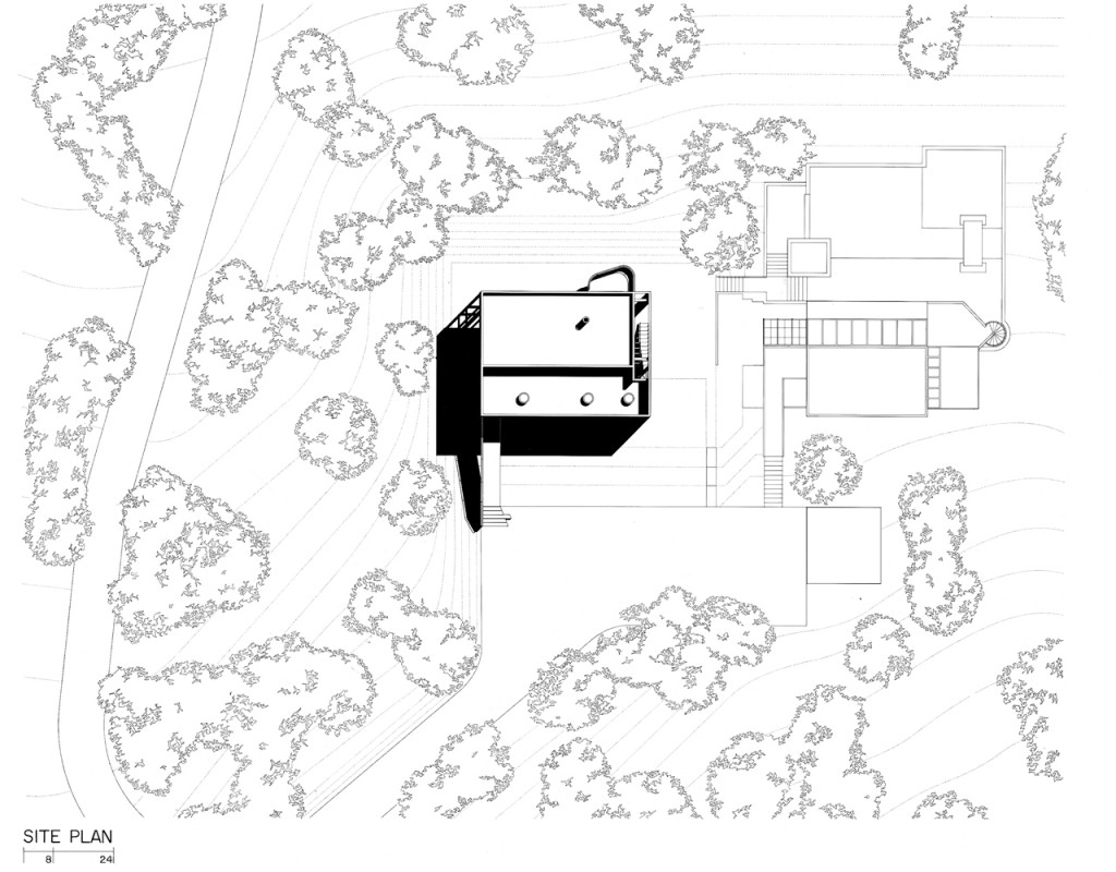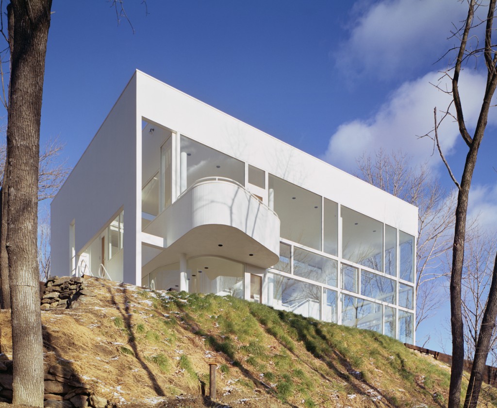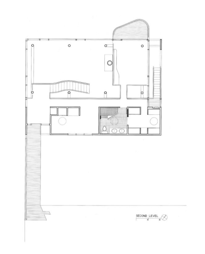 As in earlier house designs, the formal potential of a decisive separation of public and private spaces is explored again, but with some significant variations. Vertically stacked rooms and corridors, fronting a living area oriented horizontally with 180-degree views of the landscape, physically define the private sector. In plan, the entry sequence and private spaces, (the bridge, master bedroom, balcony and corridor) are oriented towards the diagonal. The entry façade is viewed obliquely from the bridge; the cantilevered sleeping area is seen from the top of the recurved staircase, across the double-height interior.