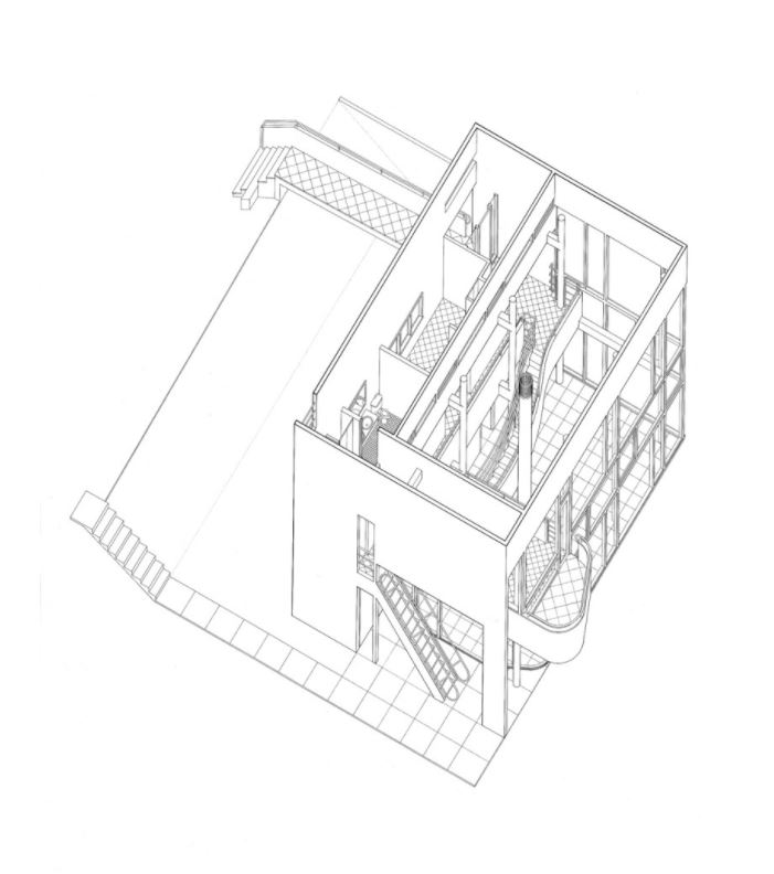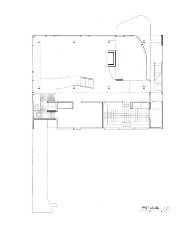 Frontality and right angles, by contrast, determine the views and approaches in the lower public spaces. The mullions of the rear façade are shifted past the structural columns, a departure from preceding houses. This shift, in concert with the opposed grids of the upper and lower levels, creates a sensation of rotation within the tightly drawn box of the house and of narrowly averted collisions between structure and surface. |