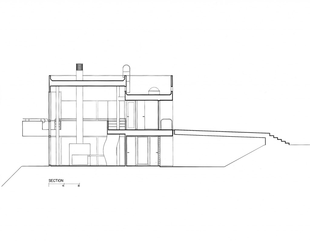 To the right of the balcony, the entry-level plane of circulation continues along a corridor serving the spaces behind the front façade to an interior bridge leading to the owners’ bedroom, an open platform that is cantilevered over the living-room space. Movement through the bedroom culminates in an exterior balcony, read as a curvilinear solid pushing through the glass wall to the exterior, where it appears to balance on a piano-curved wall of glass. An exterior stair provides direct access to the outdoor pool.