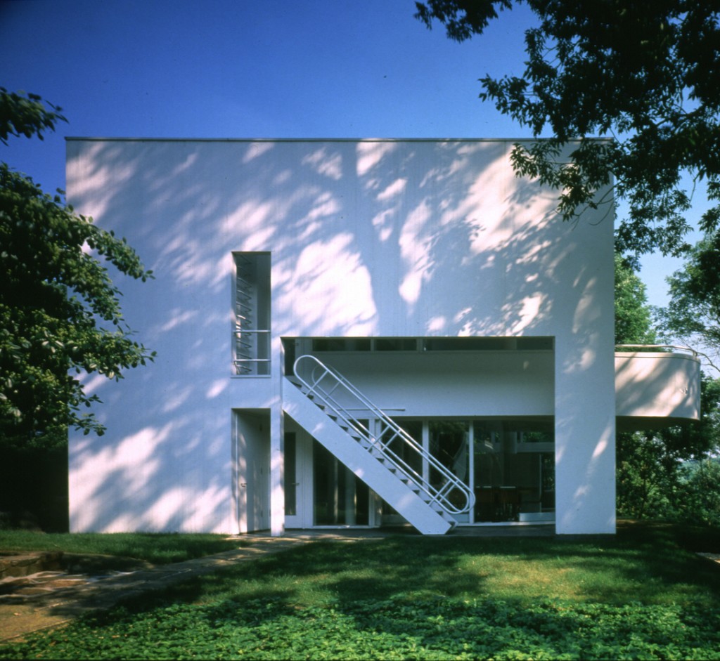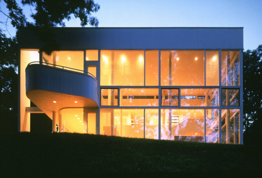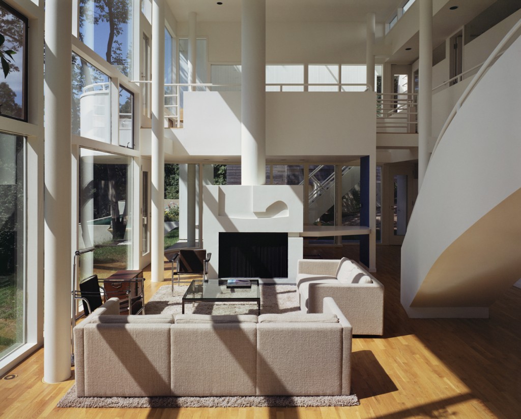 On the entry side, a bridge, which starts a half-story below grade level, emphasizes the tautness of the solid front. On axis with the entry is a balcony overlooking a two-story glazed living room and a deep view into the woods below the house. From this transitional space one can best appreciate the contrast between the house’s public and private zones: one articulated as solid, the other as void. The balcony faces onto a serpentine stair to the lower level. Curving past one of the structural columns, as if to avoid a collision, the stair weaves together the two discrete spatial parts.