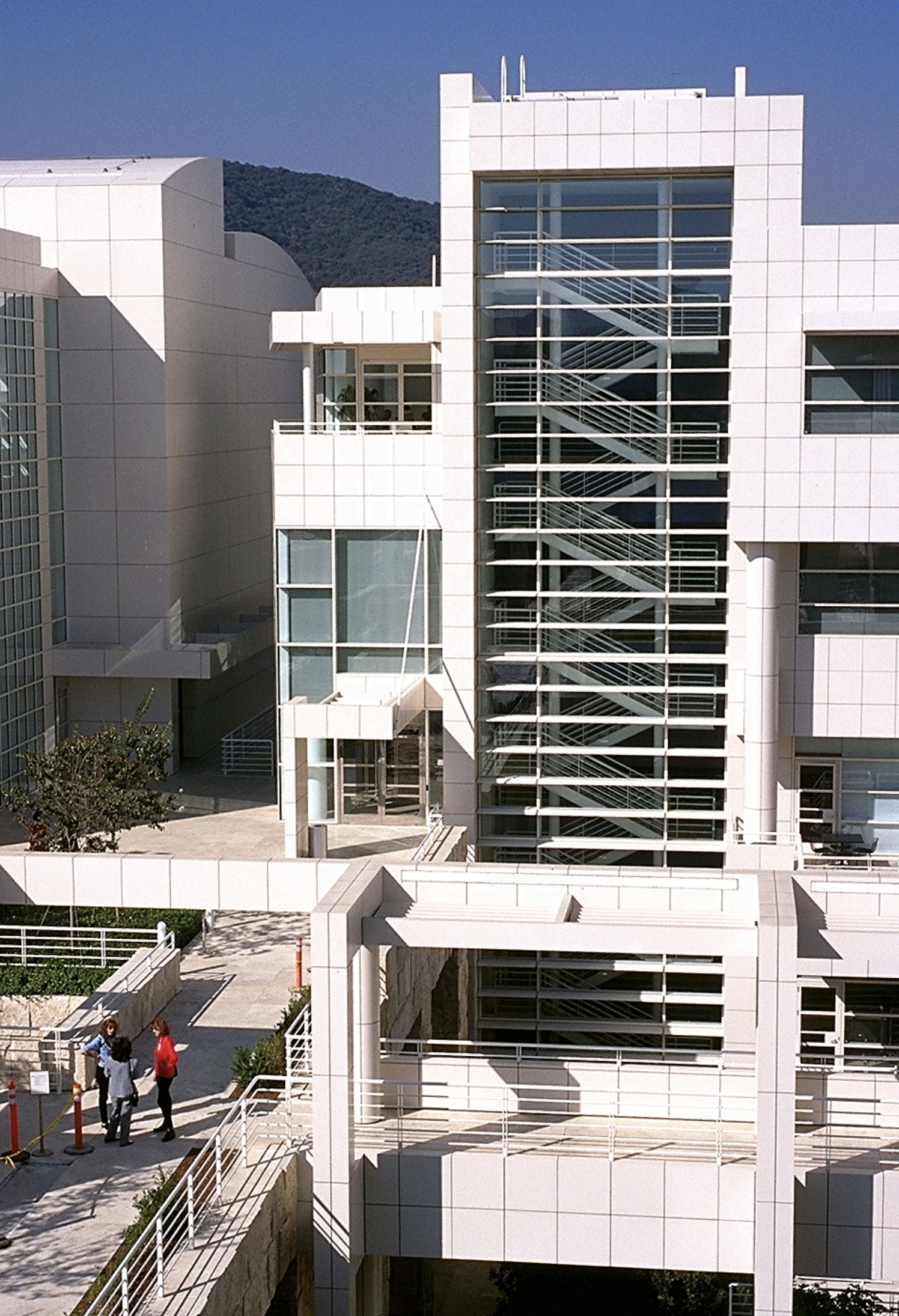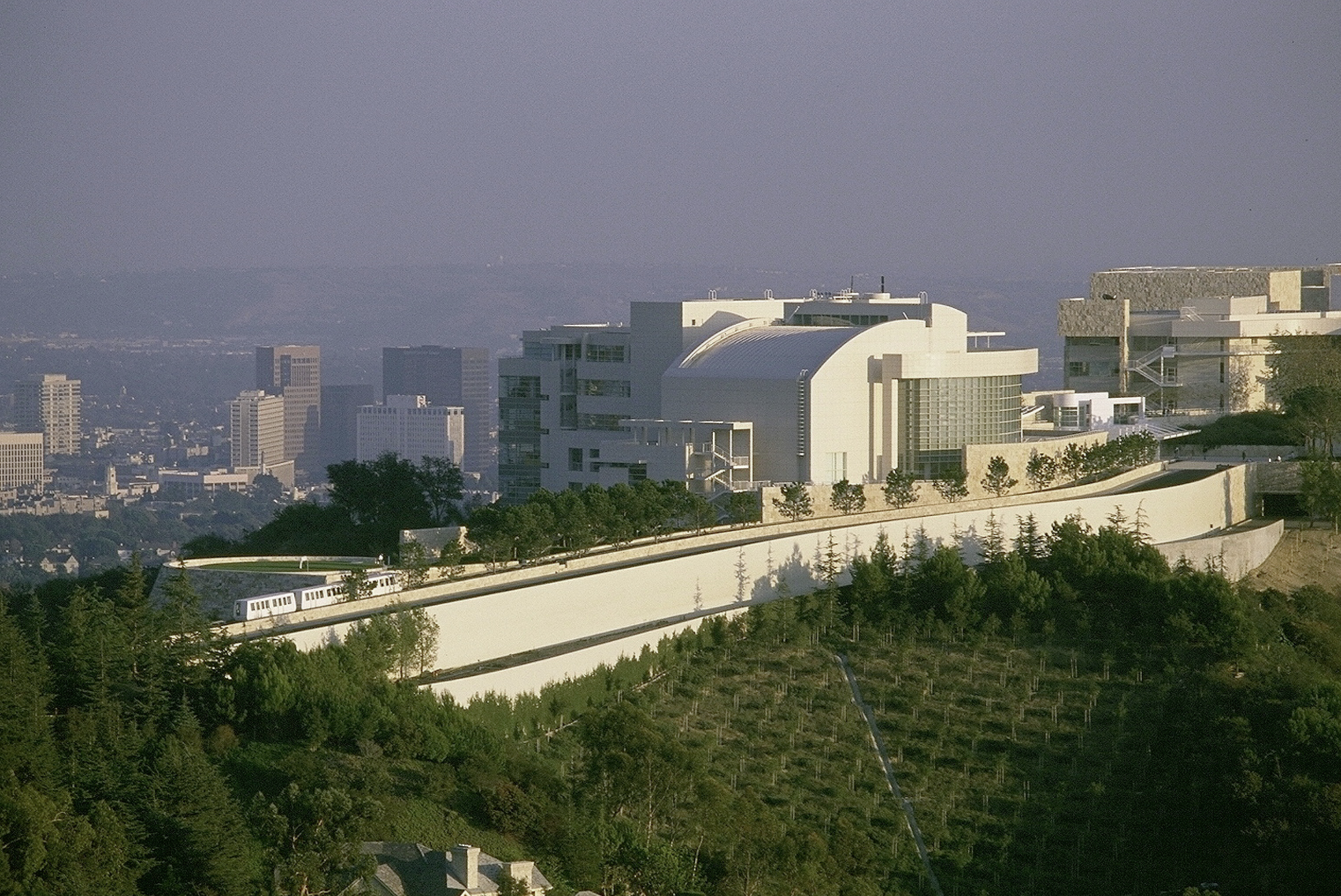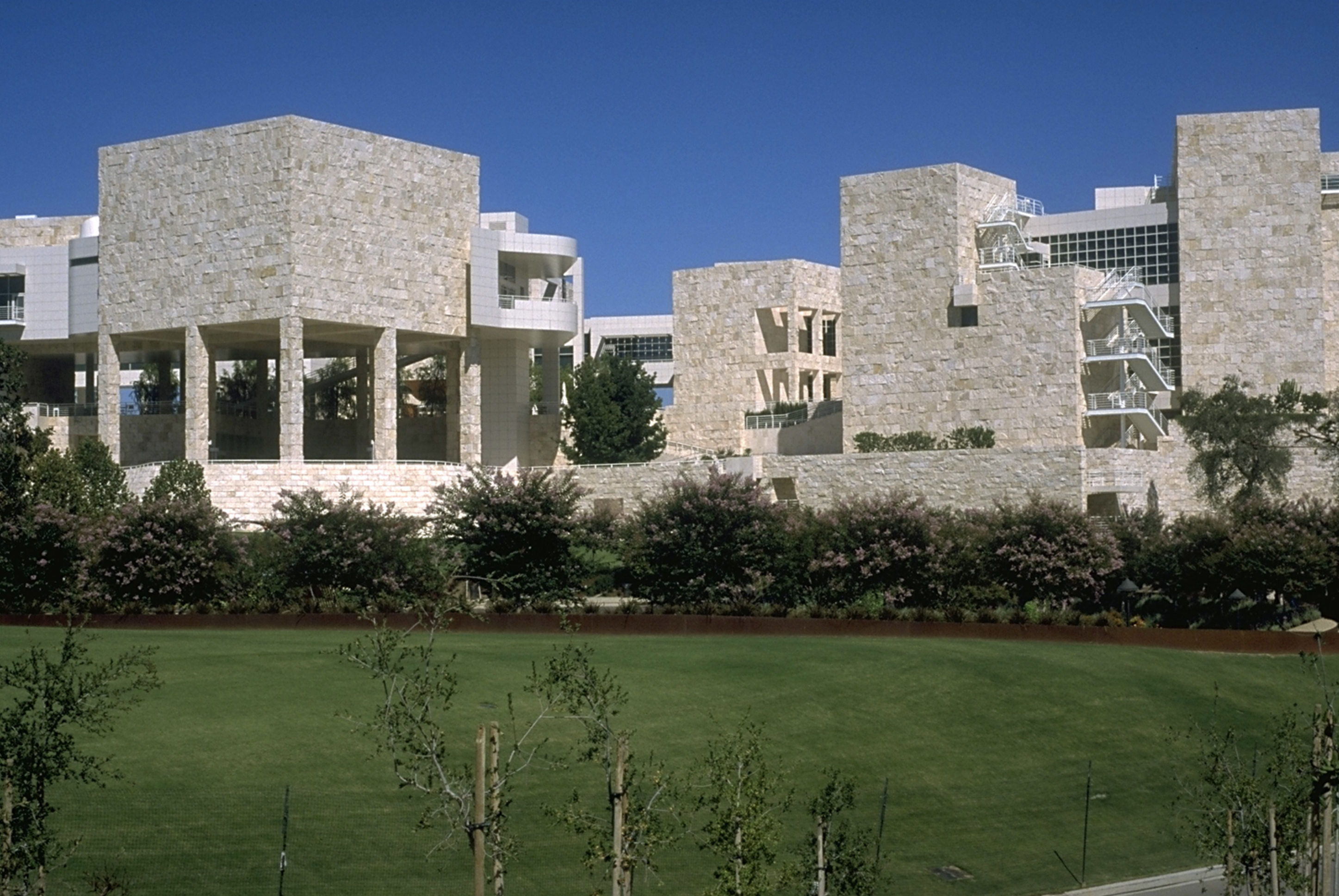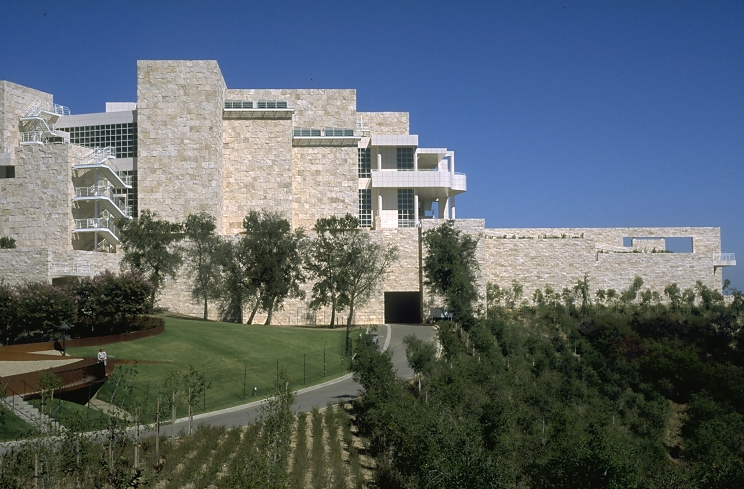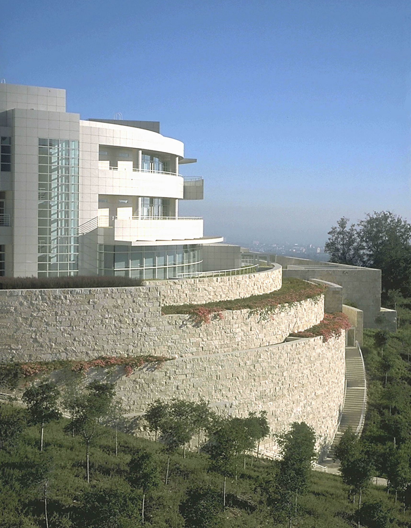 In 1982, the Getty Trust decided to build a facility to house its administrative offices and the staff of its six cultural programs. It purchased a 110-acre site at the base of the Santa Monica Mountains north of Los Angeles, California, and invited 80 architects to submit their responses to a program calling for soundly constructed buildings to serve and enhance the Getty's institutions in a scheme "appropriate to the site and responsive to its uniqueness." In addition, the Getty Trust emphasized the need to meet these objectives in a manner that would bring aesthetic pleasure to the building's occupants, visitors, and neighboring community. After interviewing the finalists, the selection committee chose the American architect Richard Meier (1934-) to formulate the design. The rugged topography of the promontory and a strict conditional-use permit enacted by a powerful neighborhood coalition placed unusual constraints on the architect, especially the restriction limiting the height of the buildings to 65 feet above the 896-foot hilltop. To meet this restriction and reduce the scale and monumentality of the project, Meier located approximately half the built work below ground with passageways connecting many of the facilities at a level of 876 feet. Above ground, he planned a campus of low buildings instead of one dominant structure and added a five-acre propylaeum (vestibule or entrance) to furnish parking and provide access to the acropolis via an electric tram.