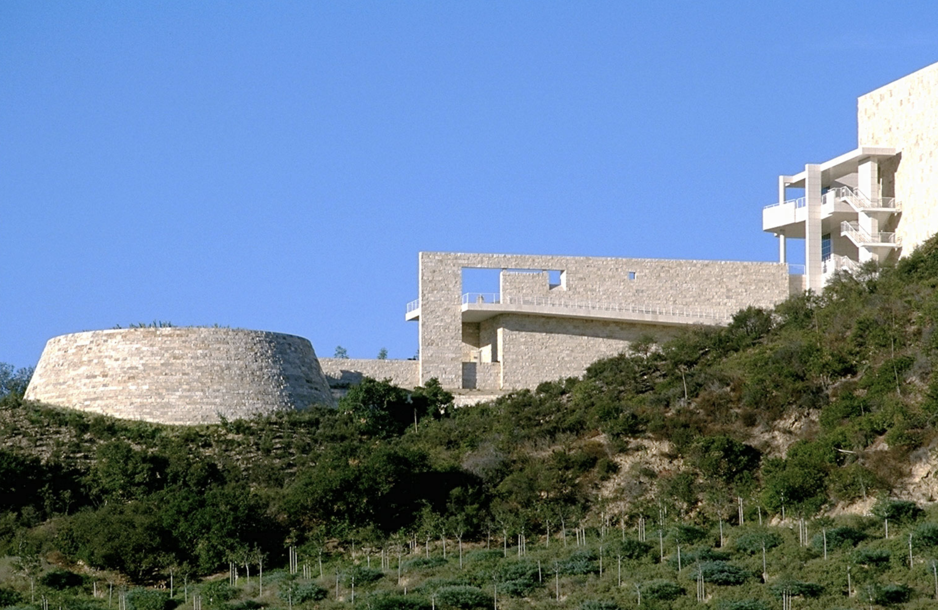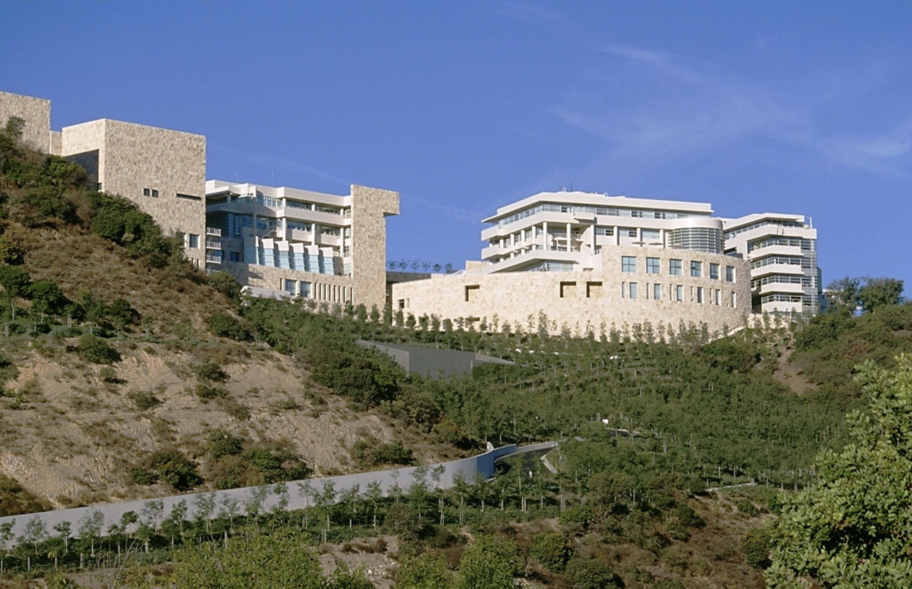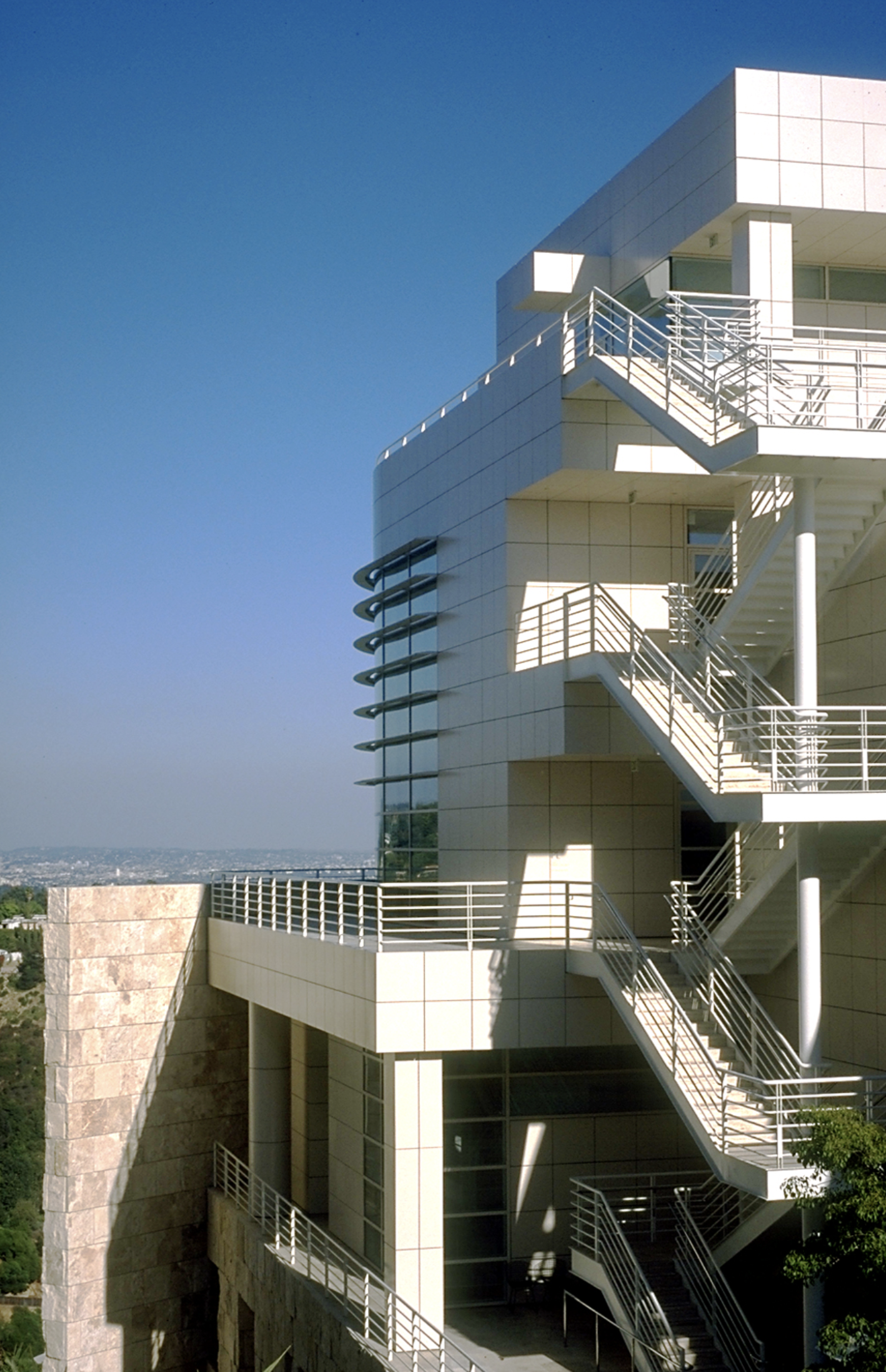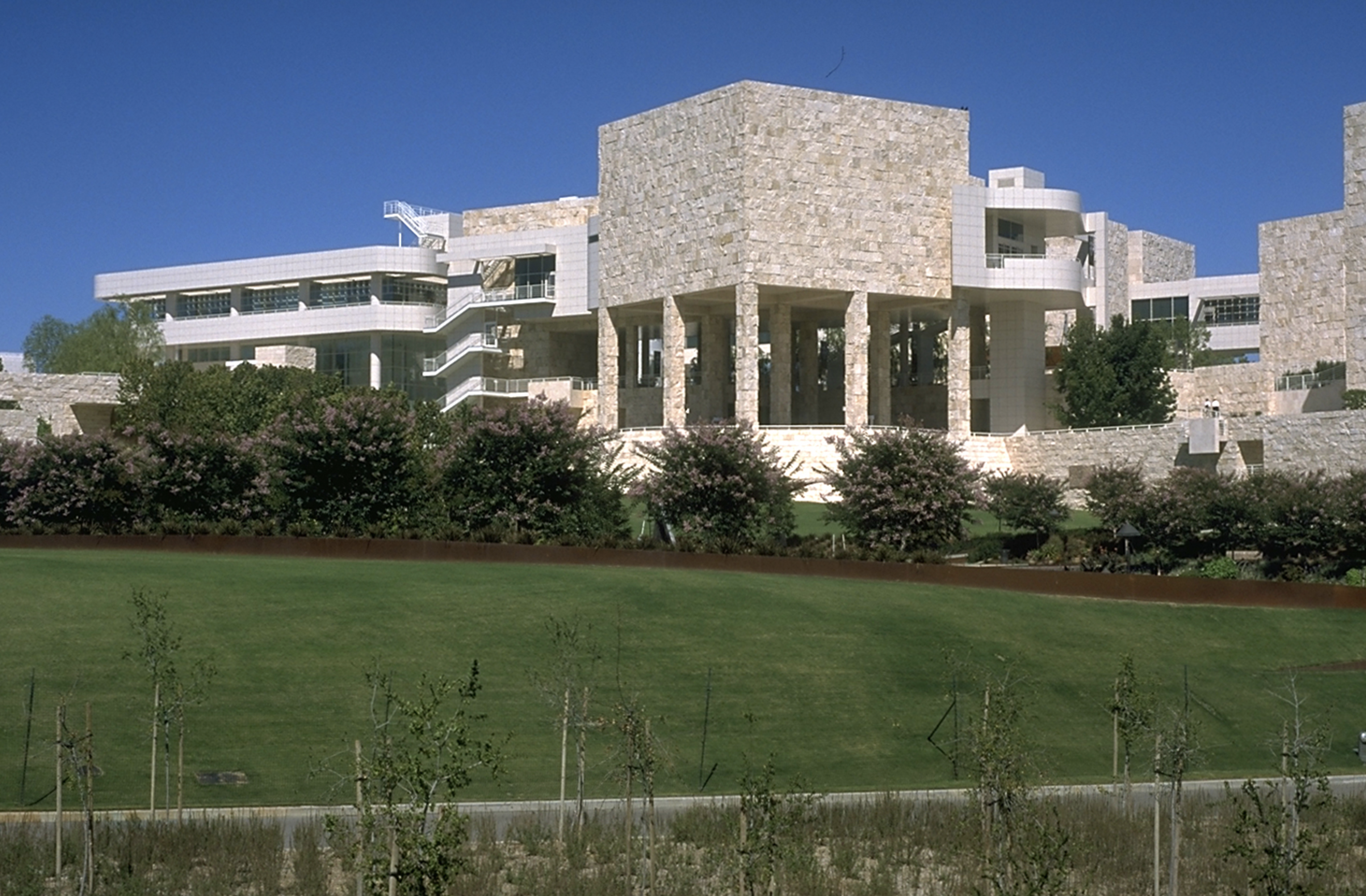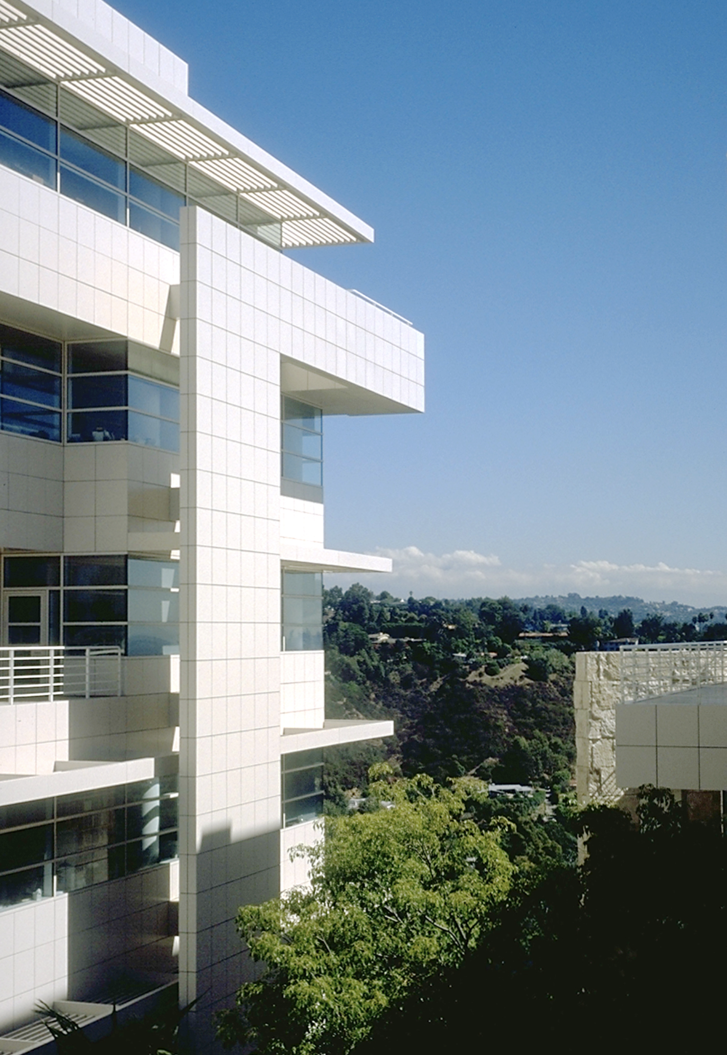 In 1982, the Getty Trust decided to build a facility to house its administrative offices and the staff of its six cultural programs. It purchased a 110-acre site at the base of the Santa Monica Mountains north of Los Angeles, California, and invited 80 architects to submit their responses to a program calling for soundly constructed buildings to serve and enhance the Getty's institutions in a scheme "appropriate to the site and responsive to its uniqueness." In addition, the Getty Trust emphasized the need to meet these objectives in a manner that would bring aesthetic pleasure to the building's occupants, visitors, and neighboring community. After interviewing the finalists, the selection committee chose the American architect Richard Meier (1934-) to formulate the design. The rugged topography of the promontory and a strict conditional-use permit enacted by a powerful neighborhood coalition placed unusual constraints on the architect, especially the restriction limiting the height of the buildings to 65 feet above the 896-foot hilltop. To meet this restriction and reduce the scale and monumentality of the project, Meier located approximately half the built work below ground with passageways connecting many of the facilities at a level of 876 feet. Above ground, he planned a campus of low buildings instead of one dominant structure and added a five-acre propylaeum (vestibule or entrance) to furnish parking and provide access to the acropolis via an electric tram.