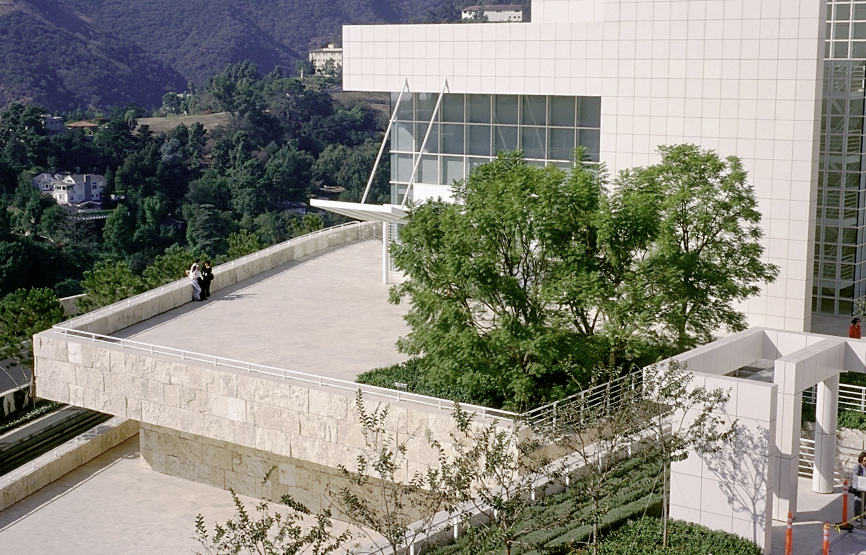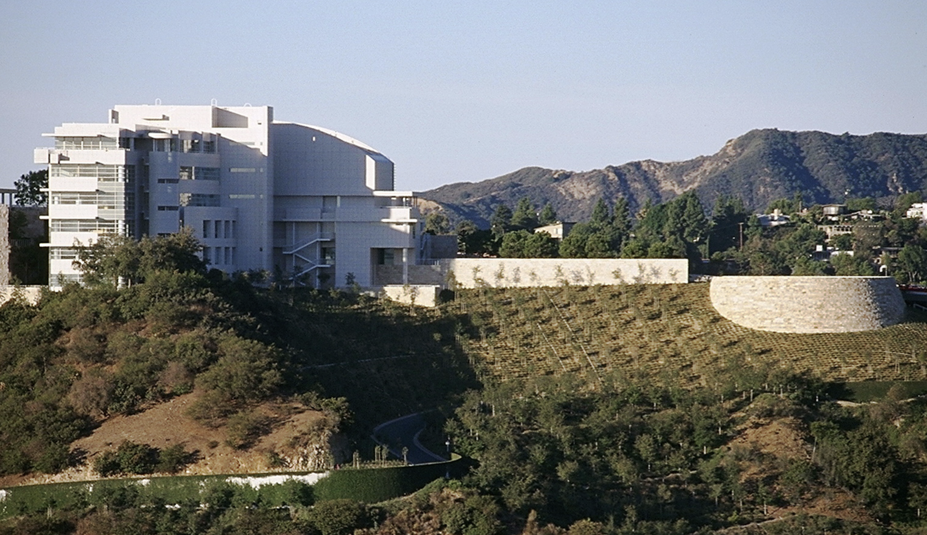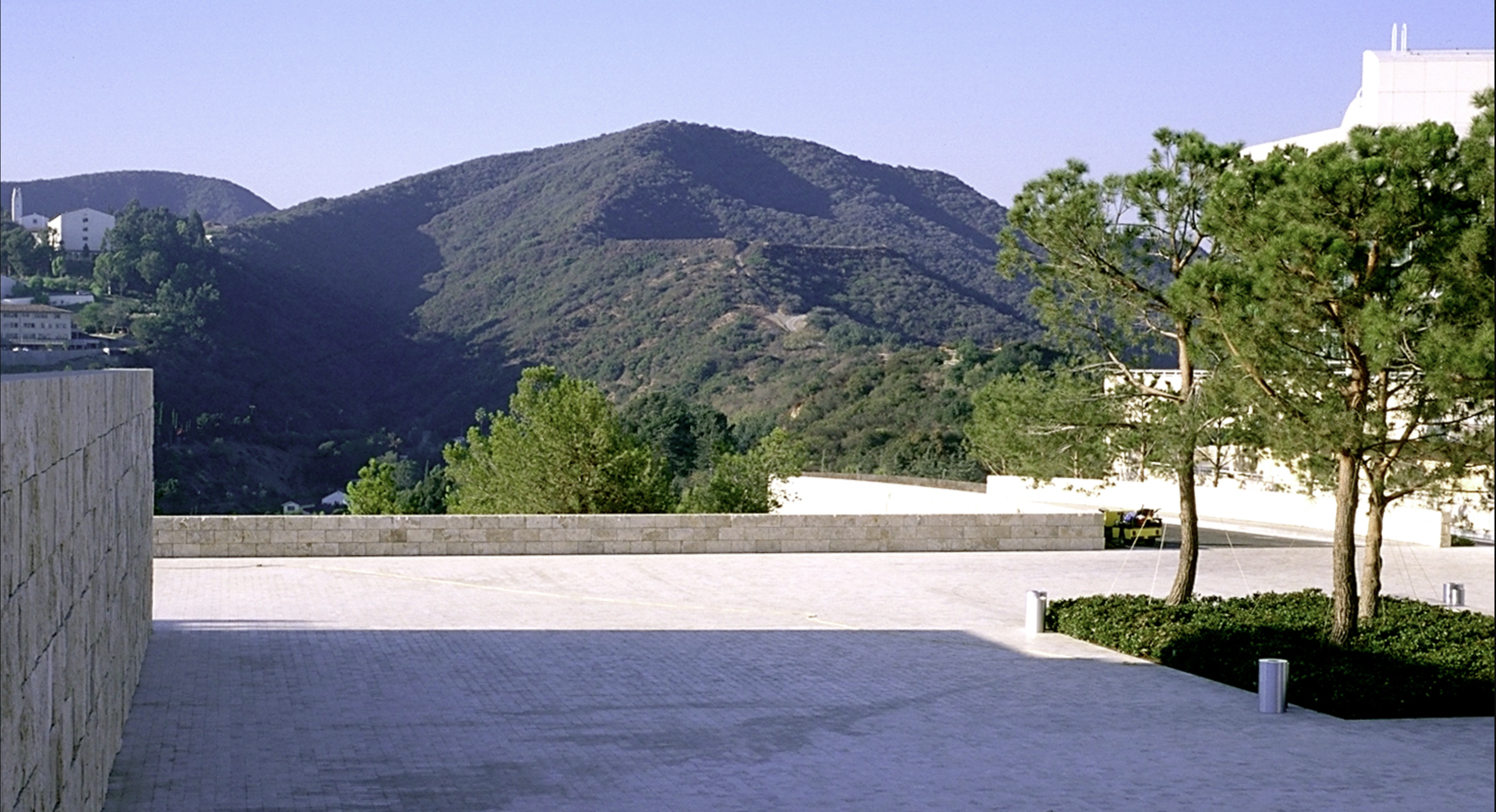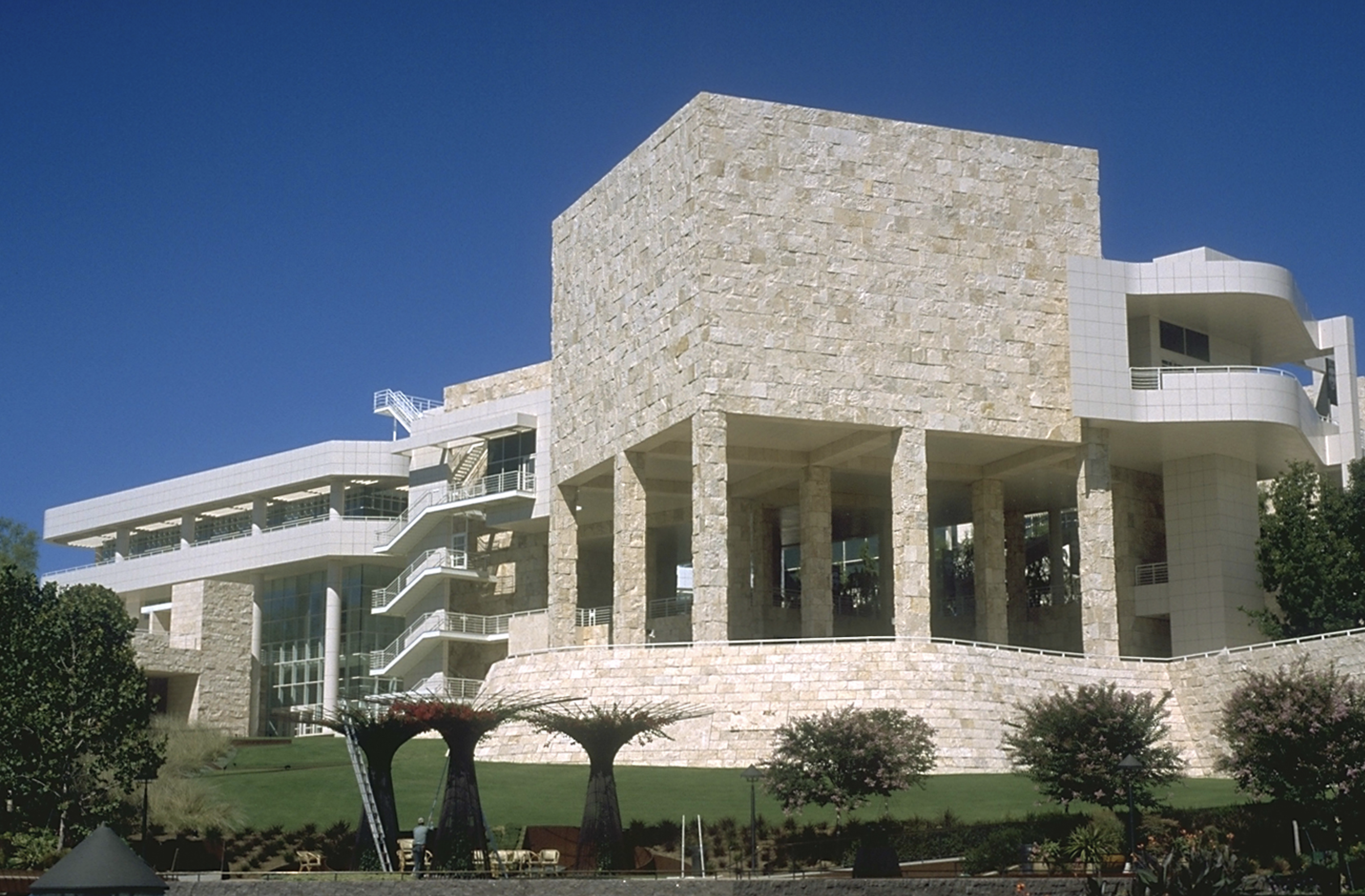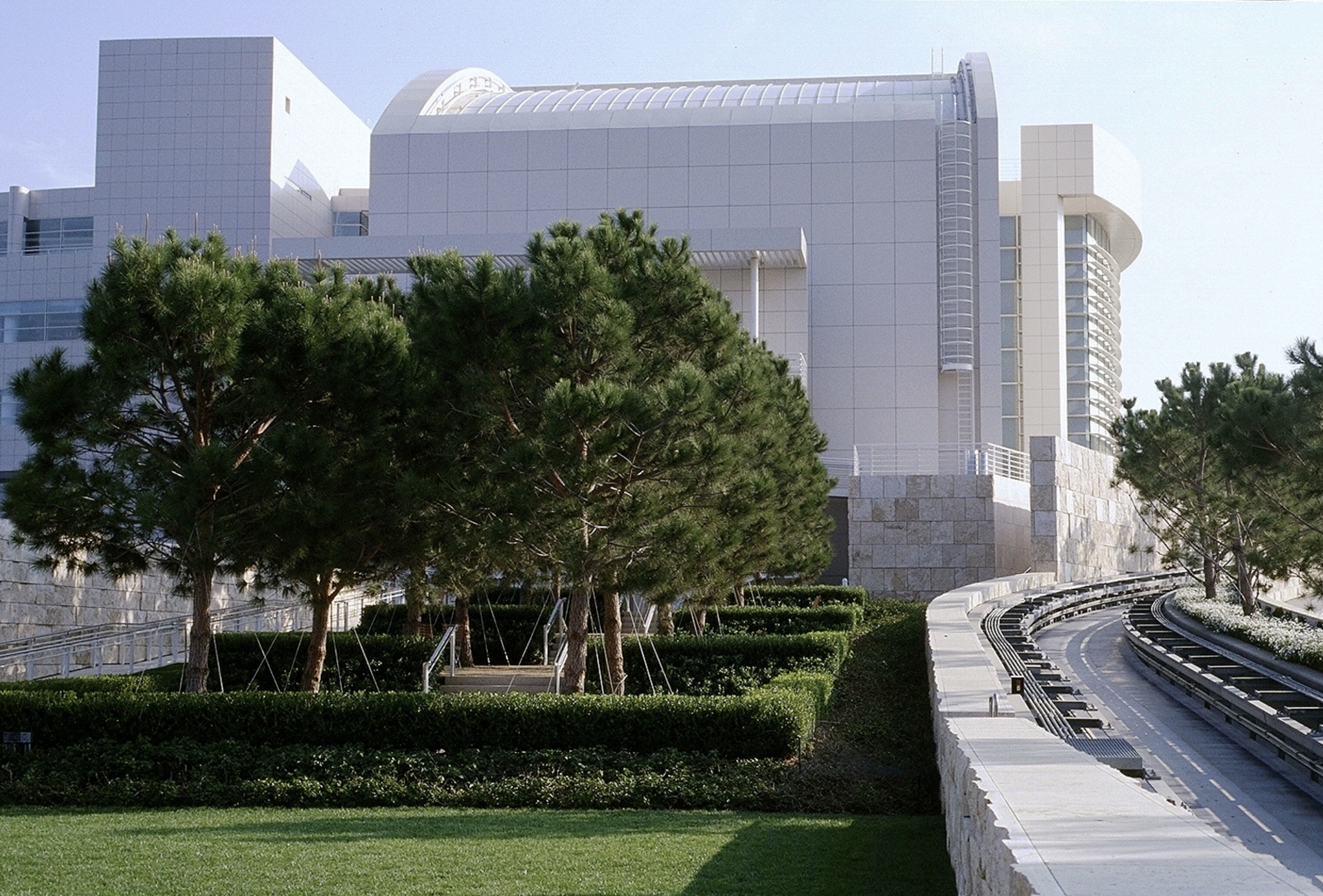 In 1982, the Getty Trust decided to build a facility to house its administrative offices and the staff of its six cultural programs. It purchased a 110-acre site at the base of the Santa Monica Mountains north of Los Angeles, California, and invited 80 architects to submit their responses to a program calling for soundly constructed buildings to serve and enhance the Getty's institutions in a scheme "appropriate to the site and responsive to its uniqueness." In addition, the Getty Trust emphasized the need to meet these objectives in a manner that would bring aesthetic pleasure to the building's occupants, visitors, and neighboring community. After interviewing the finalists, the selection committee chose the American architect Richard Meier (1934-) to formulate the design. The rugged topography of the promontory and a strict conditional-use permit enacted by a powerful neighborhood coalition placed unusual constraints on the architect, especially the restriction limiting the height of the buildings to 65 feet above the 896-foot hilltop. To meet this restriction and reduce the scale and monumentality of the project, Meier located approximately half the built work below ground with passageways connecting many of the facilities at a level of 876 feet. Above ground, he planned a campus of low buildings instead of one dominant structure and added a five-acre propylaeum (vestibule or entrance) to furnish parking and provide access to the acropolis via an electric tram.