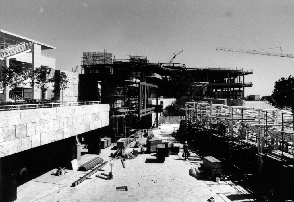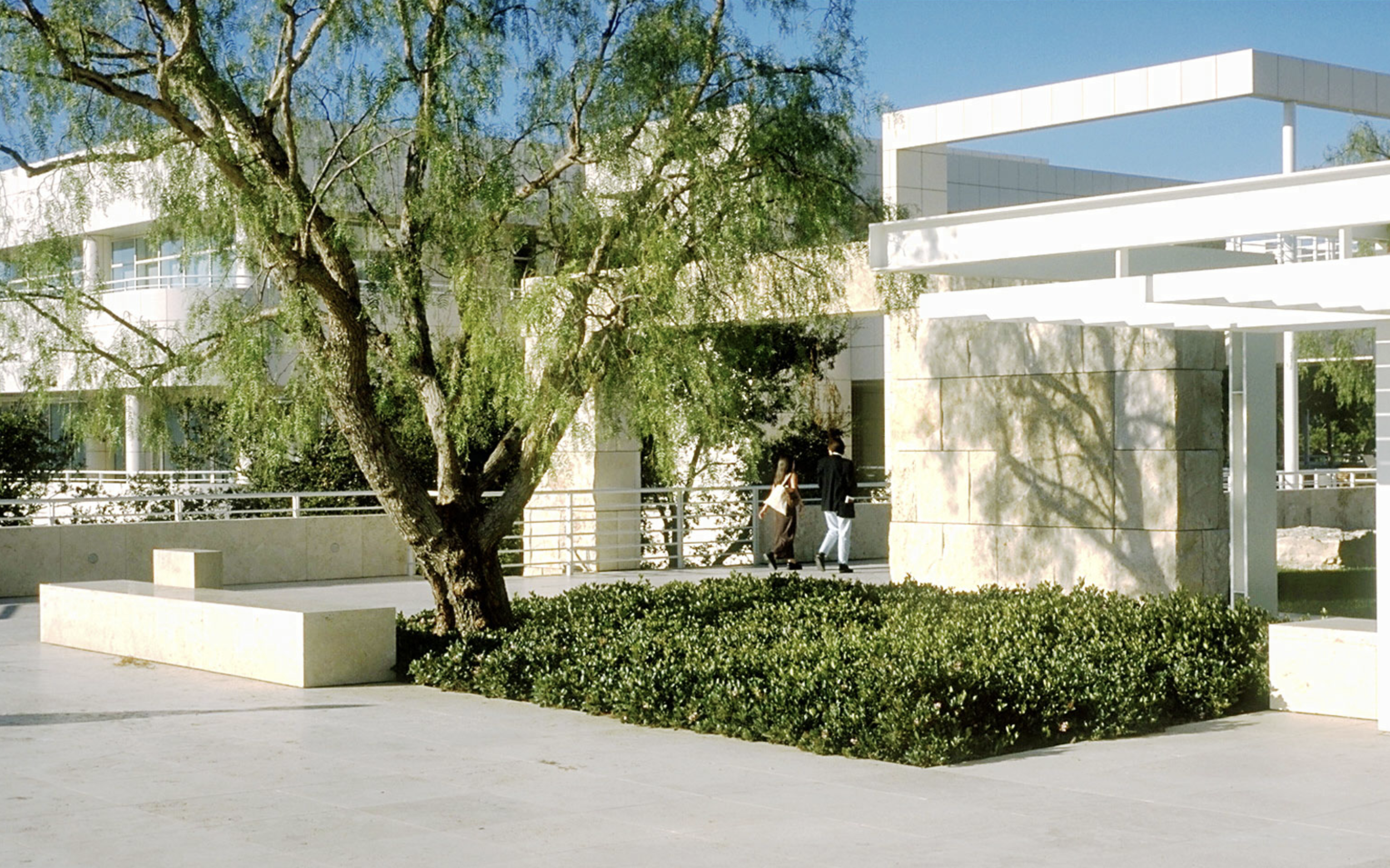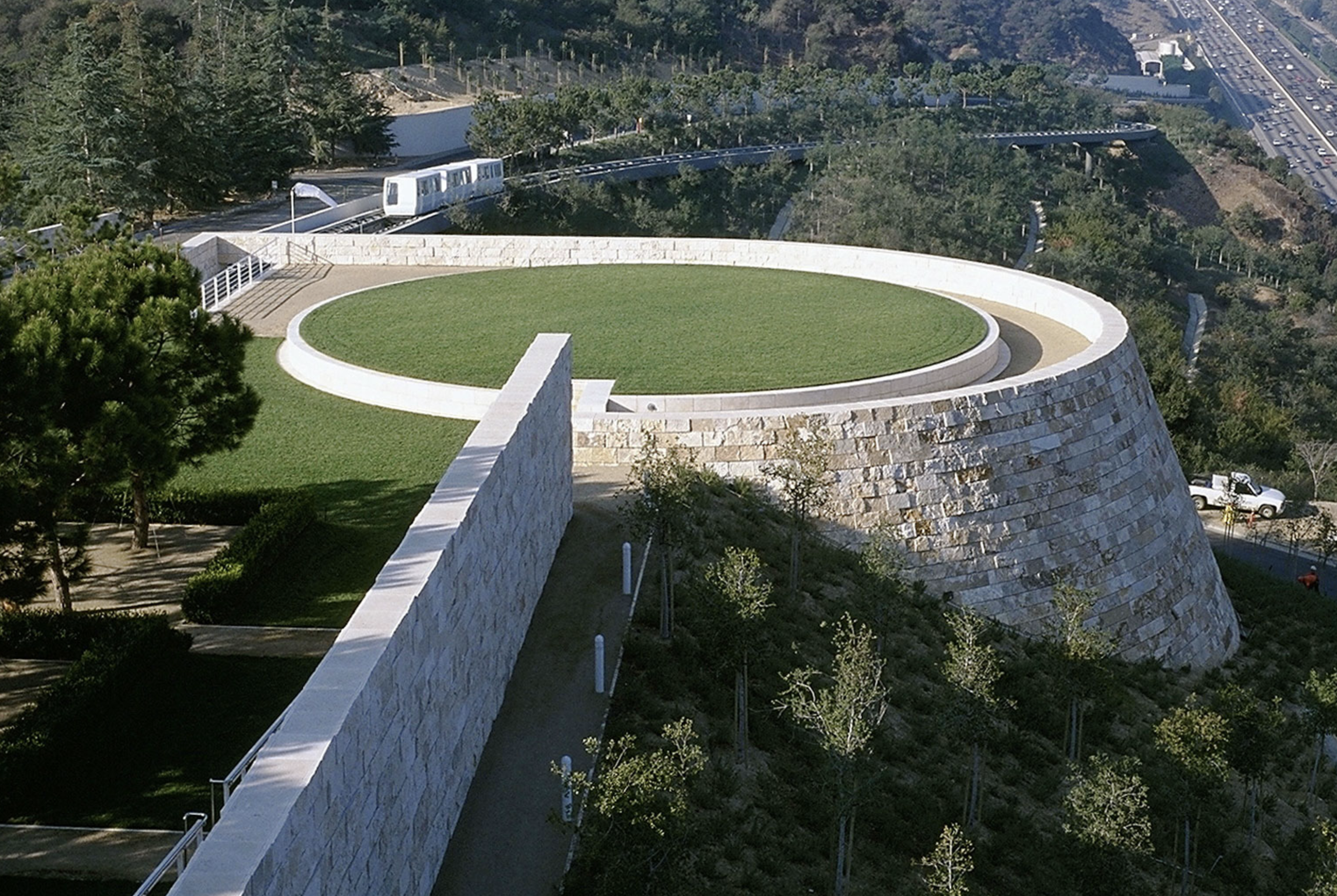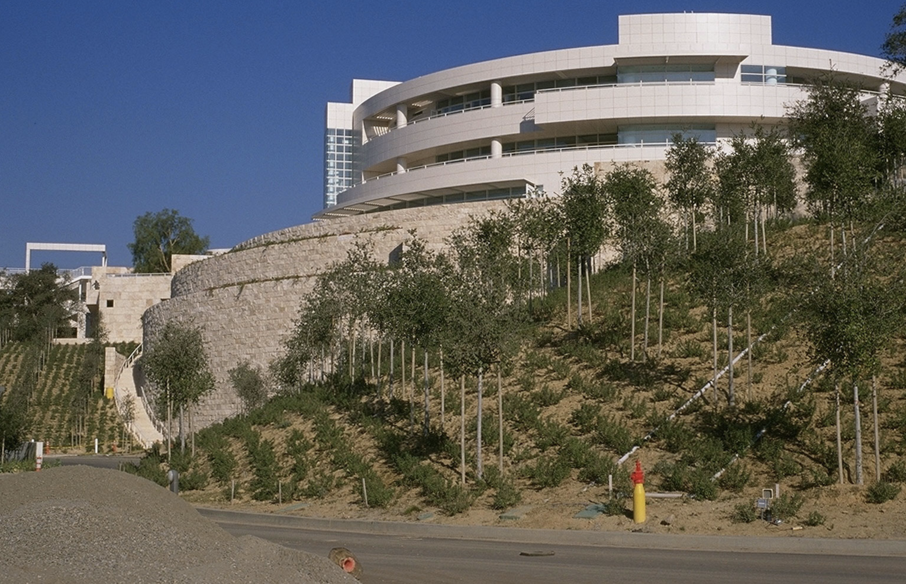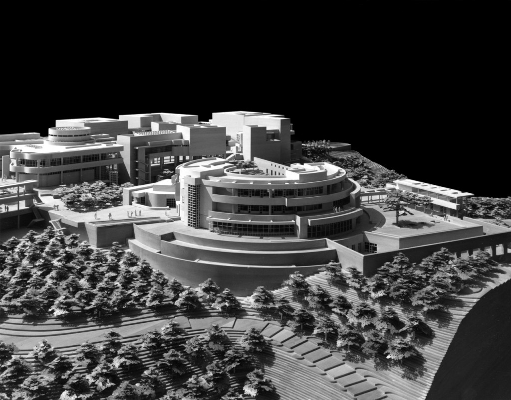 In 1982, the Getty Trust decided to build a facility to house its administrative offices and the staff of its six cultural programs. It purchased a 110-acre site at the base of the Santa Monica Mountains north of Los Angeles, California, and invited 80 architects to submit their responses to a program calling for soundly constructed buildings to serve and enhance the Getty's institutions in a scheme "appropriate to the site and responsive to its uniqueness." In addition, the Getty Trust emphasized the need to meet these objectives in a manner that would bring aesthetic pleasure to the building's occupants, visitors, and neighboring community. After interviewing the finalists, the selection committee chose the American architect Richard Meier (1934-) to formulate the design. The rugged topography of the promontory and a strict conditional-use permit enacted by a powerful neighborhood coalition placed unusual constraints on the architect, especially the restriction limiting the height of the buildings to 65 feet above the 896-foot hilltop. To meet this restriction and reduce the scale and monumentality of the project, Meier located approximately half the built work below ground with passageways connecting many of the facilities at a level of 876 feet. Above ground, he planned a campus of low buildings instead of one dominant structure and added a five-acre propylaeum (vestibule or entrance) to furnish parking and provide access to the acropolis via an electric tram.