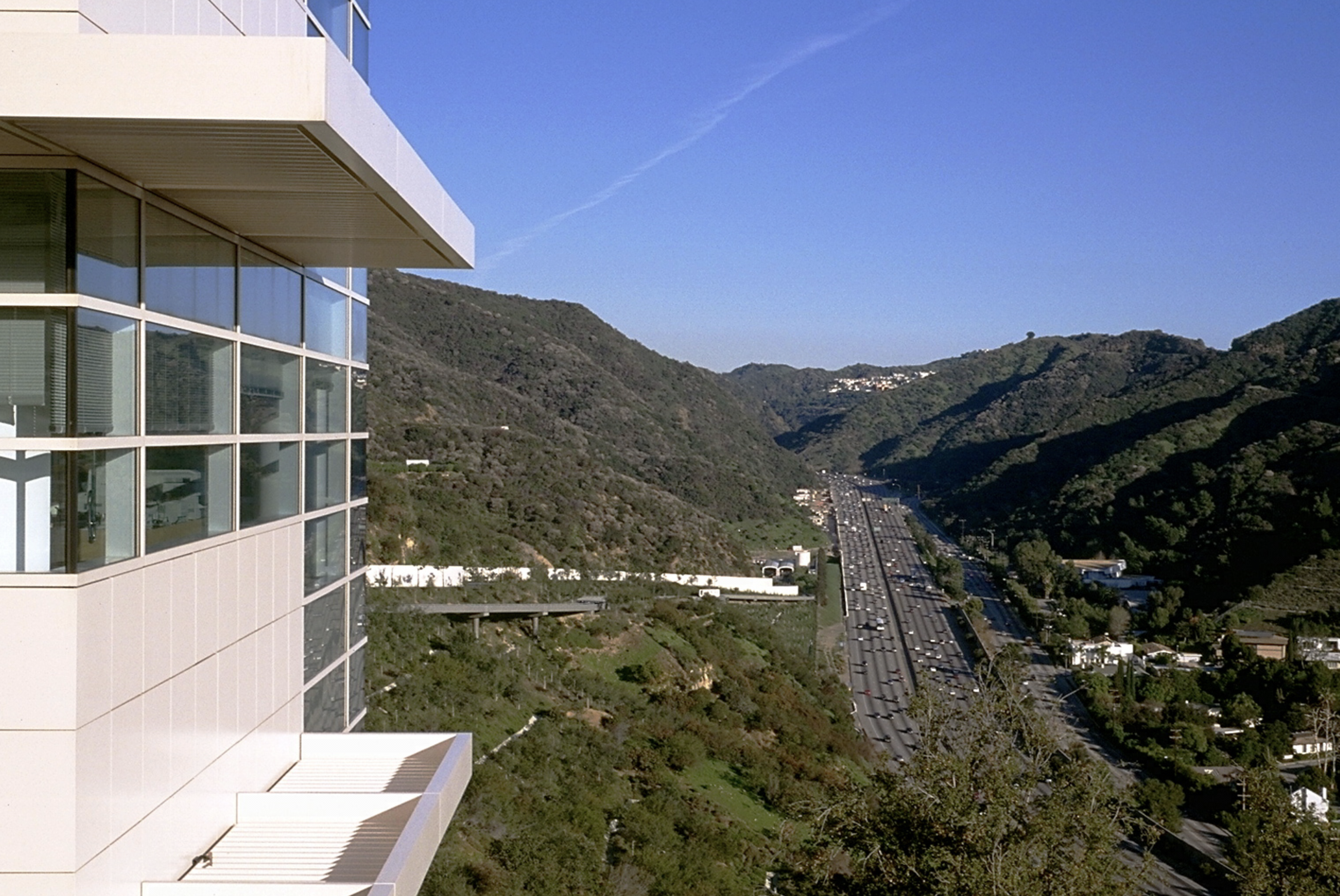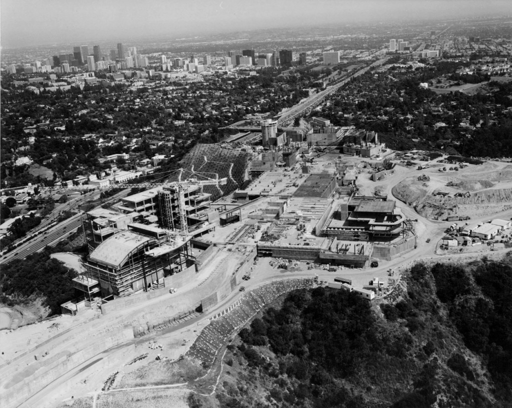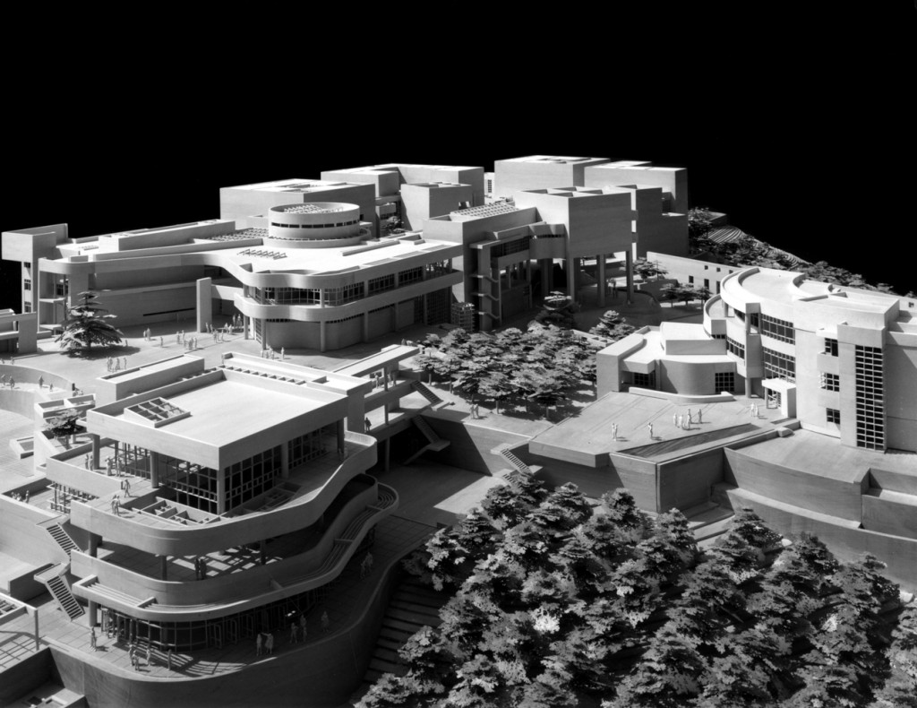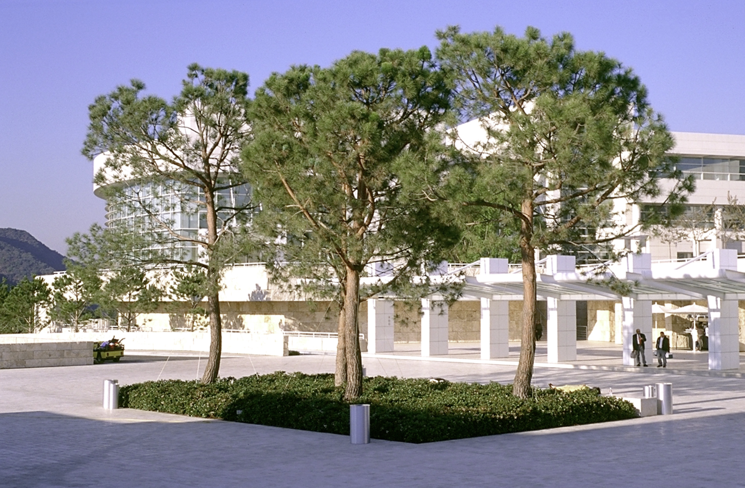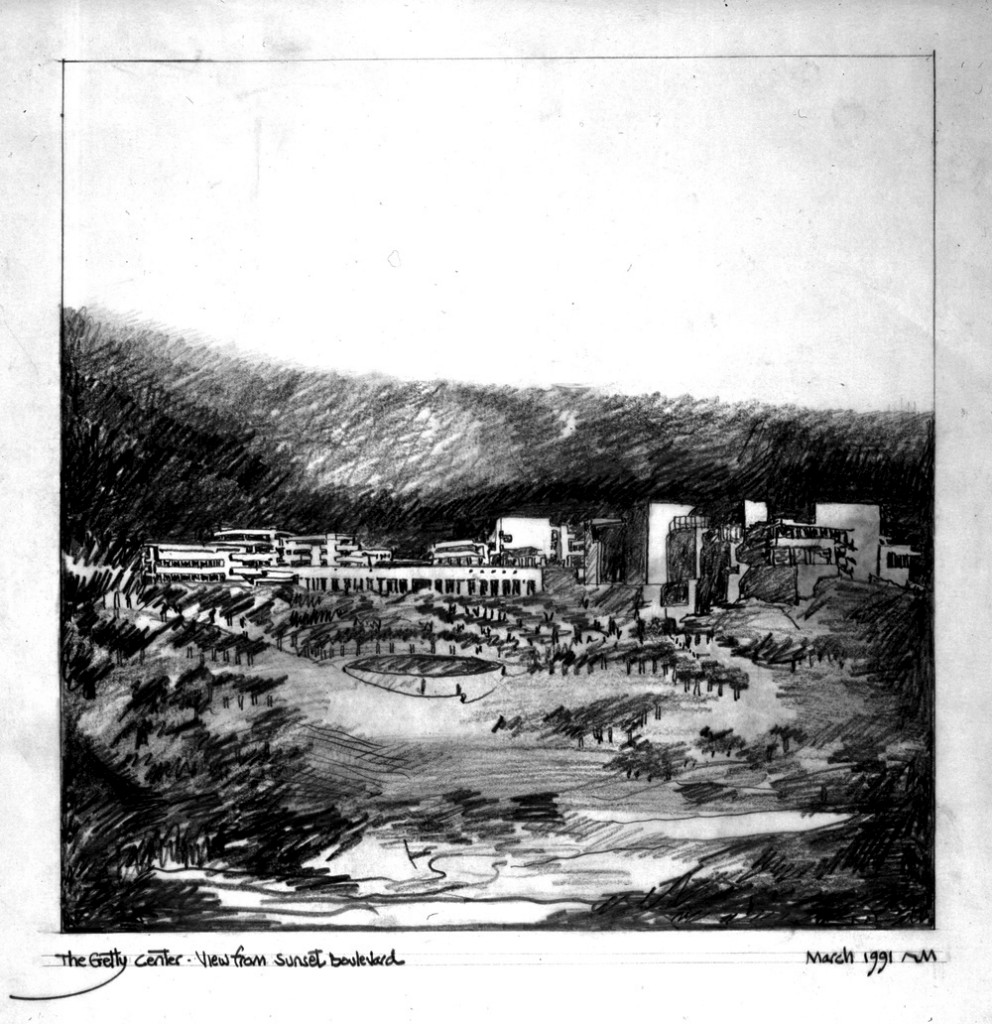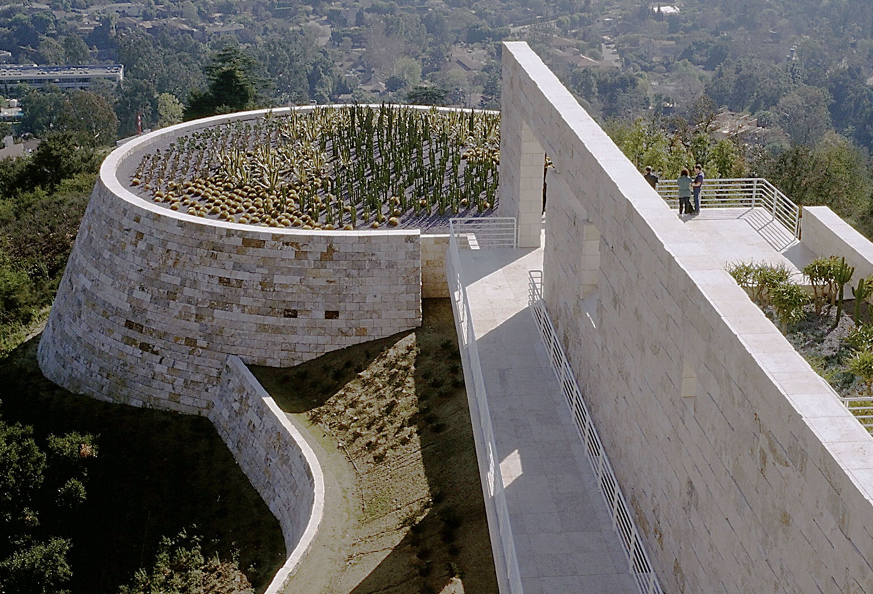 In 1982, the Getty Trust decided to build a facility to house its administrative offices and the staff of its six cultural programs. It purchased a 110-acre site at the base of the Santa Monica Mountains north of Los Angeles, California, and invited 80 architects to submit their responses to a program calling for soundly constructed buildings to serve and enhance the Getty's institutions in a scheme "appropriate to the site and responsive to its uniqueness." In addition, the Getty Trust emphasized the need to meet these objectives in a manner that would bring aesthetic pleasure to the building's occupants, visitors, and neighboring community. After interviewing the finalists, the selection committee chose the American architect Richard Meier (1934-) to formulate the design. The rugged topography of the promontory and a strict conditional-use permit enacted by a powerful neighborhood coalition placed unusual constraints on the architect, especially the restriction limiting the height of the buildings to 65 feet above the 896-foot hilltop. To meet this restriction and reduce the scale and monumentality of the project, Meier located approximately half the built work below ground with passageways connecting many of the facilities at a level of 876 feet. Above ground, he planned a campus of low buildings instead of one dominant structure and added a five-acre propylaeum (vestibule or entrance) to furnish parking and provide access to the acropolis via an electric tram.