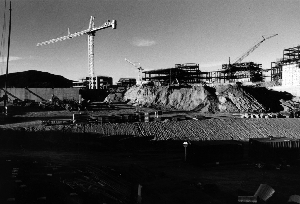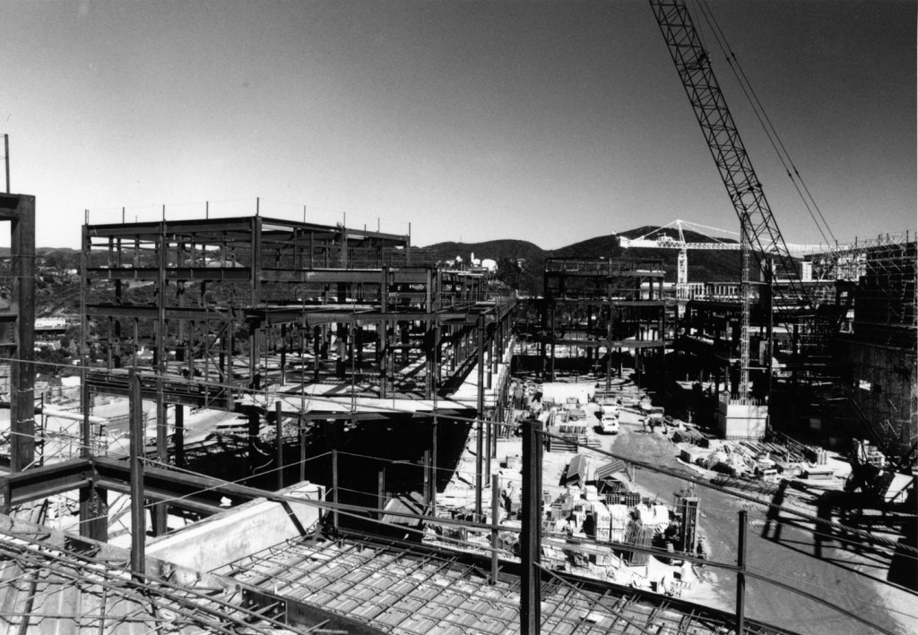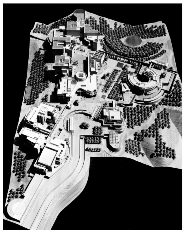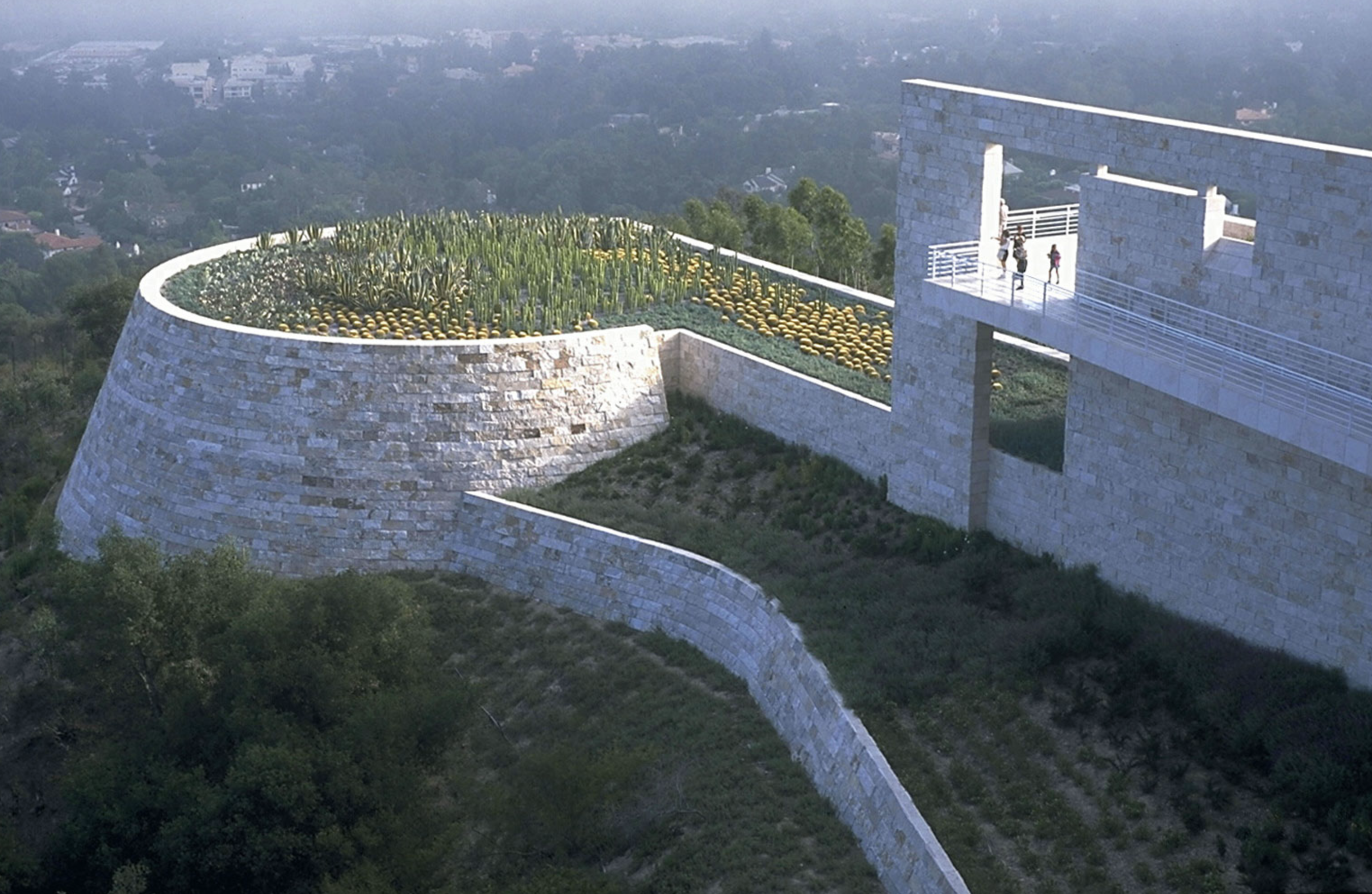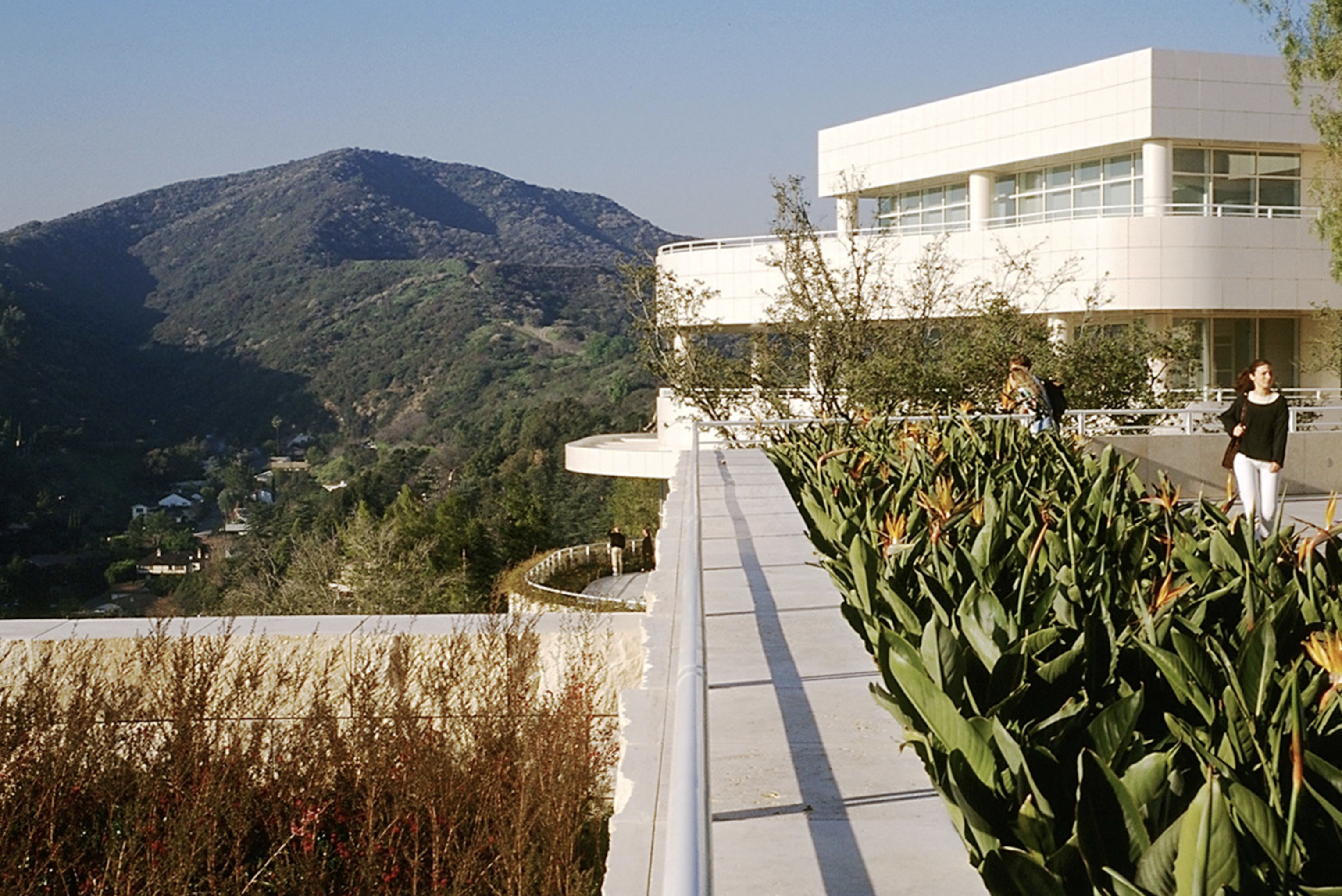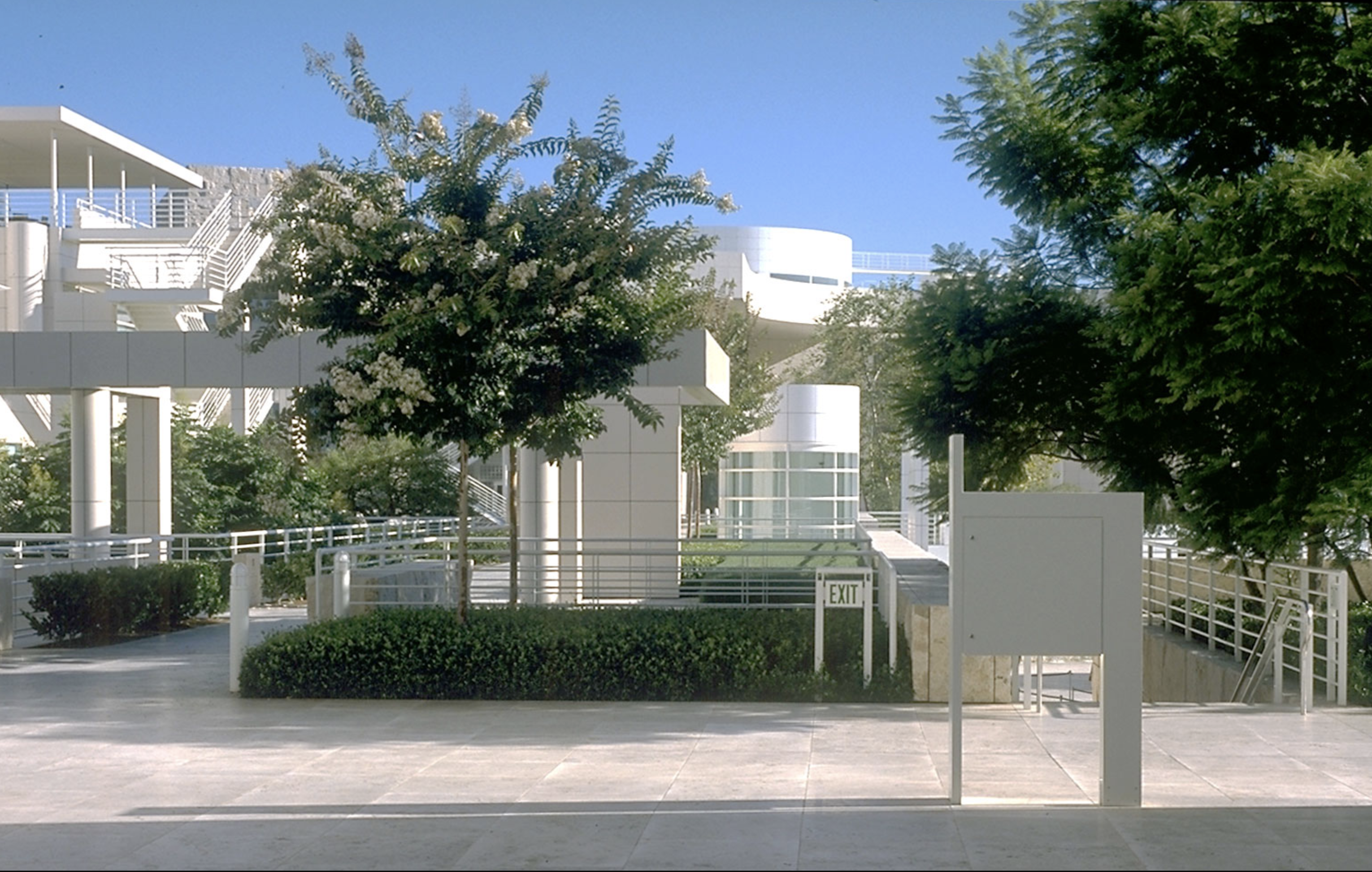 In 1982, the Getty Trust decided to build a facility to house its administrative offices and the staff of its six cultural programs. It purchased a 110-acre site at the base of the Santa Monica Mountains north of Los Angeles, California, and invited 80 architects to submit their responses to a program calling for soundly constructed buildings to serve and enhance the Getty's institutions in a scheme "appropriate to the site and responsive to its uniqueness." In addition, the Getty Trust emphasized the need to meet these objectives in a manner that would bring aesthetic pleasure to the building's occupants, visitors, and neighboring community. After interviewing the finalists, the selection committee chose the American architect Richard Meier (1934-) to formulate the design. The rugged topography of the promontory and a strict conditional-use permit enacted by a powerful neighborhood coalition placed unusual constraints on the architect, especially the restriction limiting the height of the buildings to 65 feet above the 896-foot hilltop. To meet this restriction and reduce the scale and monumentality of the project, Meier located approximately half the built work below ground with passageways connecting many of the facilities at a level of 876 feet. Above ground, he planned a campus of low buildings instead of one dominant structure and added a five-acre propylaeum (vestibule or entrance) to furnish parking and provide access to the acropolis via an electric tram.