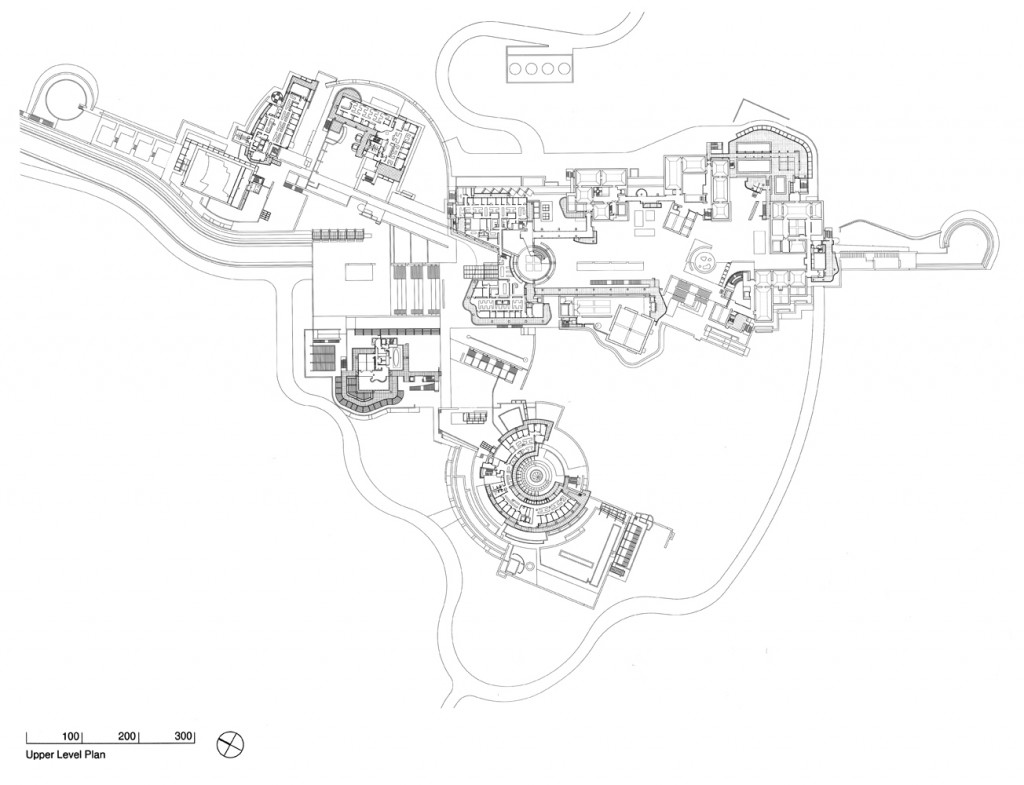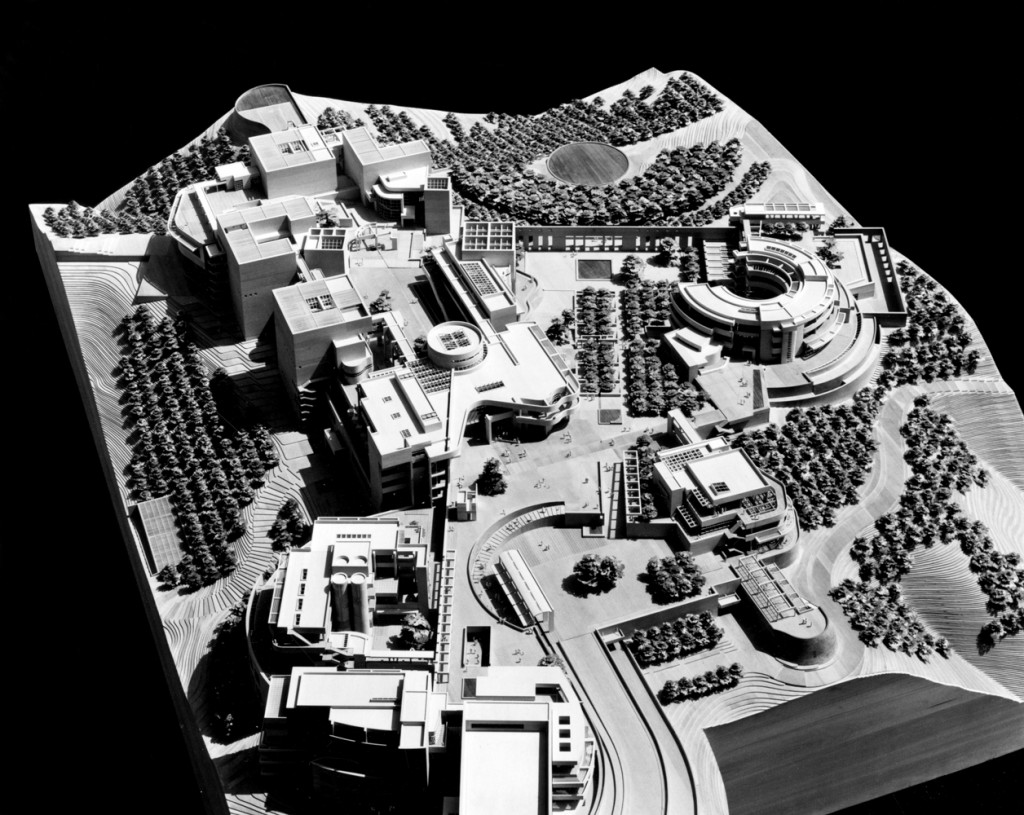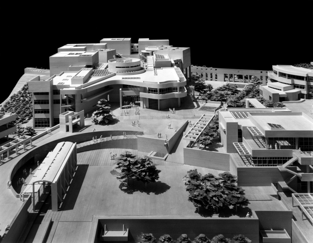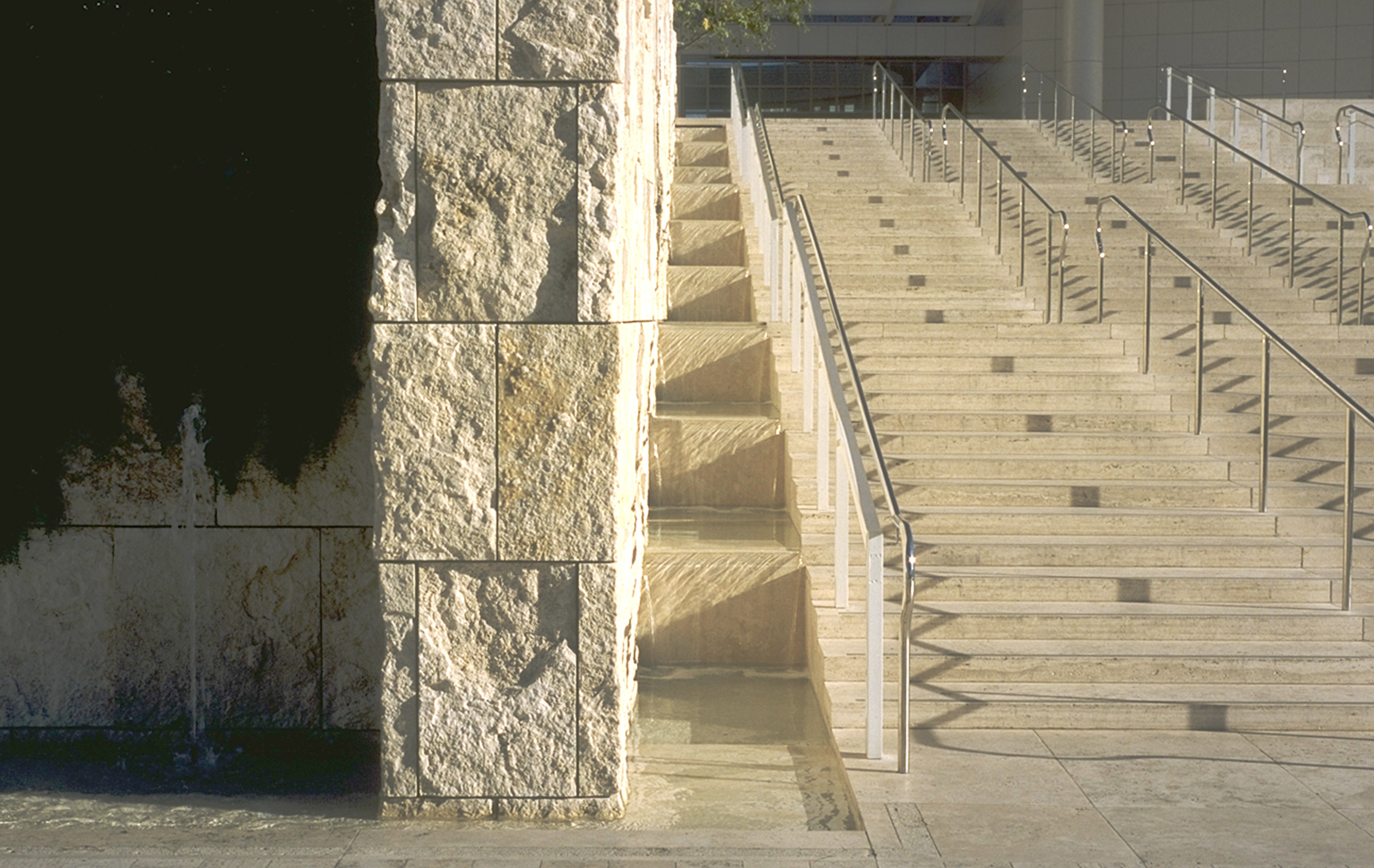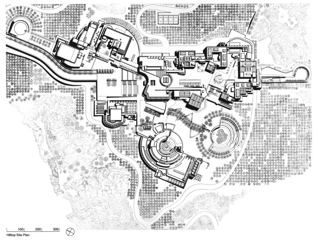 Complexity is introduced in the magnitude of the scheme and the particularity of the plan. An assortment of buildings tailored to the identities and requirements of the Getty programs creates a diverse yet homogeneous campus. Further complexity is added with the division of the J. Paul Getty Museum into an orientation building plus five exhibition pavilions. Meier's decision to conform to the undulation of the topography for the placement of the buildings instead of creating a uniform base platform also adds variety and reduces the apparent scale of the complex. He arranges the buildings along two prominent natural ridges. Buildings located on the eastern ridge include the Museum cluster; a building for the Art History Information Program staff and the administrative offices of the Getty Trust; a building housing the employees of the Conservation Institute, the Grants Program, and the Center for Education; and a 450-seat Auditorium building. The Research Institute for the History of Art and the Humanities and a support facility containing a public restaurant and cafeteria, plus private dining rooms and meeting rooms for staff, occupy the western ridge. The ravine between the ridges accommodates the entrance plaza, a grand staircase leading to the Museum cluster, and outdoor terraces for dining, circulation, and relaxation.