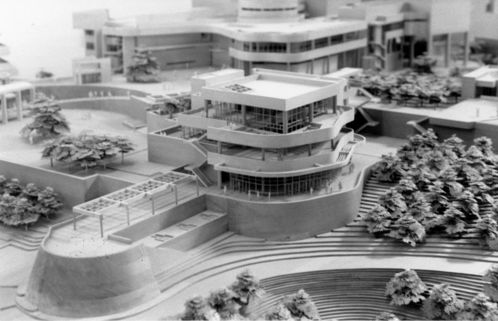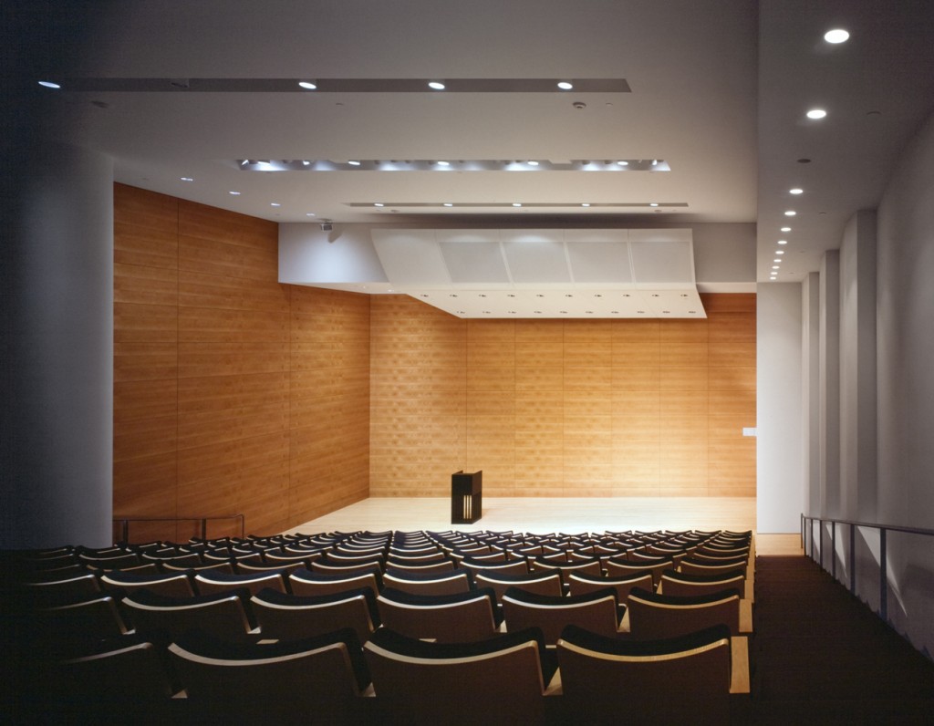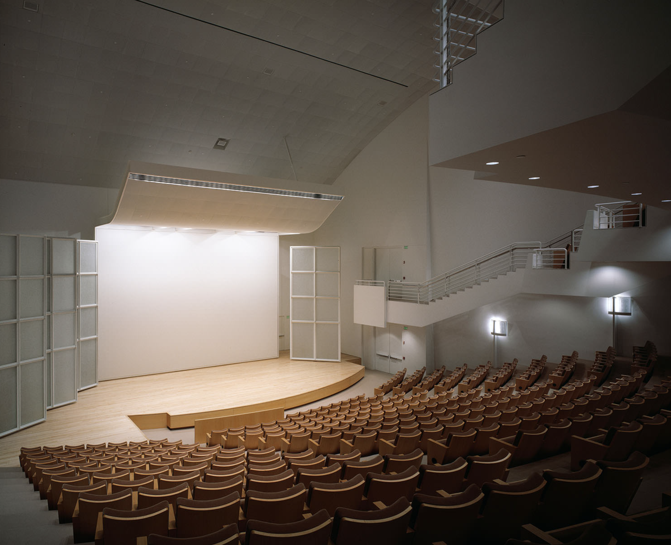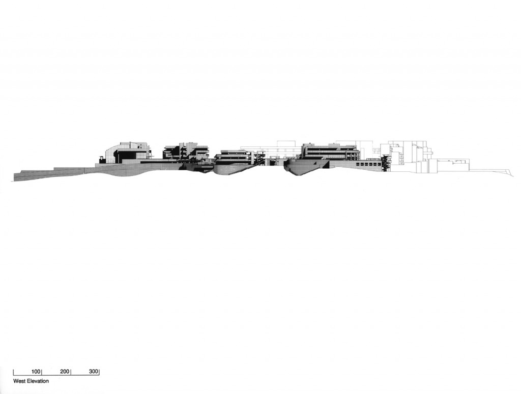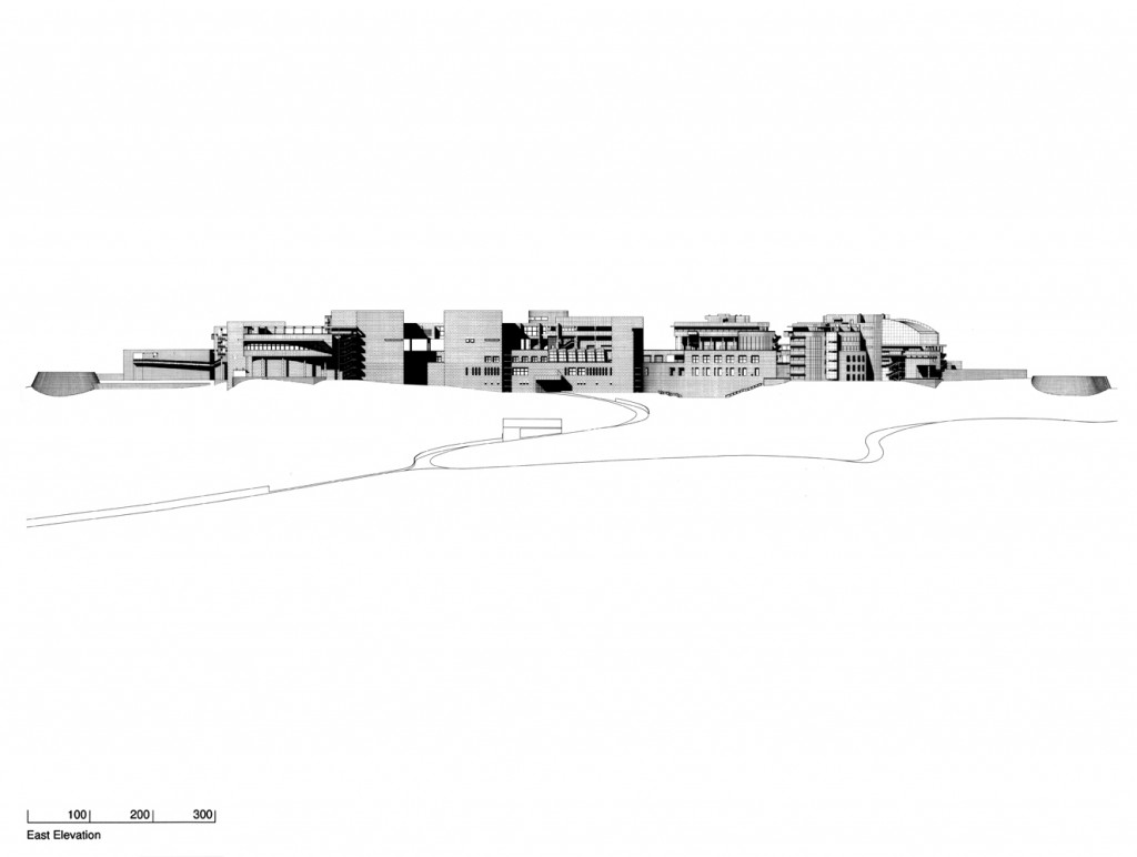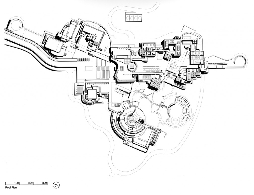 Complexity is introduced in the magnitude of the scheme and the particularity of the plan. An assortment of buildings tailored to the identities and requirements of the Getty programs creates a diverse yet homogeneous campus. Further complexity is added with the division of the J. Paul Getty Museum into an orientation building plus five exhibition pavilions. Meier's decision to conform to the undulation of the topography for the placement of the buildings instead of creating a uniform base platform also adds variety and reduces the apparent scale of the complex. He arranges the buildings along two prominent natural ridges. Buildings located on the eastern ridge include the Museum cluster; a building for the Art History Information Program staff and the administrative offices of the Getty Trust; a building housing the employees of the Conservation Institute, the Grants Program, and the Center for Education; and a 450-seat Auditorium building. The Research Institute for the History of Art and the Humanities and a support facility containing a public restaurant and cafeteria, plus private dining rooms and meeting rooms for staff, occupy the western ridge. The ravine between the ridges accommodates the entrance plaza, a grand staircase leading to the Museum cluster, and outdoor terraces for dining, circulation, and relaxation.