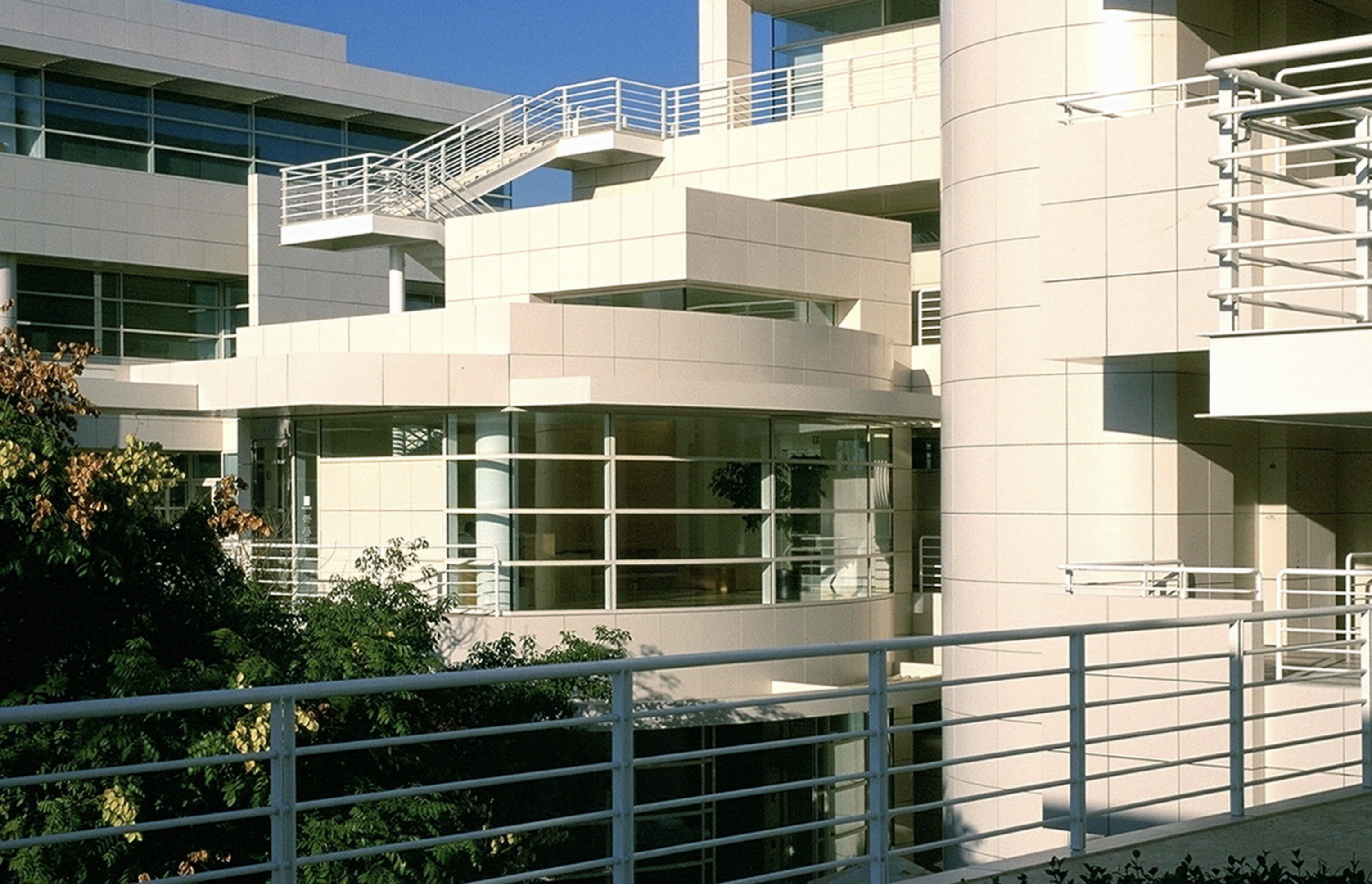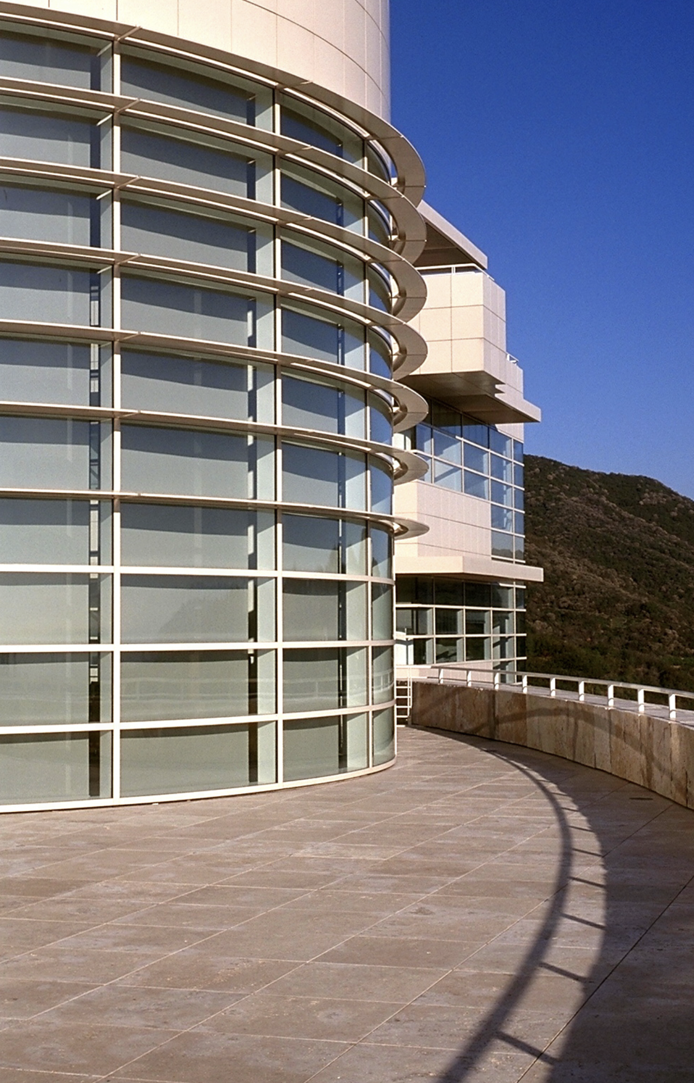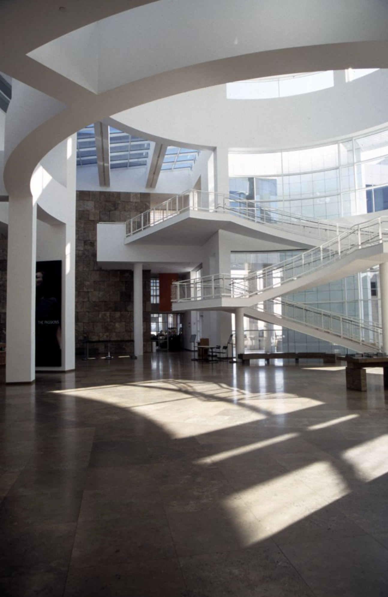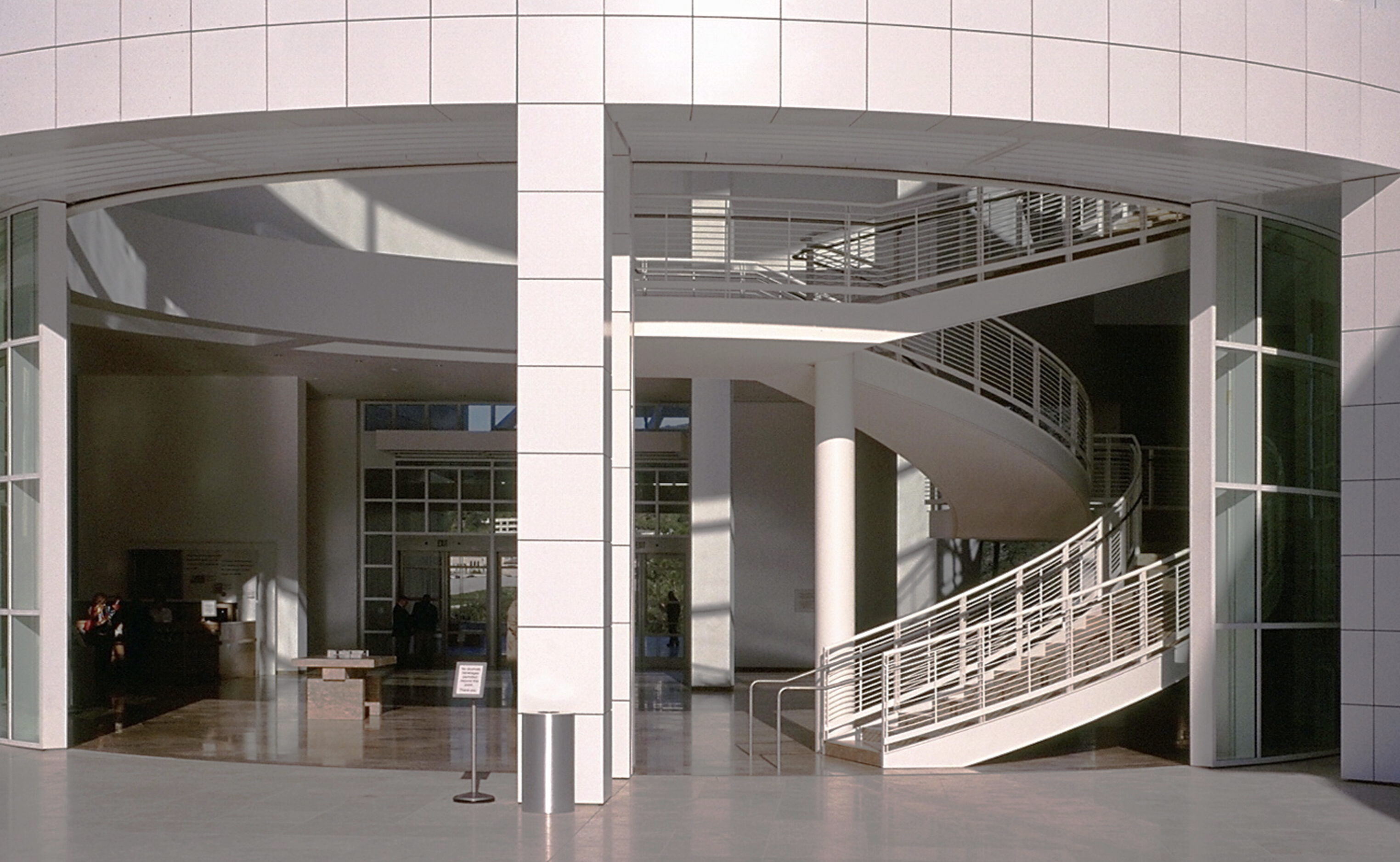 Although the individual steel-frame and reinforced-concrete structures vary in form, they continue the uniform aesthetic by repeating Meier's characteristic 1920s vocabulary of ship railings, flat roofs, and extensive glazing. References to the work of Le Corbusier, Rudolph Schindler, Frank Lloyd Wright, and others provide the distinguishing features between the individual structures and the institutions they house. The design of the Research Institute and the Museum rotunda stand out as original and sensitive compositions, whereas the other buildings appear conservative and understated, achieving their greatest success in dramatic terraces and passages that carefully frame views of Los Angeles, the mountains, and the ocean.