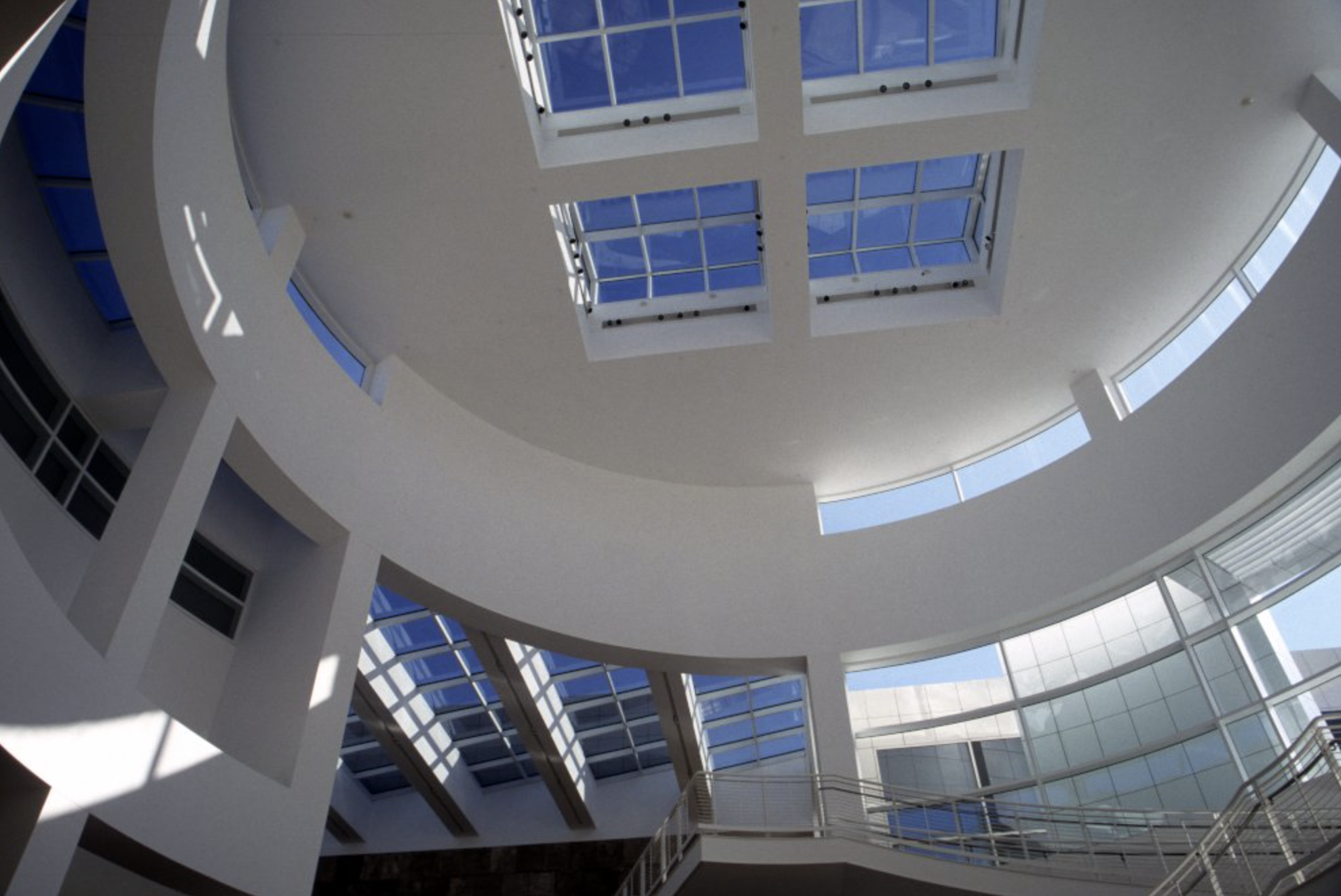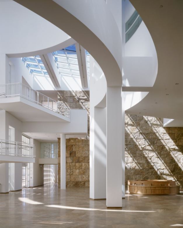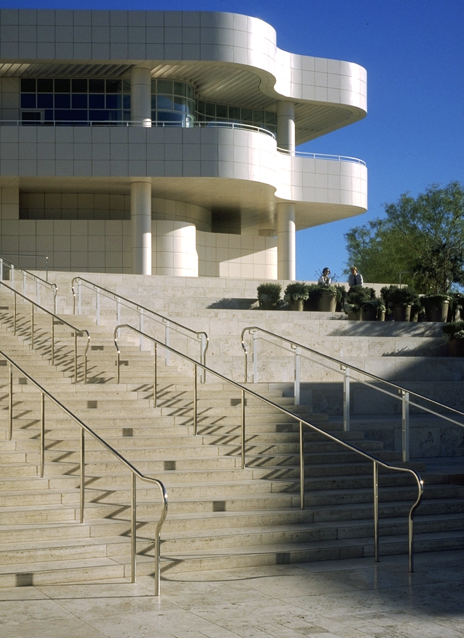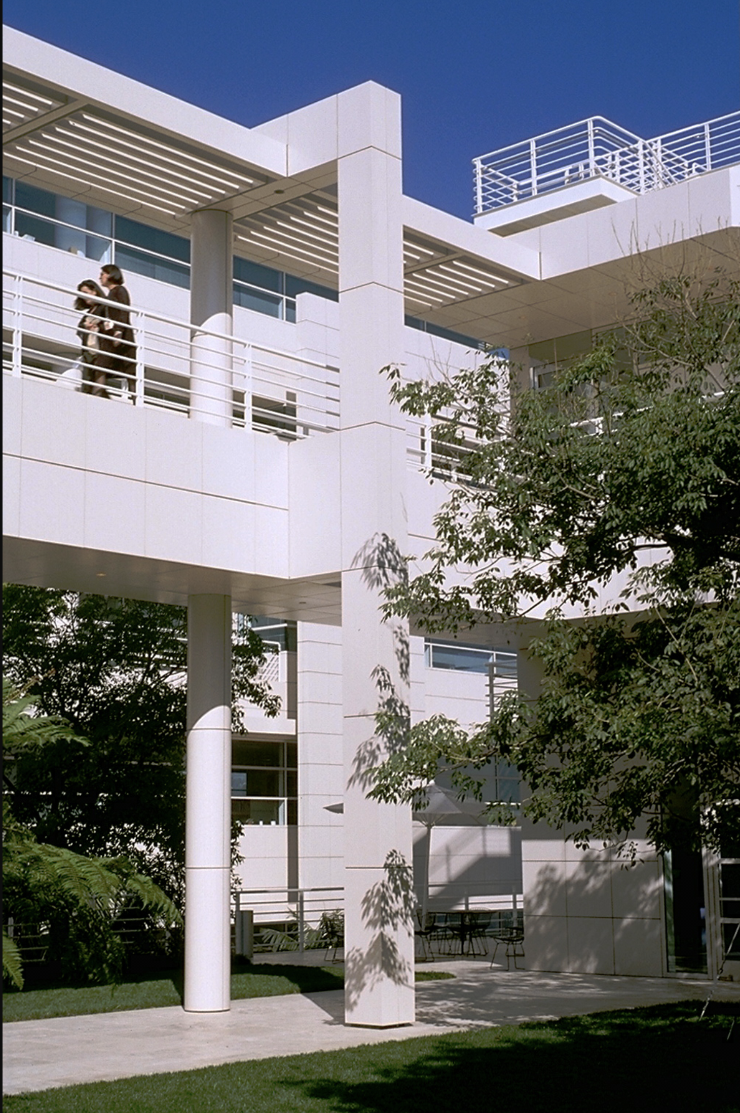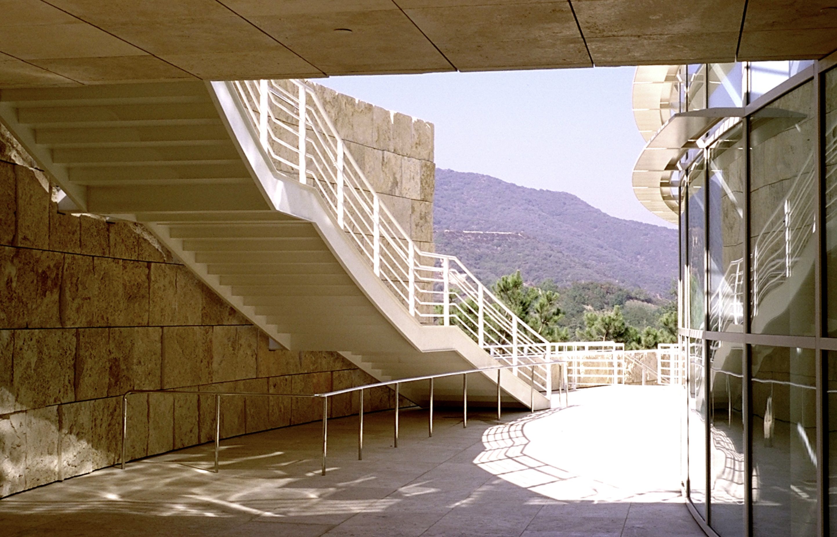 Although the individual steel-frame and reinforced-concrete structures vary in form, they continue the uniform aesthetic by repeating Meier's characteristic 1920s vocabulary of ship railings, flat roofs, and extensive glazing. References to the work of Le Corbusier, Rudolph Schindler, Frank Lloyd Wright, and others provide the distinguishing features between the individual structures and the institutions they house. The design of the Research Institute and the Museum rotunda stand out as original and sensitive compositions, whereas the other buildings appear conservative and understated, achieving their greatest success in dramatic terraces and passages that carefully frame views of Los Angeles, the mountains, and the ocean.