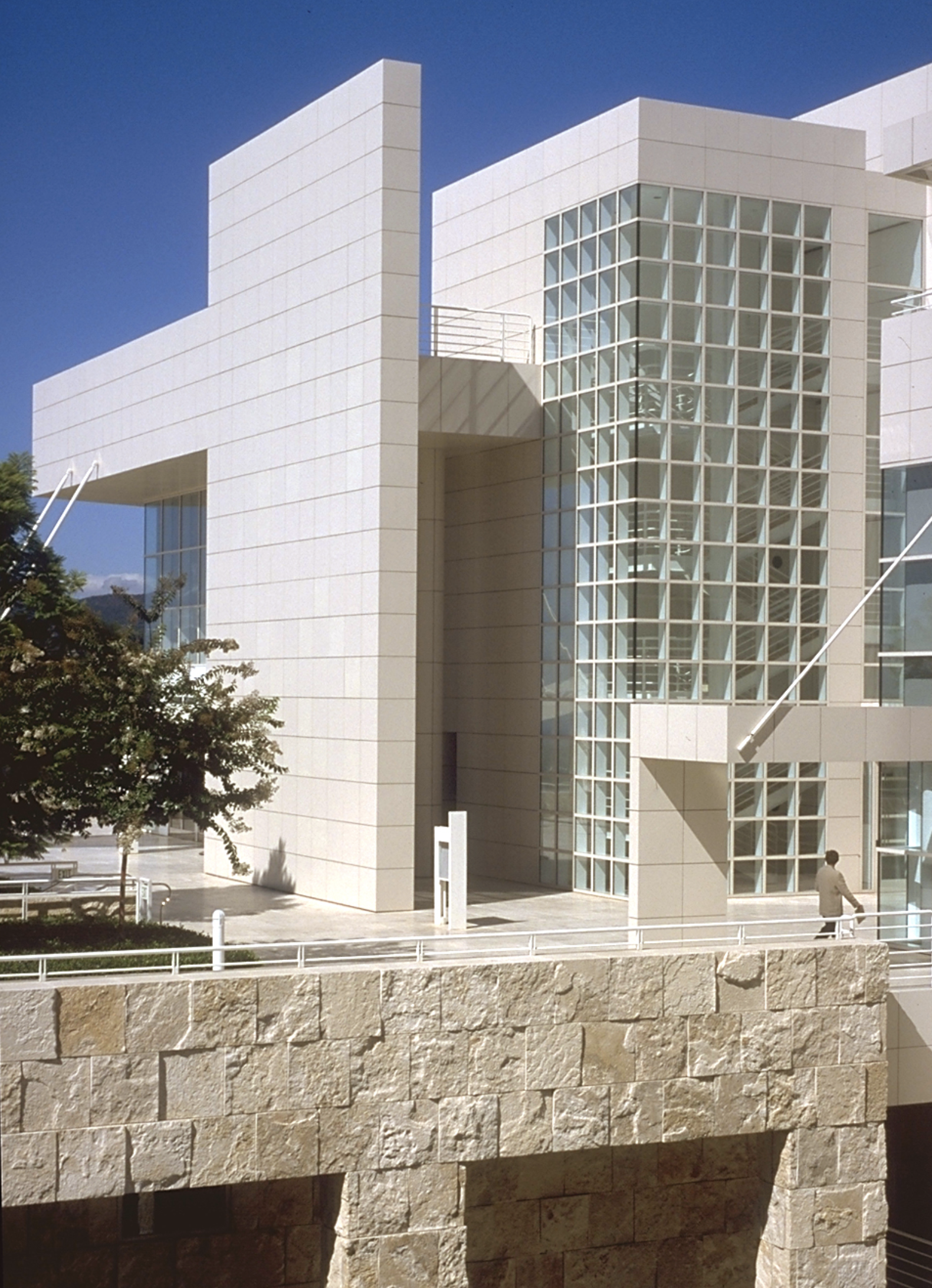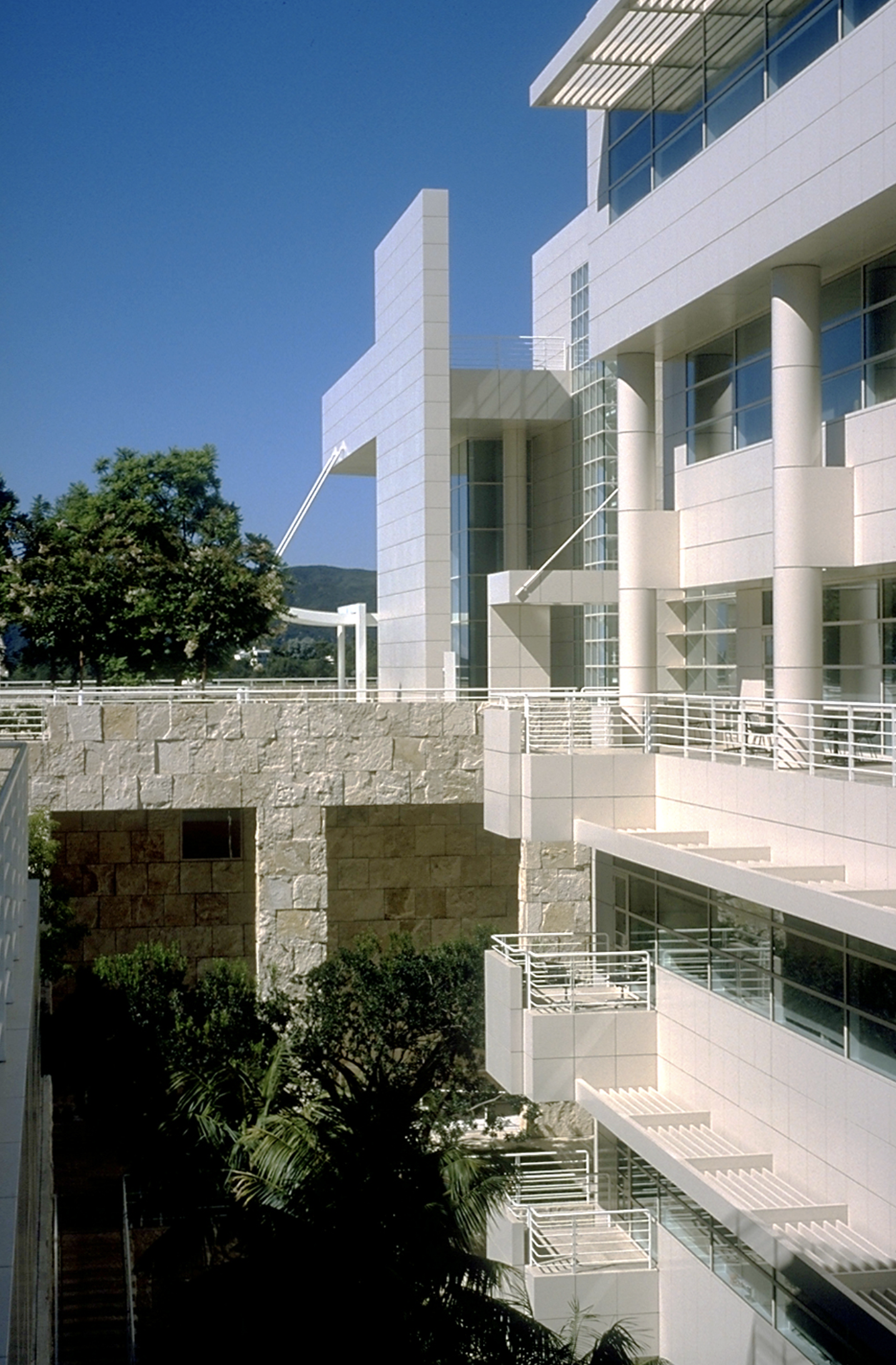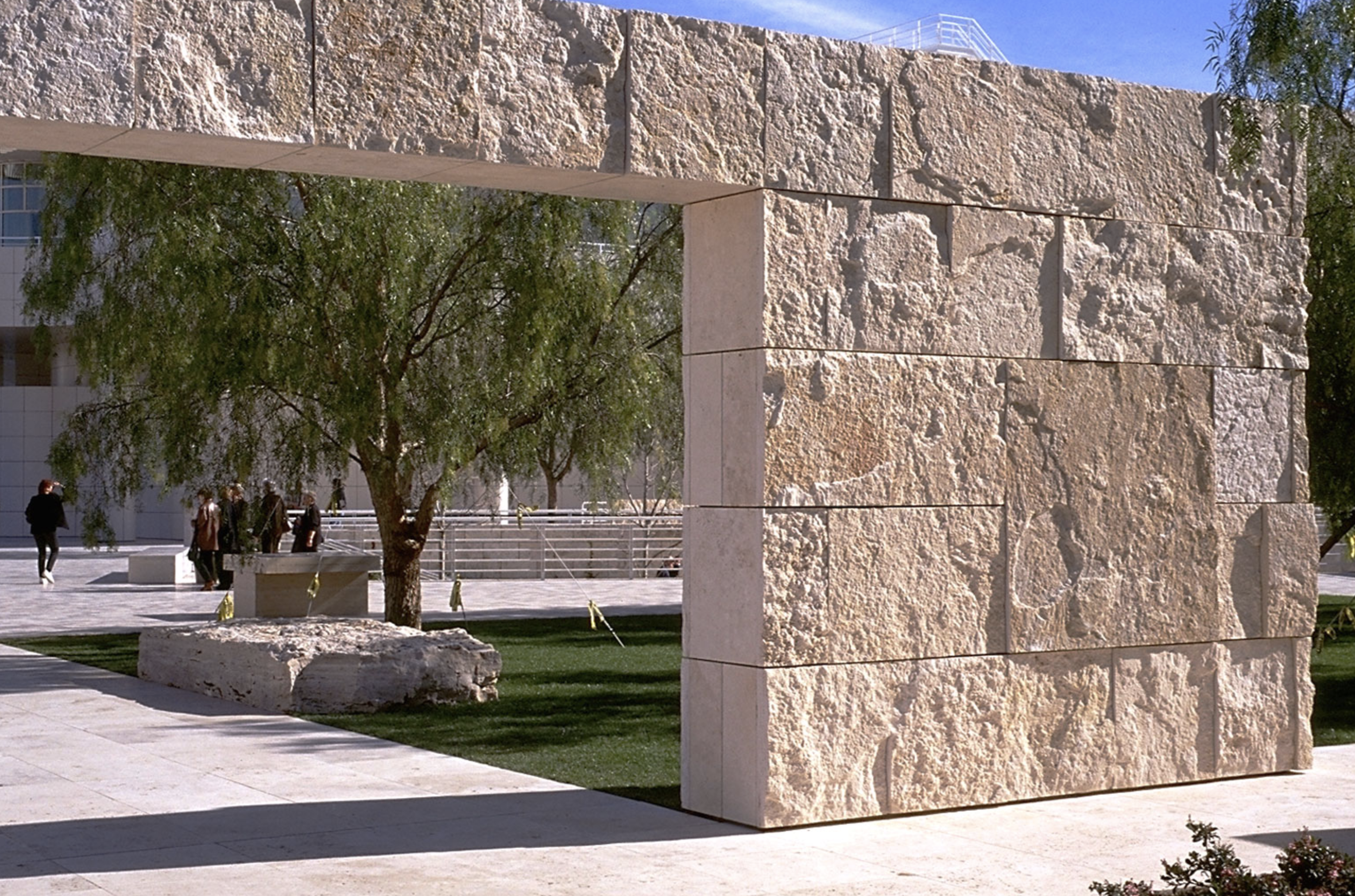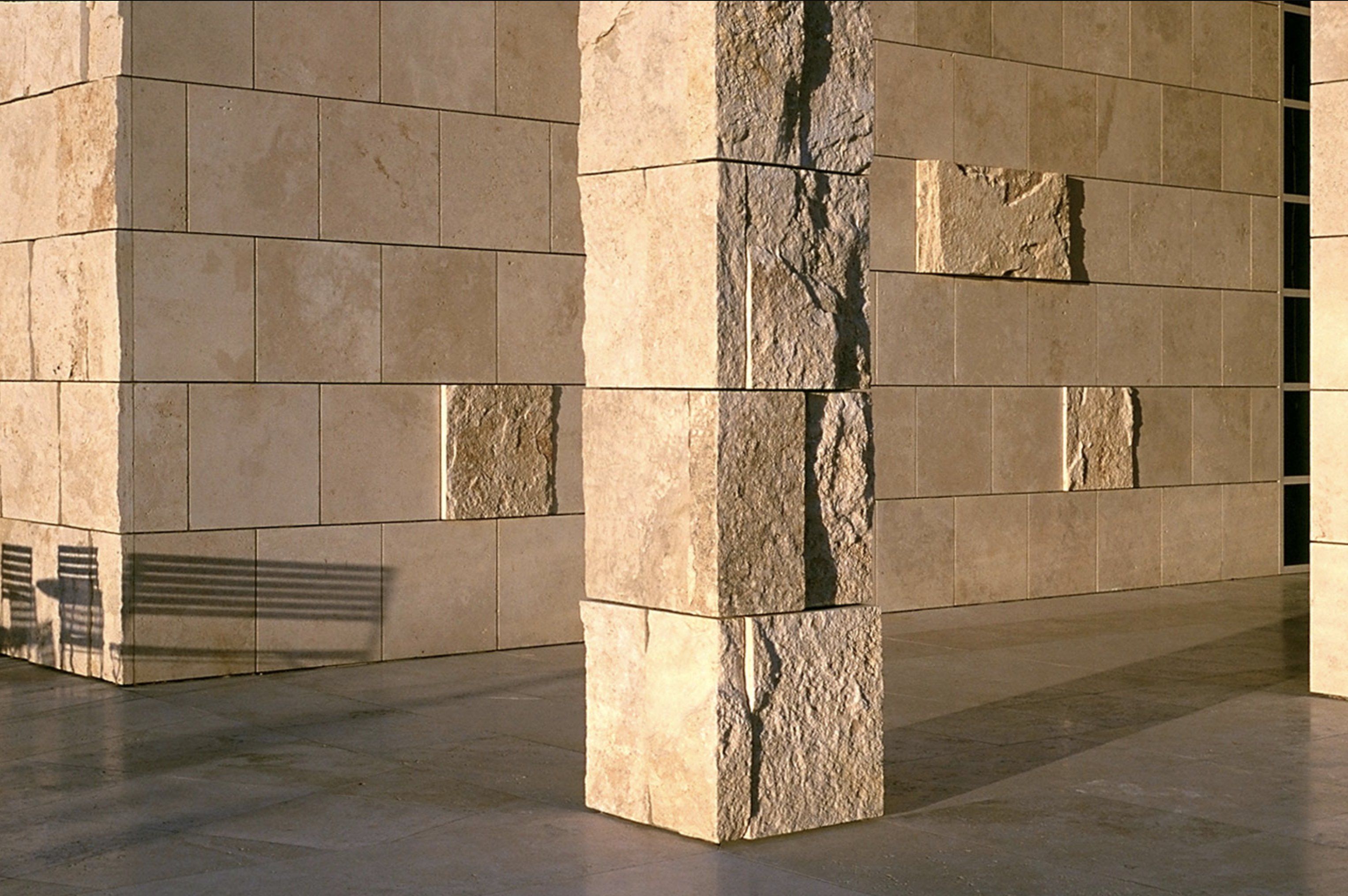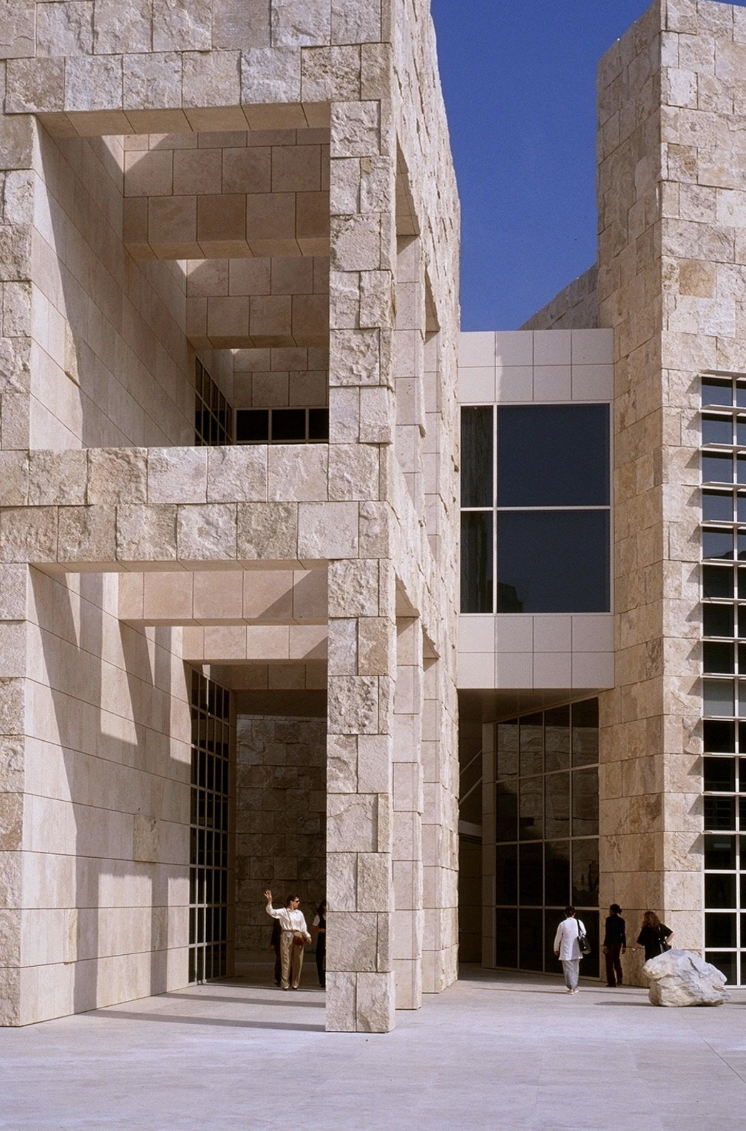 Meier's design for the Getty Center exhibits significant departures from his previous work. One example involves his decision to create an assemblage of buildings instead of a stand-alone structure. This decision forced him to consider urban-planning concerns, such as the relationship of buildings and the nature and sequencing of their interstitial spaces. His response is a 24-acre campus emphasizing freedom of movement between human-scaled edifices and through generous courtyards and gardens. His choice of materials represents another change. Local resident groups rejected both Meier's signature white-enameled exteriors and his alternate choice of metal panels but approved his later recommendation of rough-cleft Italian travertine for rectilinear surfaces and complementary colored enameled aluminum panels for the curvilinear areas. Cutting the fossilized stone into 30-inch blocks to conform to the grid used as the basis of the Getty design presented another challenge, requiring the invention of a guillotine-type apparatus. In addition, Meier devised a method of supporting the cladding on metal plates, leaving open seams between blocks and space between waterproofed interior surfaces and the travertine, diverting rainfall behind the stone to protect the rough exterior from erosion. Meier's suspension of the travertine panels denies the weight and massing of masonry, prompting some critics to describe the stone as having a fake appearance. The nontraditional handling of the material does produce insubstantiality and unfortunate results in some areas, particularly in the surface irregularity of the tall piers in the garden courtyard, but overall, the effect of the travertine's variations in color and texture complements the tiled surfaces and contributes to the unified aesthetic of the complex.