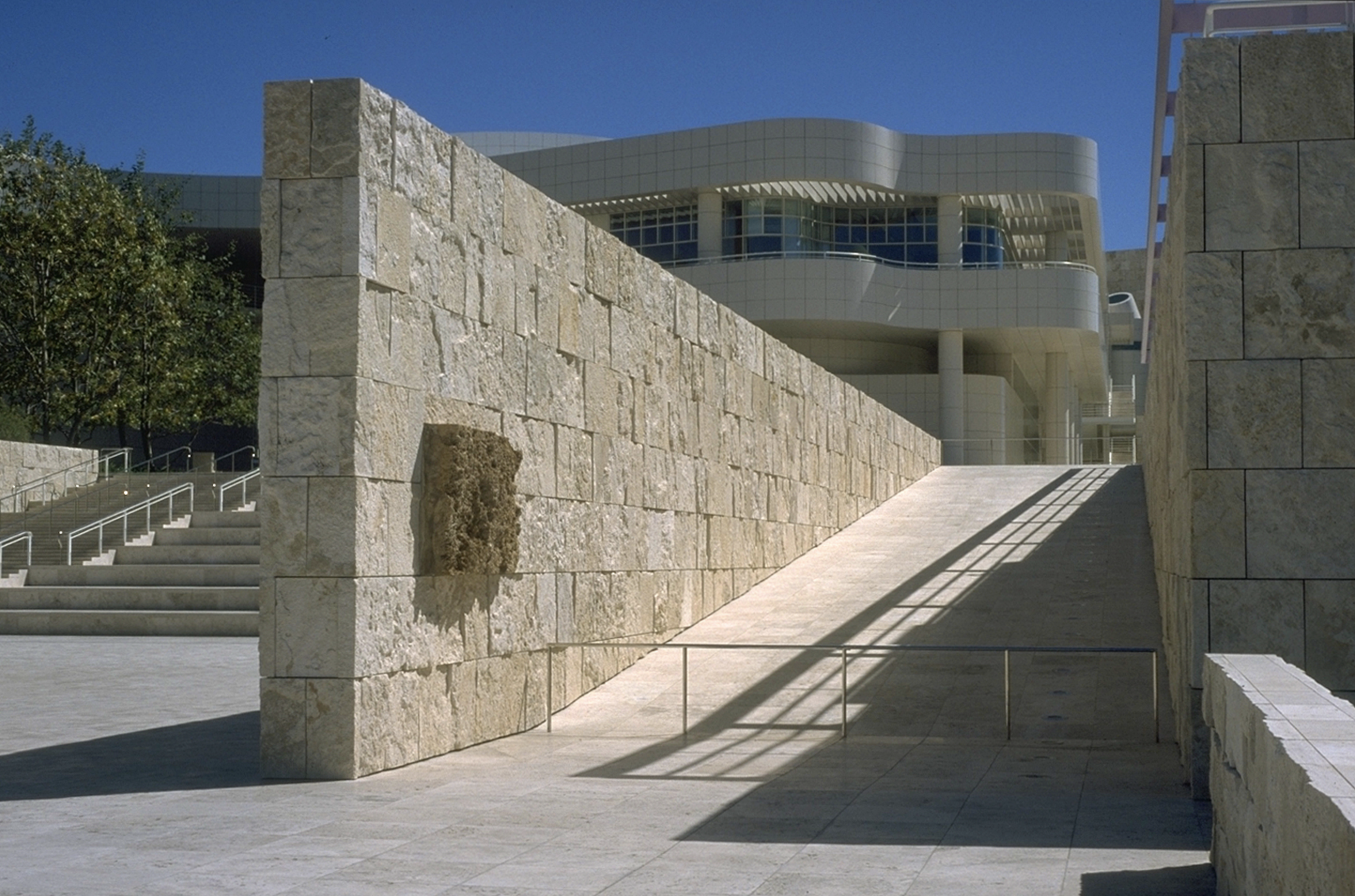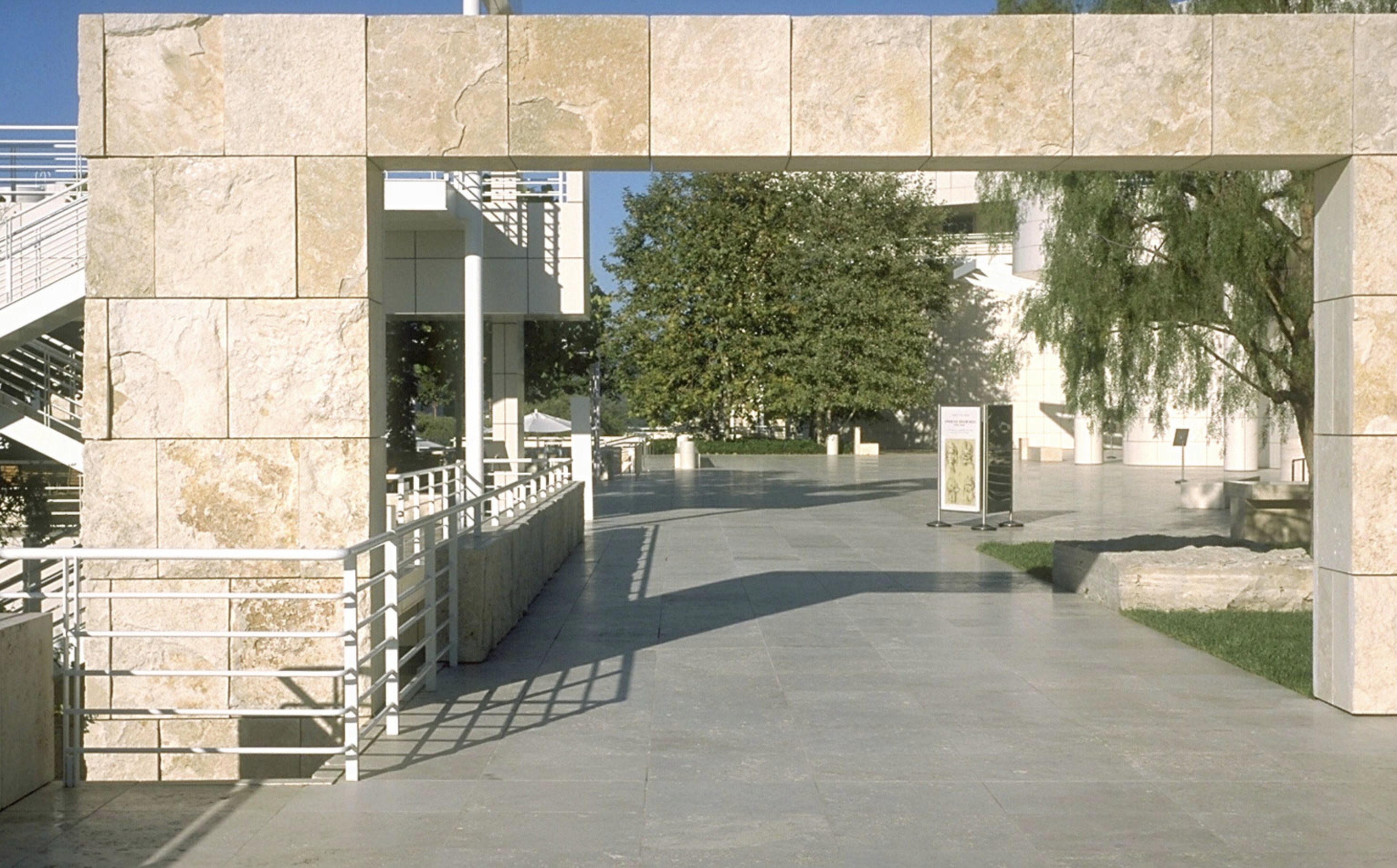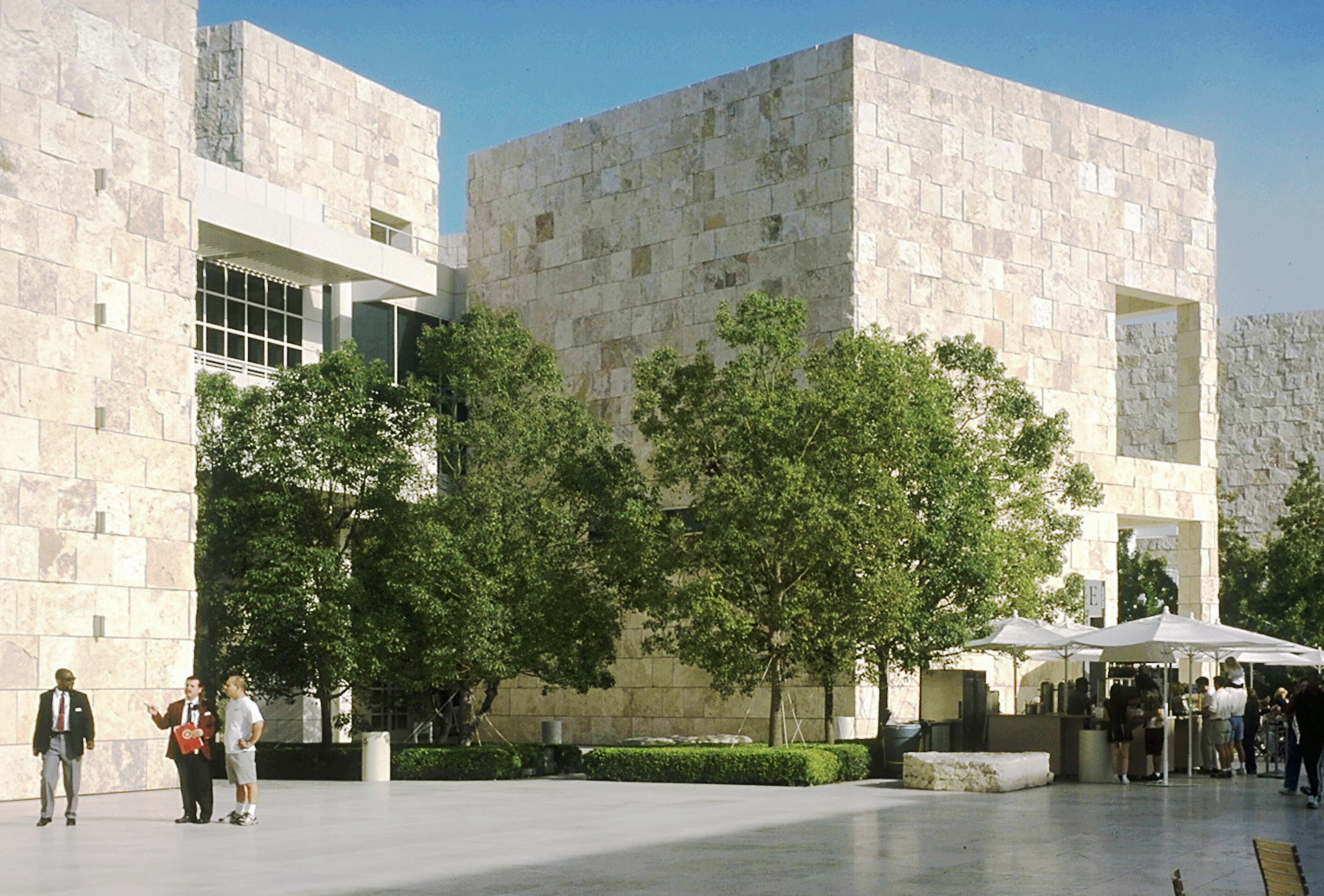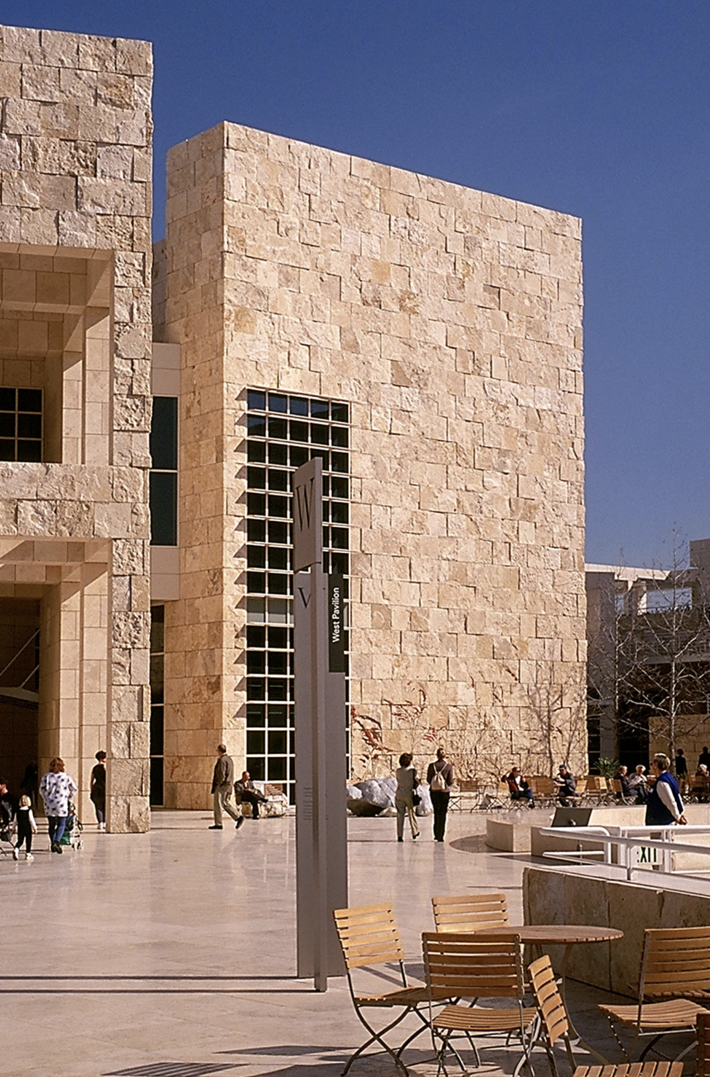 Meier's design for the Getty Center exhibits significant departures from his previous work. One example involves his decision to create an assemblage of buildings instead of a stand-alone structure. This decision forced him to consider urban-planning concerns, such as the relationship of buildings and the nature and sequencing of their interstitial spaces. His response is a 24-acre campus emphasizing freedom of movement between human-scaled edifices and through generous courtyards and gardens. His choice of materials represents another change. Local resident groups rejected both Meier's signature white-enameled exteriors and his alternate choice of metal panels but approved his later recommendation of rough-cleft Italian travertine for rectilinear surfaces and complementary colored enameled aluminum panels for the curvilinear areas. Cutting the fossilized stone into 30-inch blocks to conform to the grid used as the basis of the Getty design presented another challenge, requiring the invention of a guillotine-type apparatus. In addition, Meier devised a method of supporting the cladding on metal plates, leaving open seams between blocks and space between waterproofed interior surfaces and the travertine, diverting rainfall behind the stone to protect the rough exterior from erosion. Meier's suspension of the travertine panels denies the weight and massing of masonry, prompting some critics to describe the stone as having a fake appearance. The nontraditional handling of the material does produce insubstantiality and unfortunate results in some areas, particularly in the surface irregularity of the tall piers in the garden courtyard, but overall, the effect of the travertine's variations in color and texture complements the tiled surfaces and contributes to the unified aesthetic of the complex.