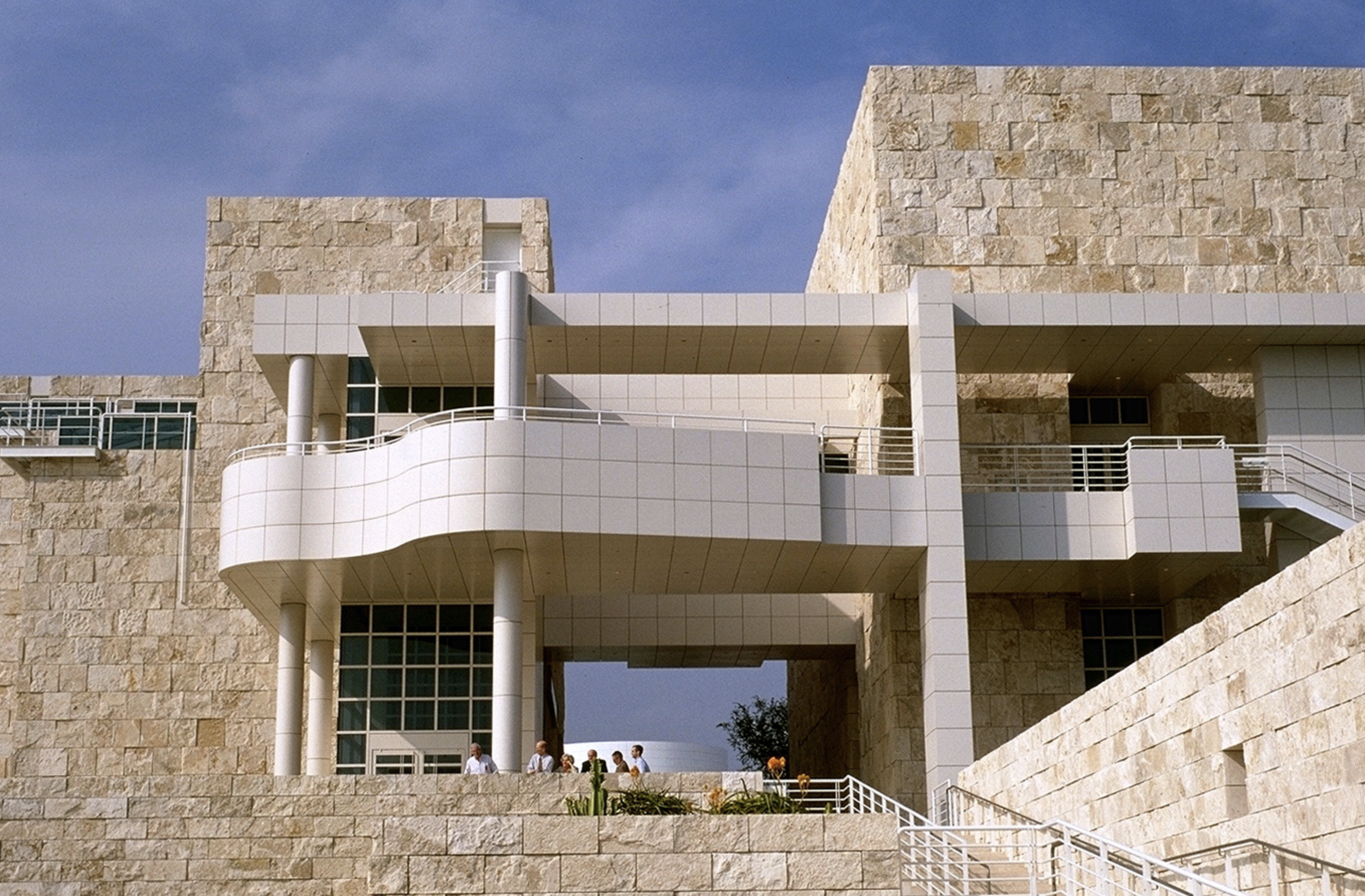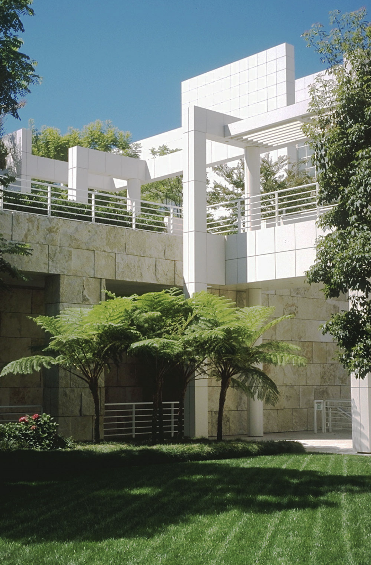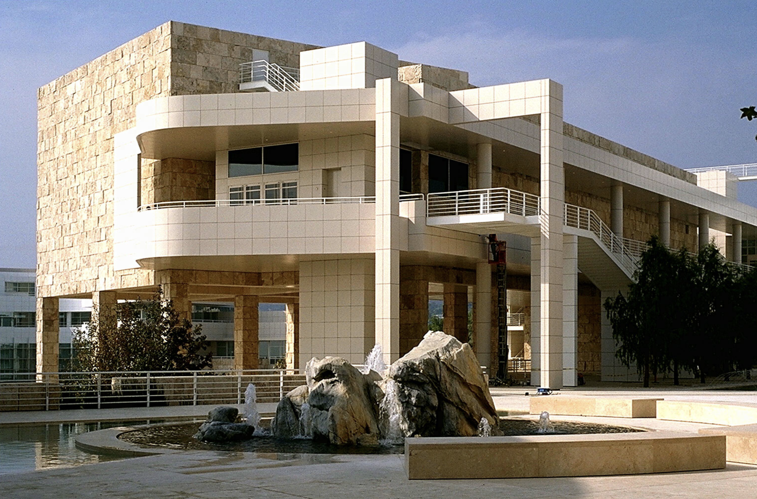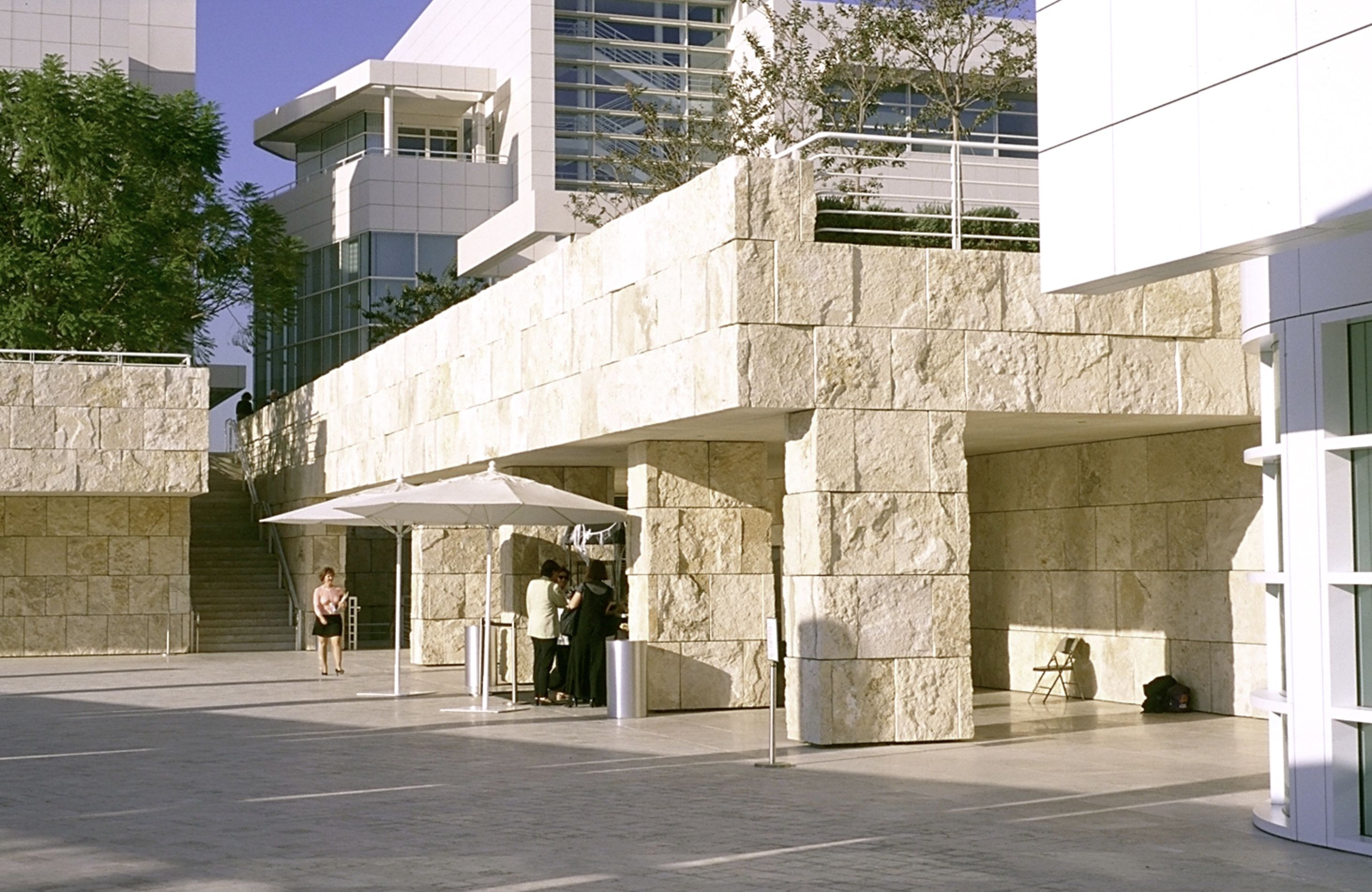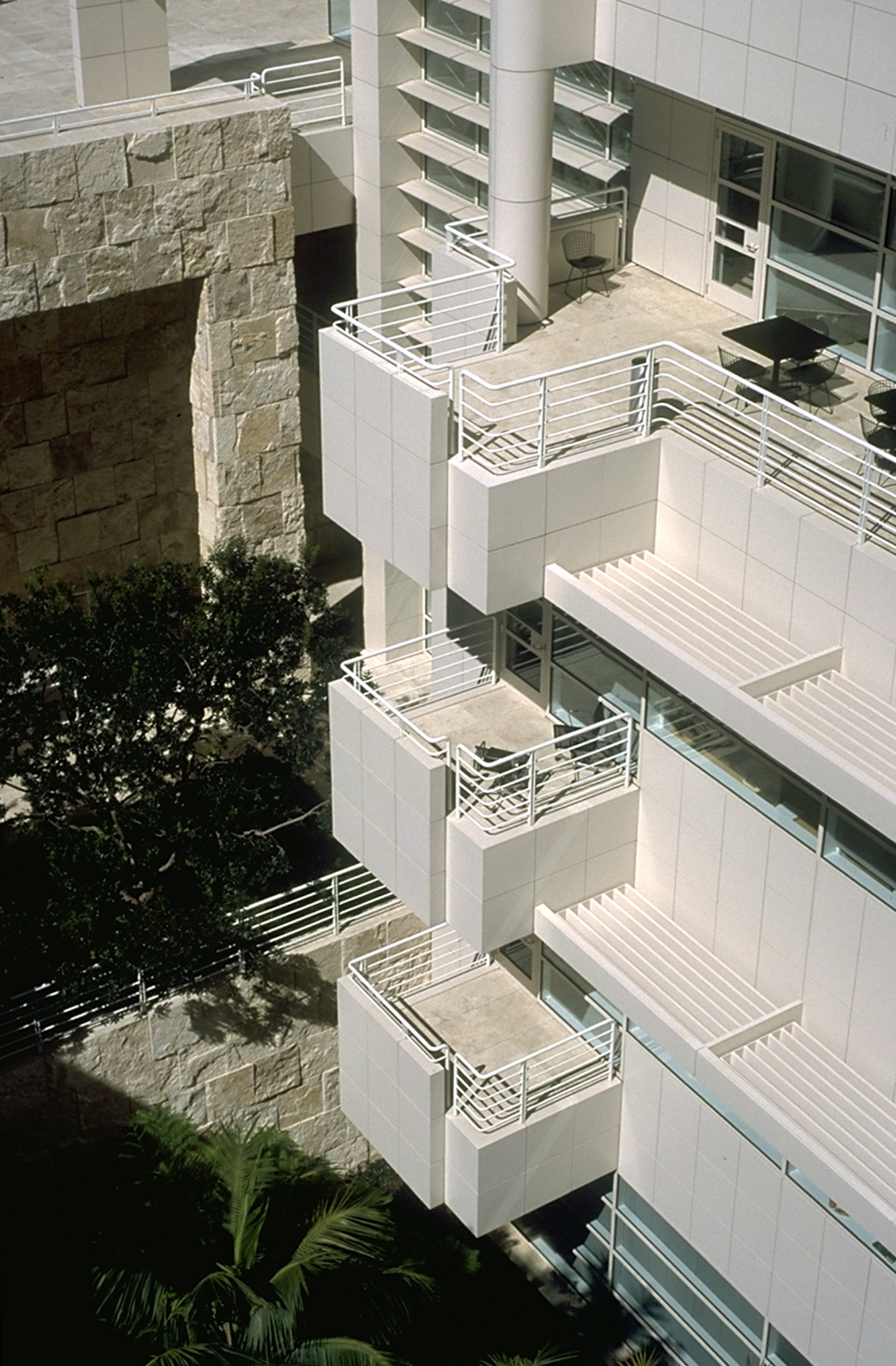 Meier's design for the Getty Center exhibits significant departures from his previous work. One example involves his decision to create an assemblage of buildings instead of a stand-alone structure. This decision forced him to consider urban-planning concerns, such as the relationship of buildings and the nature and sequencing of their interstitial spaces. His response is a 24-acre campus emphasizing freedom of movement between human-scaled edifices and through generous courtyards and gardens. His choice of materials represents another change. Local resident groups rejected both Meier's signature white-enameled exteriors and his alternate choice of metal panels but approved his later recommendation of rough-cleft Italian travertine for rectilinear surfaces and complementary colored enameled aluminum panels for the curvilinear areas. Cutting the fossilized stone into 30-inch blocks to conform to the grid used as the basis of the Getty design presented another challenge, requiring the invention of a guillotine-type apparatus. In addition, Meier devised a method of supporting the cladding on metal plates, leaving open seams between blocks and space between waterproofed interior surfaces and the travertine, diverting rainfall behind the stone to protect the rough exterior from erosion. Meier's suspension of the travertine panels denies the weight and massing of masonry, prompting some critics to describe the stone as having a fake appearance. The nontraditional handling of the material does produce insubstantiality and unfortunate results in some areas, particularly in the surface irregularity of the tall piers in the garden courtyard, but overall, the effect of the travertine's variations in color and texture complements the tiled surfaces and contributes to the unified aesthetic of the complex.
