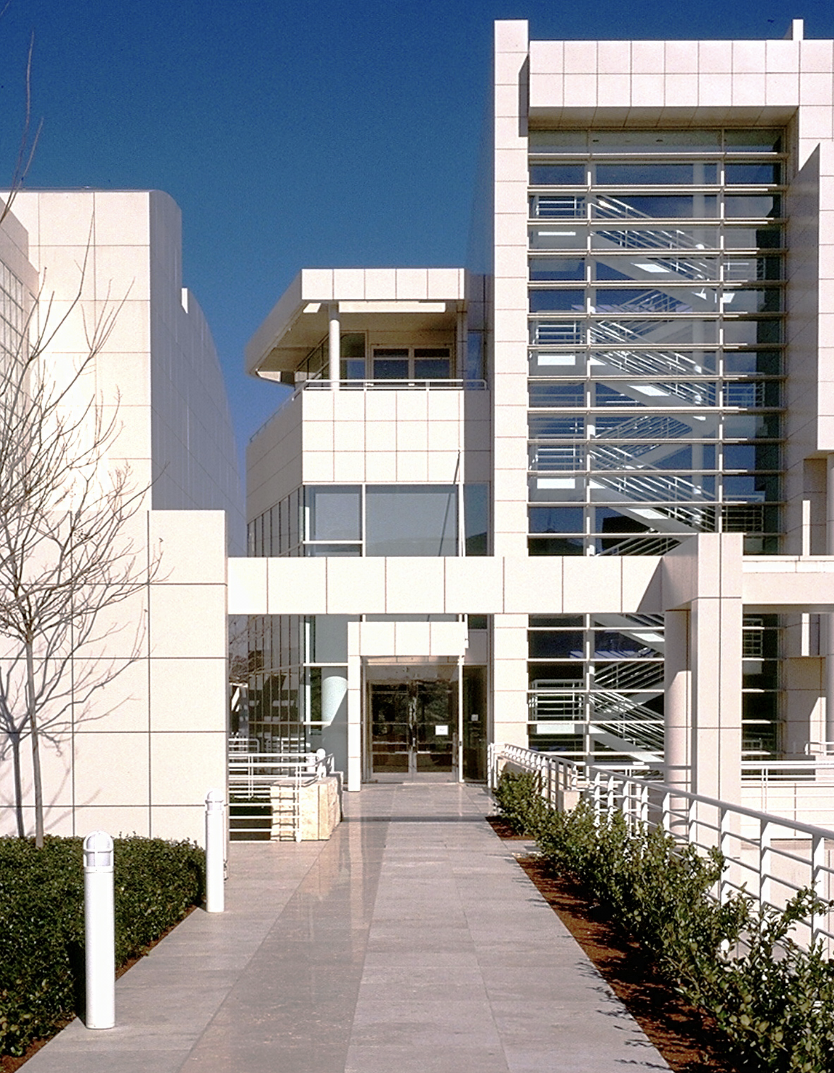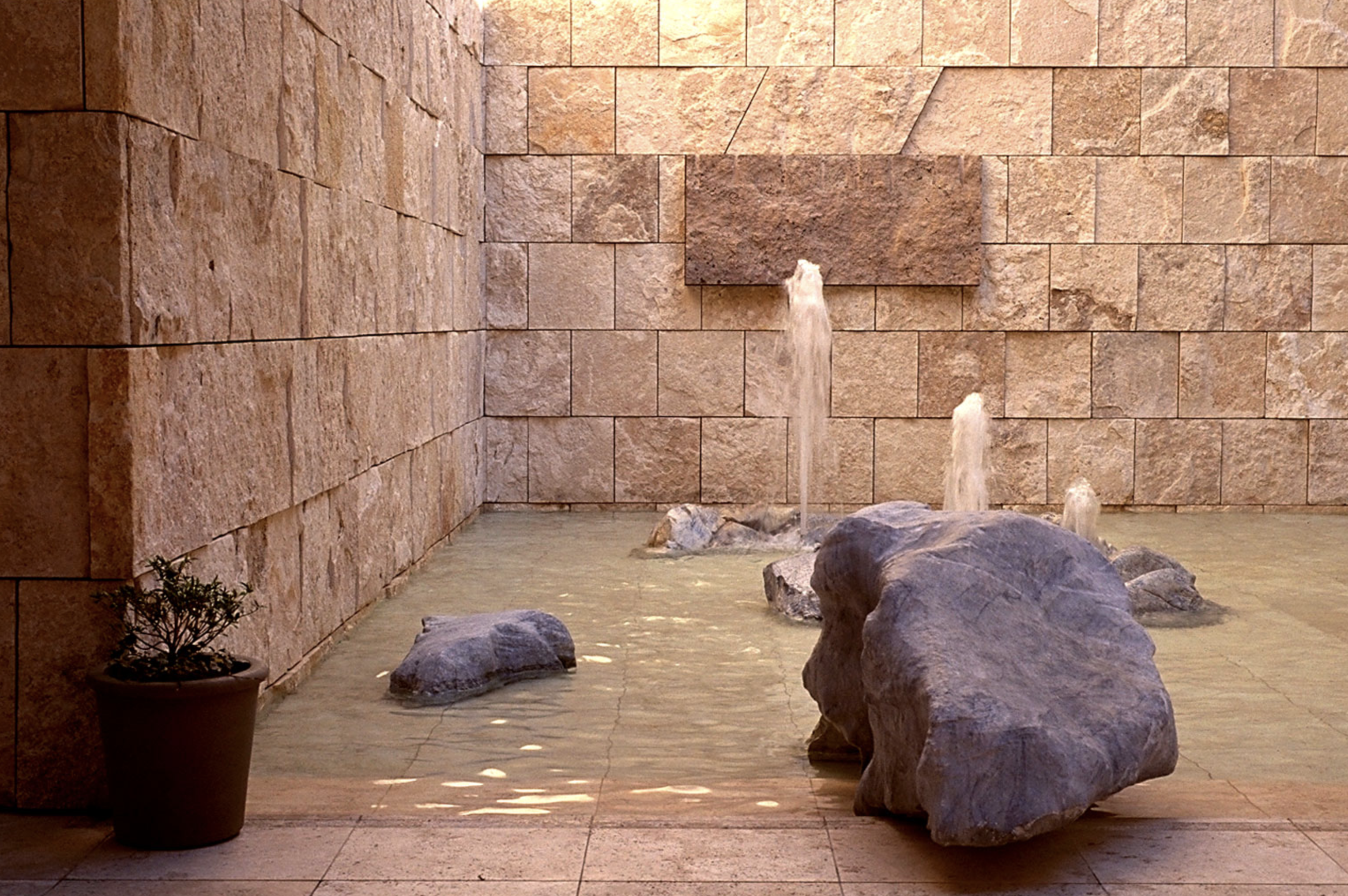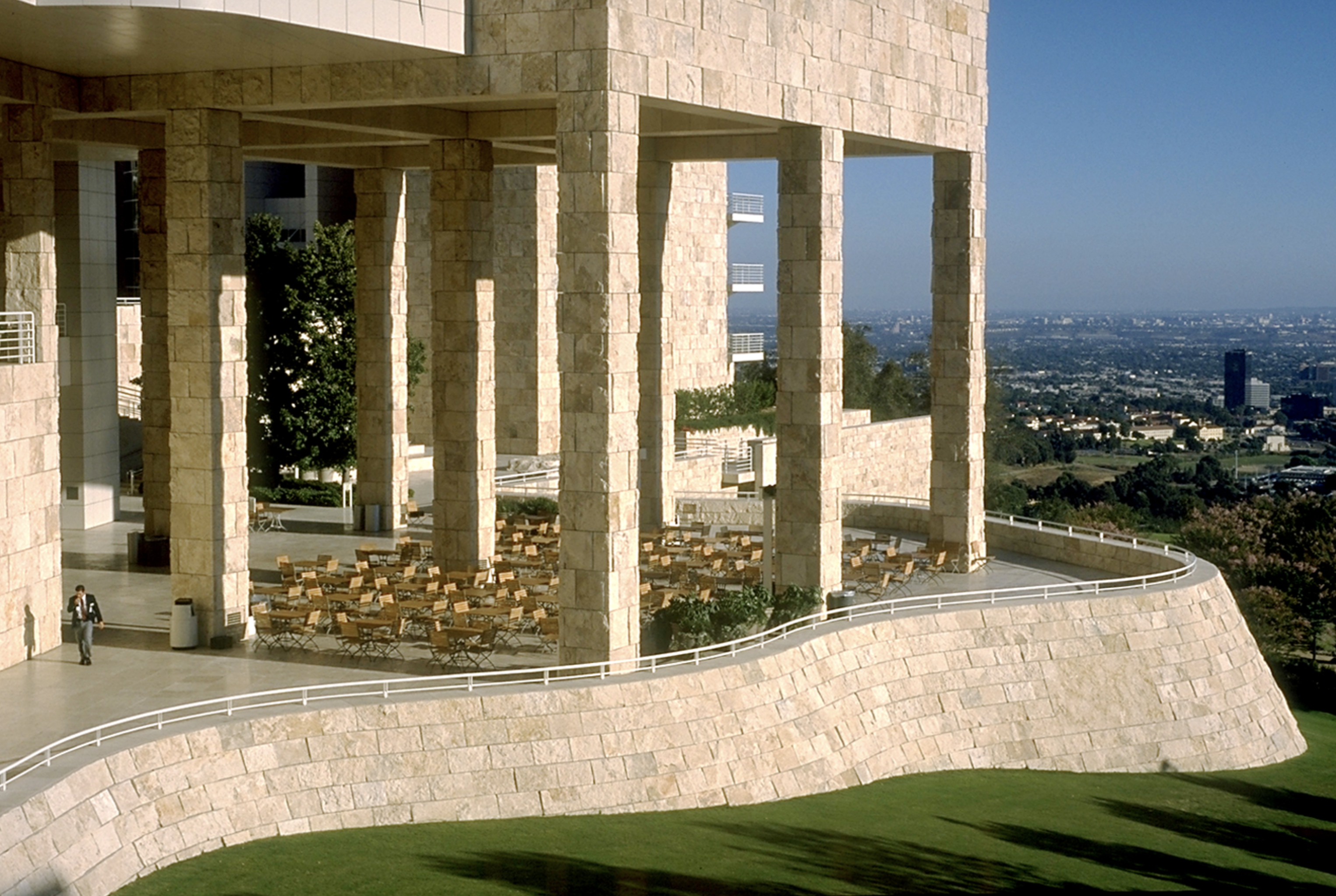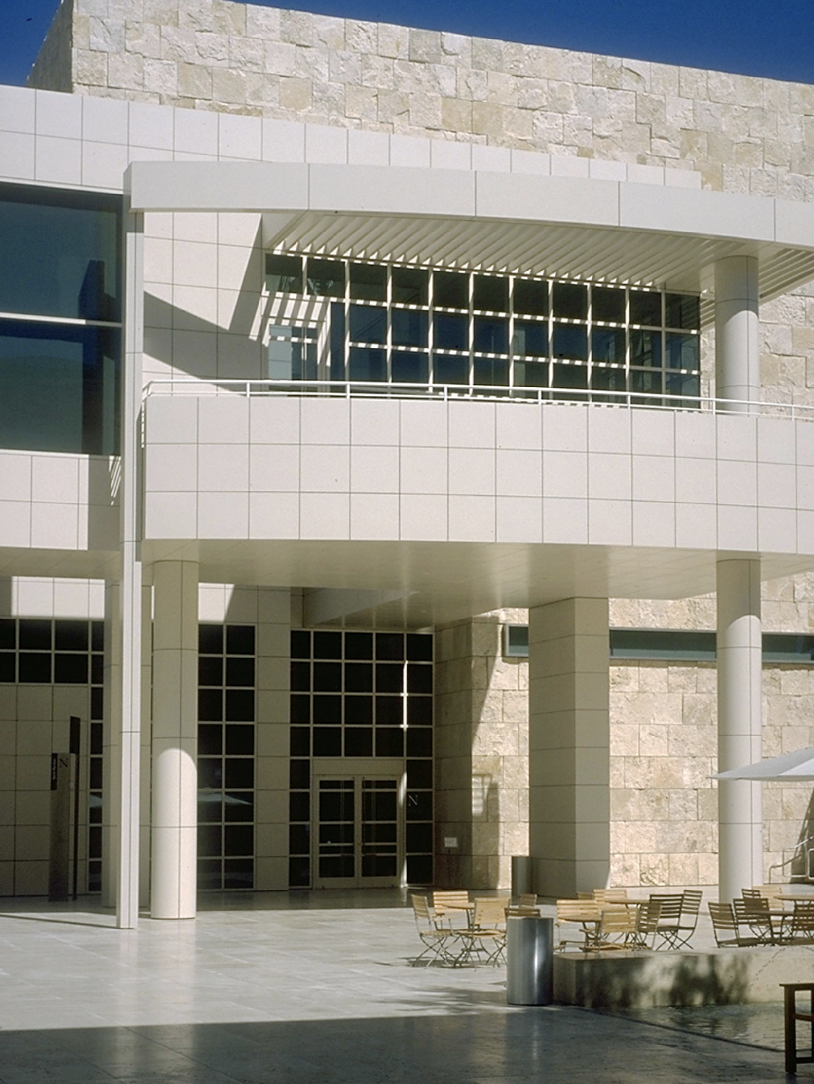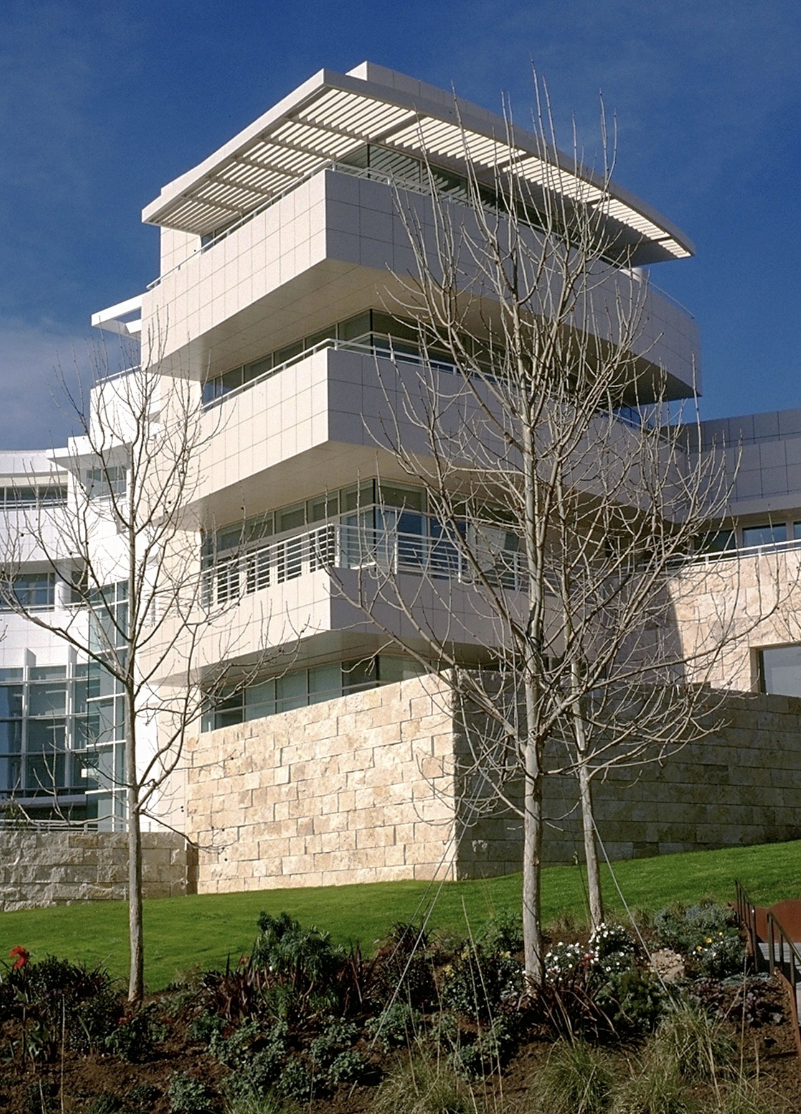 Meier's design for the Getty Center exhibits significant departures from his previous work. One example involves his decision to create an assemblage of buildings instead of a stand-alone structure. This decision forced him to consider urban-planning concerns, such as the relationship of buildings and the nature and sequencing of their interstitial spaces. His response is a 24-acre campus emphasizing freedom of movement between human-scaled edifices and through generous courtyards and gardens. His choice of materials represents another change. Local resident groups rejected both Meier's signature white-enameled exteriors and his alternate choice of metal panels but approved his later recommendation of rough-cleft Italian travertine for rectilinear surfaces and complementary colored enameled aluminum panels for the curvilinear areas. Cutting the fossilized stone into 30-inch blocks to conform to the grid used as the basis of the Getty design presented another challenge, requiring the invention of a guillotine-type apparatus. In addition, Meier devised a method of supporting the cladding on metal plates, leaving open seams between blocks and space between waterproofed interior surfaces and the travertine, diverting rainfall behind the stone to protect the rough exterior from erosion. Meier's suspension of the travertine panels denies the weight and massing of masonry, prompting some critics to describe the stone as having a fake appearance. The nontraditional handling of the material does produce insubstantiality and unfortunate results in some areas, particularly in the surface irregularity of the tall piers in the garden courtyard, but overall, the effect of the travertine's variations in color and texture complements the tiled surfaces and contributes to the unified aesthetic of the complex.