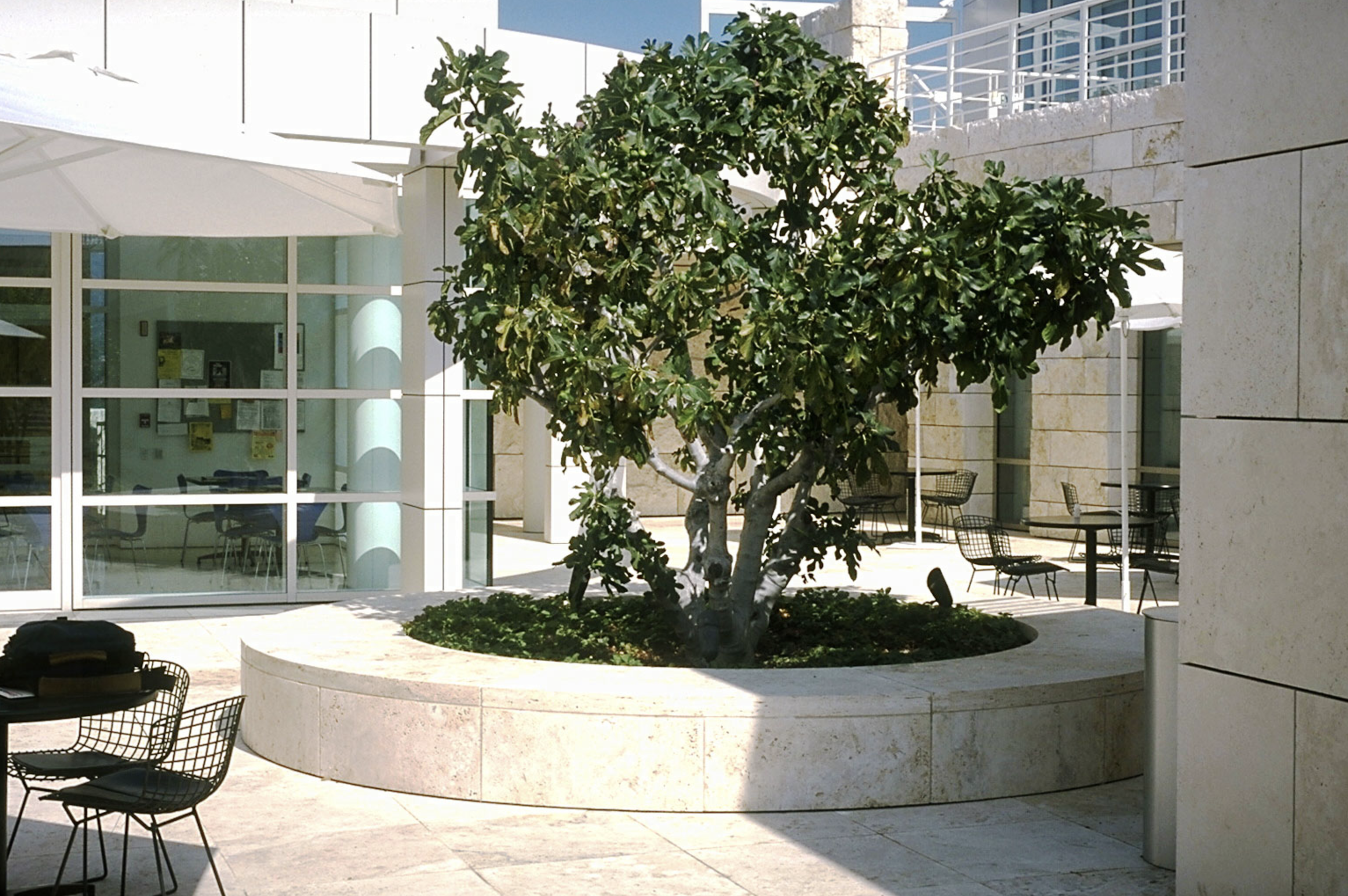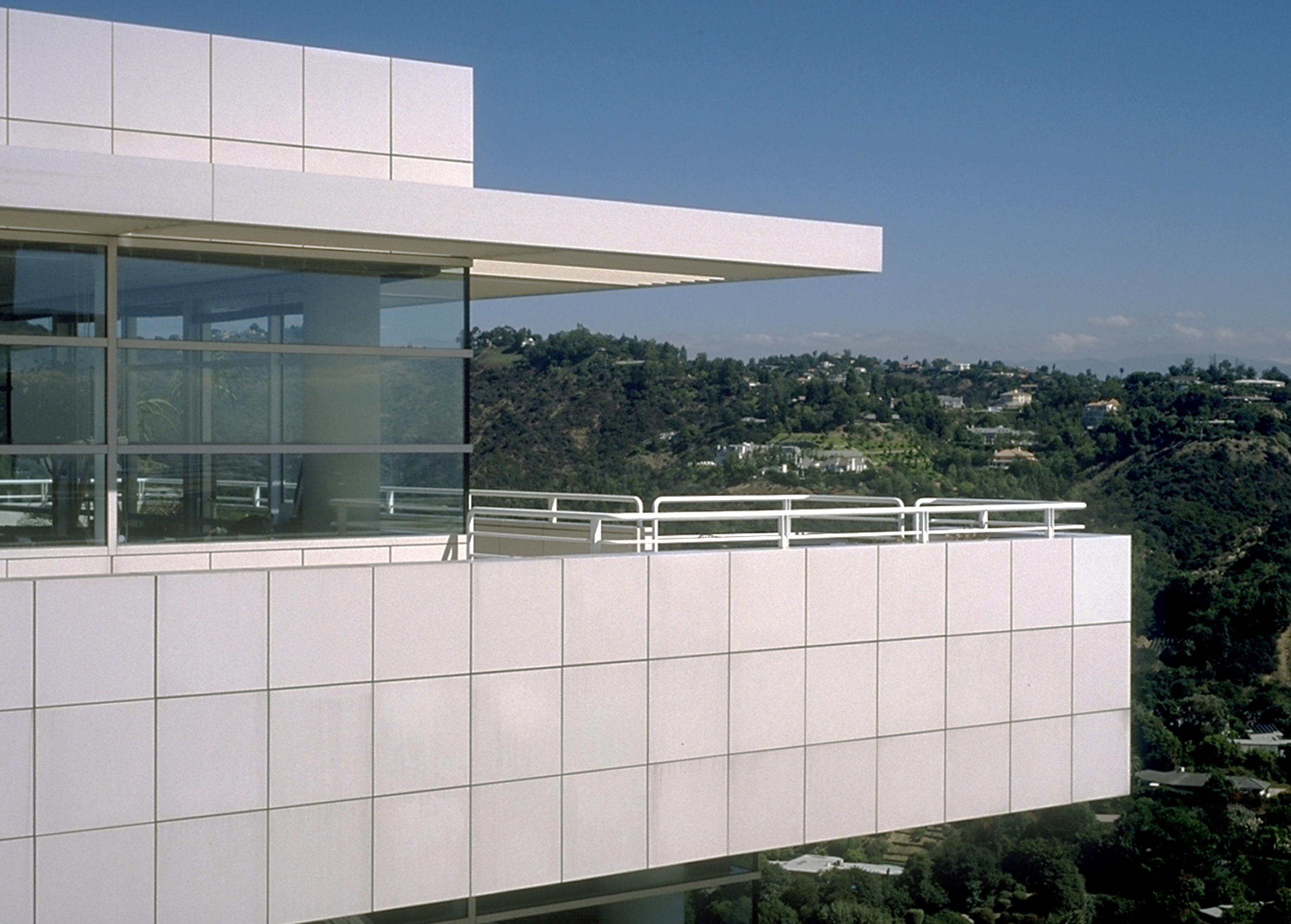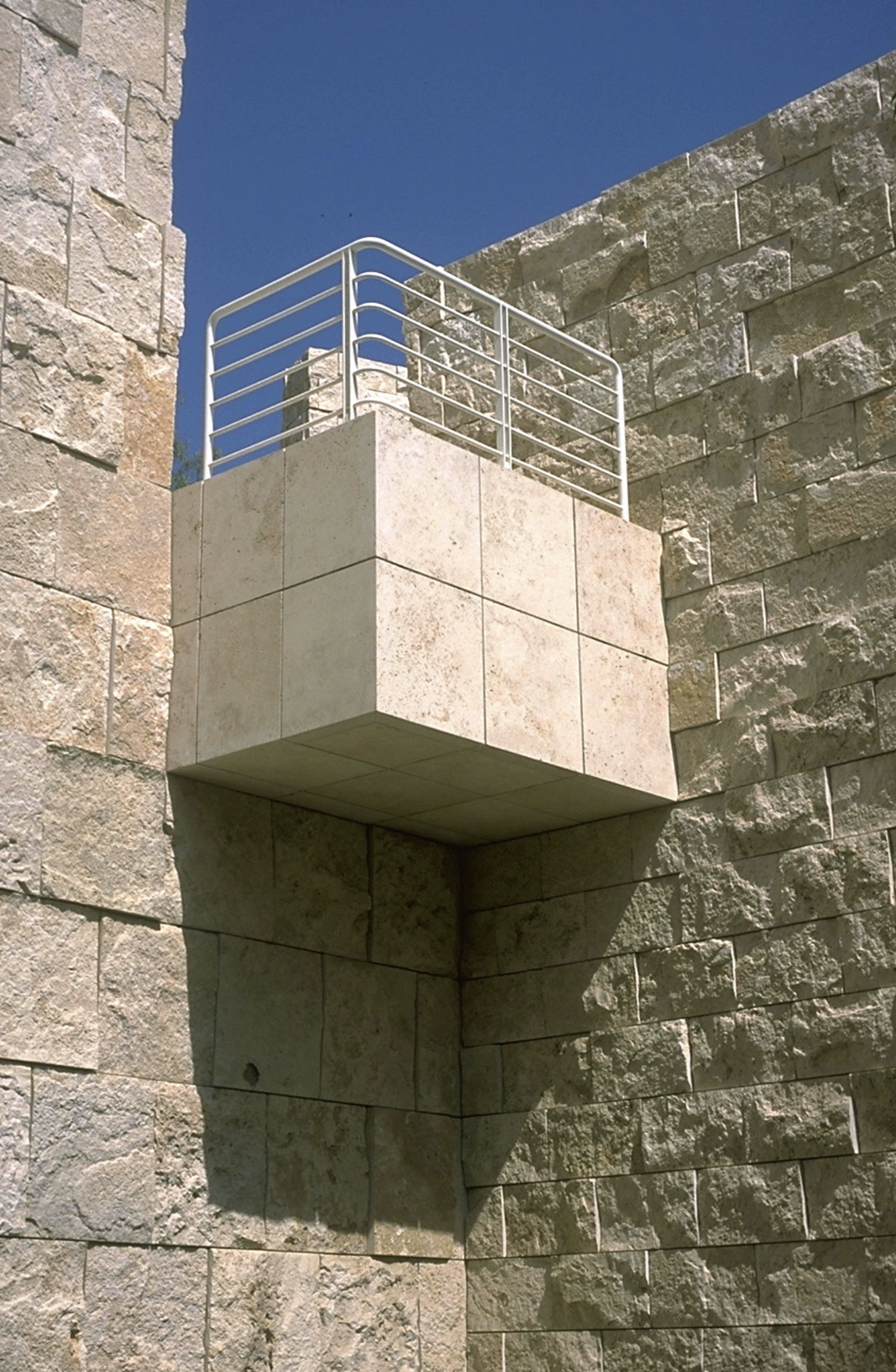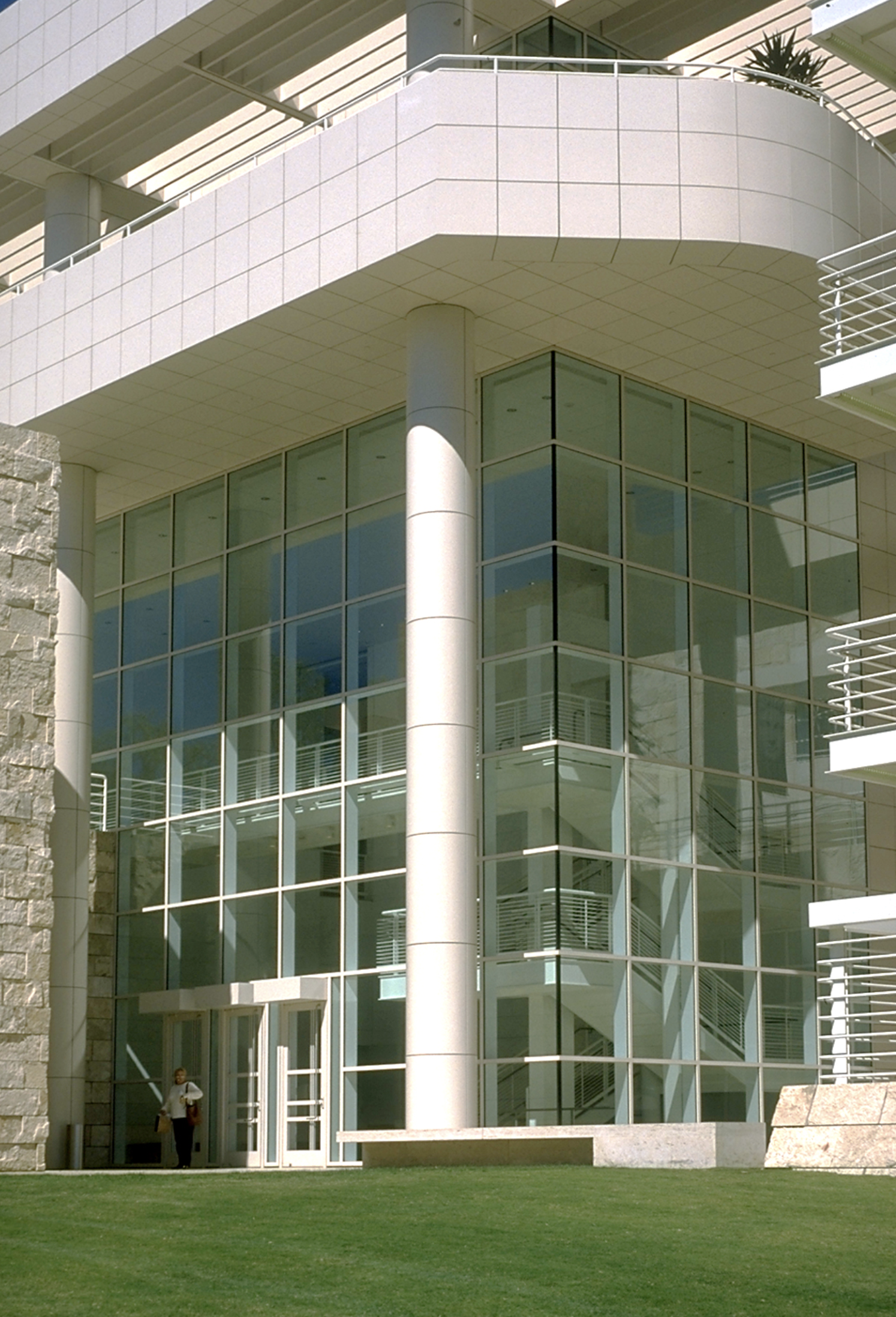 Meier's design for the Getty Center exhibits significant departures from his previous work. One example involves his decision to create an assemblage of buildings instead of a stand-alone structure. This decision forced him to consider urban-planning concerns, such as the relationship of buildings and the nature and sequencing of their interstitial spaces. His response is a 24-acre campus emphasizing freedom of movement between human-scaled edifices and through generous courtyards and gardens. His choice of materials represents another change. Local resident groups rejected both Meier's signature white-enameled exteriors and his alternate choice of metal panels but approved his later recommendation of rough-cleft Italian travertine for rectilinear surfaces and complementary colored enameled aluminum panels for the curvilinear areas. Cutting the fossilized stone into 30-inch blocks to conform to the grid used as the basis of the Getty design presented another challenge, requiring the invention of a guillotine-type apparatus. In addition, Meier devised a method of supporting the cladding on metal plates, leaving open seams between blocks and space between waterproofed interior surfaces and the travertine, diverting rainfall behind the stone to protect the rough exterior from erosion. Meier's suspension of the travertine panels denies the weight and massing of masonry, prompting some critics to describe the stone as having a fake appearance. The nontraditional handling of the material does produce insubstantiality and unfortunate results in some areas, particularly in the surface irregularity of the tall piers in the garden courtyard, but overall, the effect of the travertine's variations in color and texture complements the tiled surfaces and contributes to the unified aesthetic of the complex.