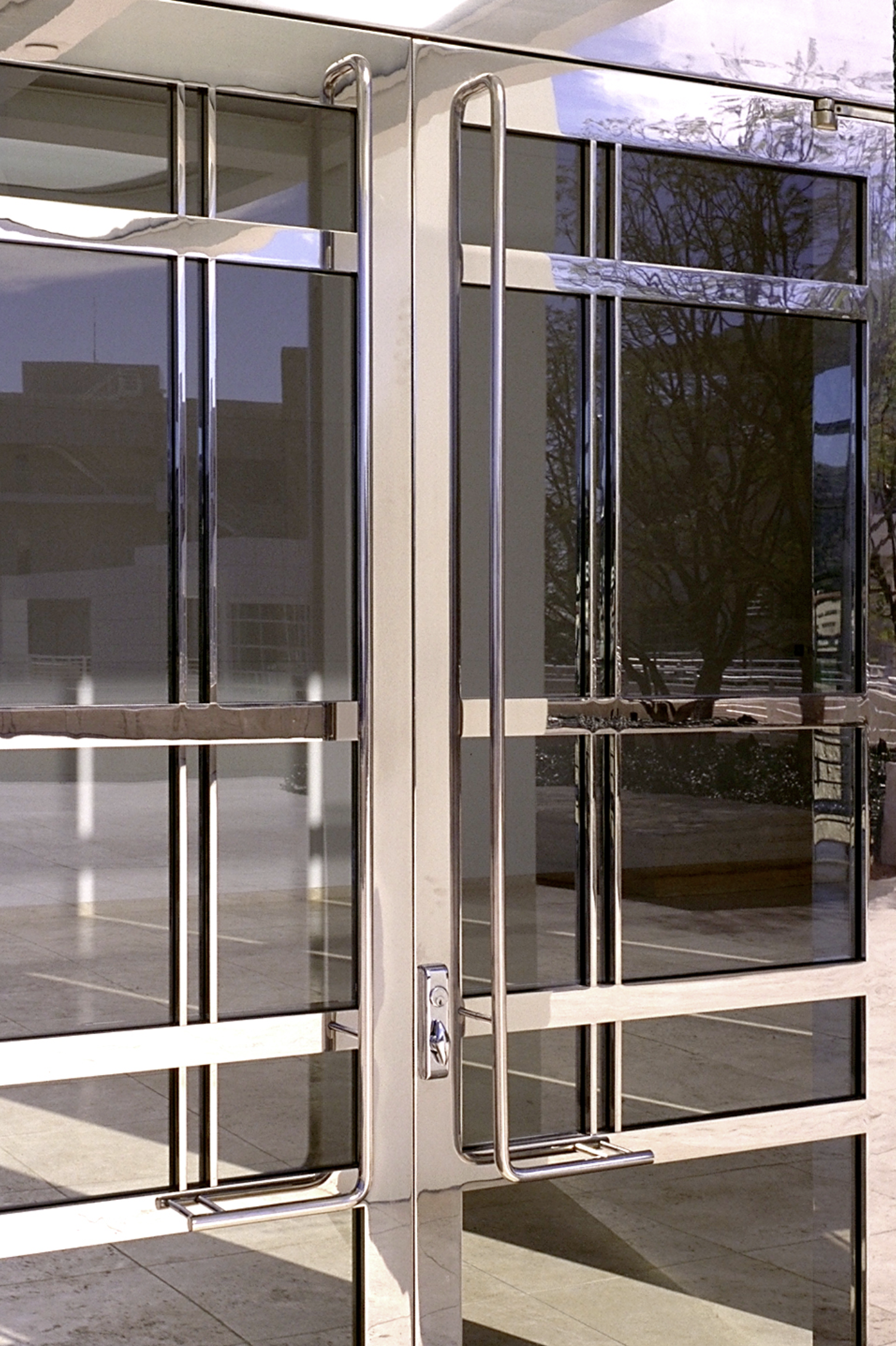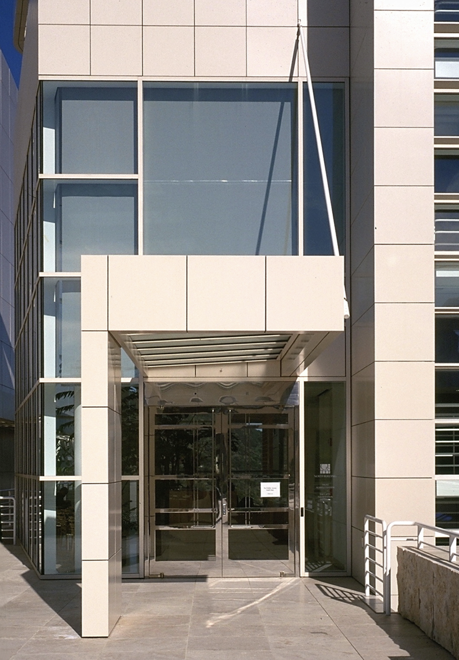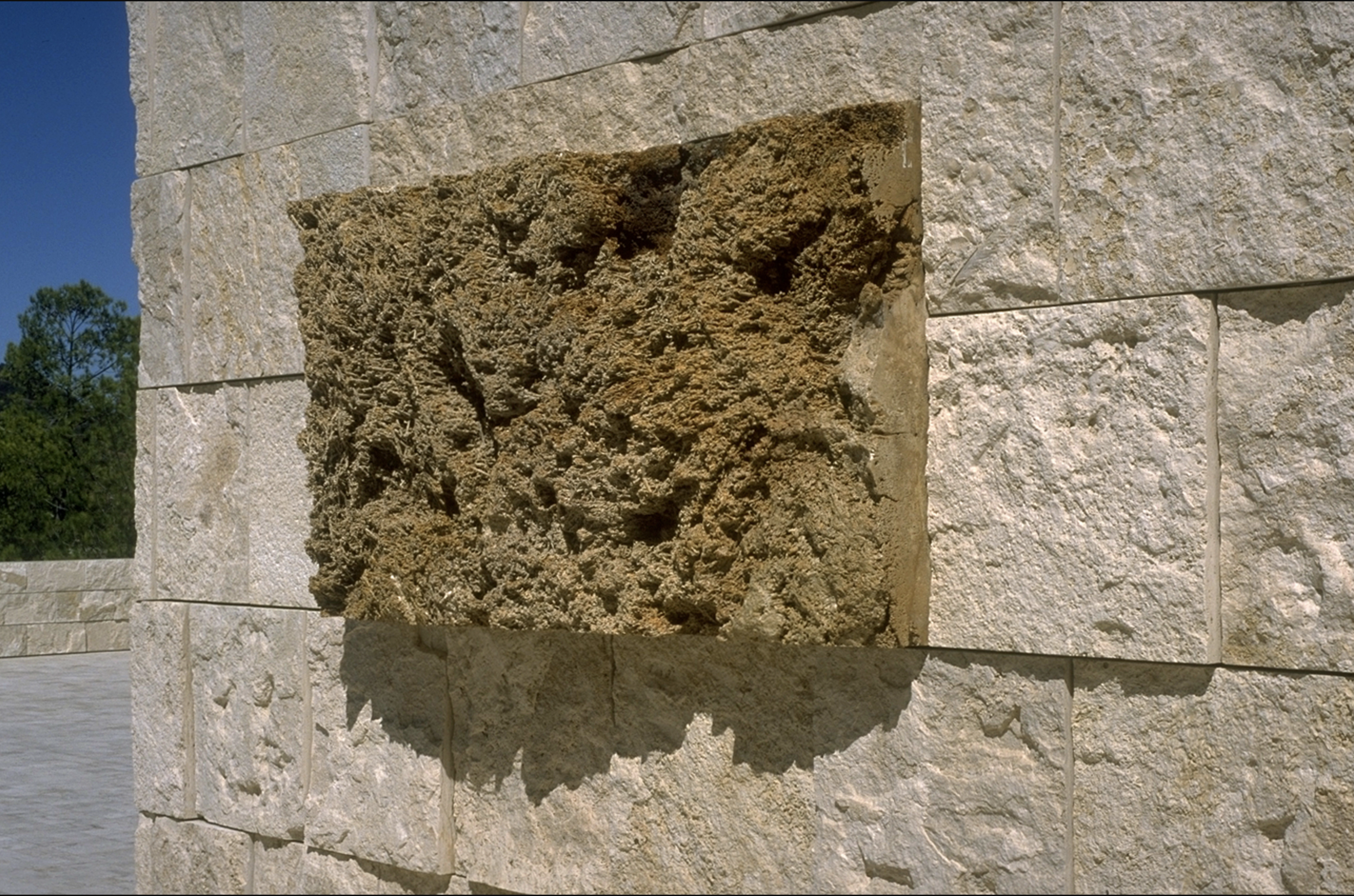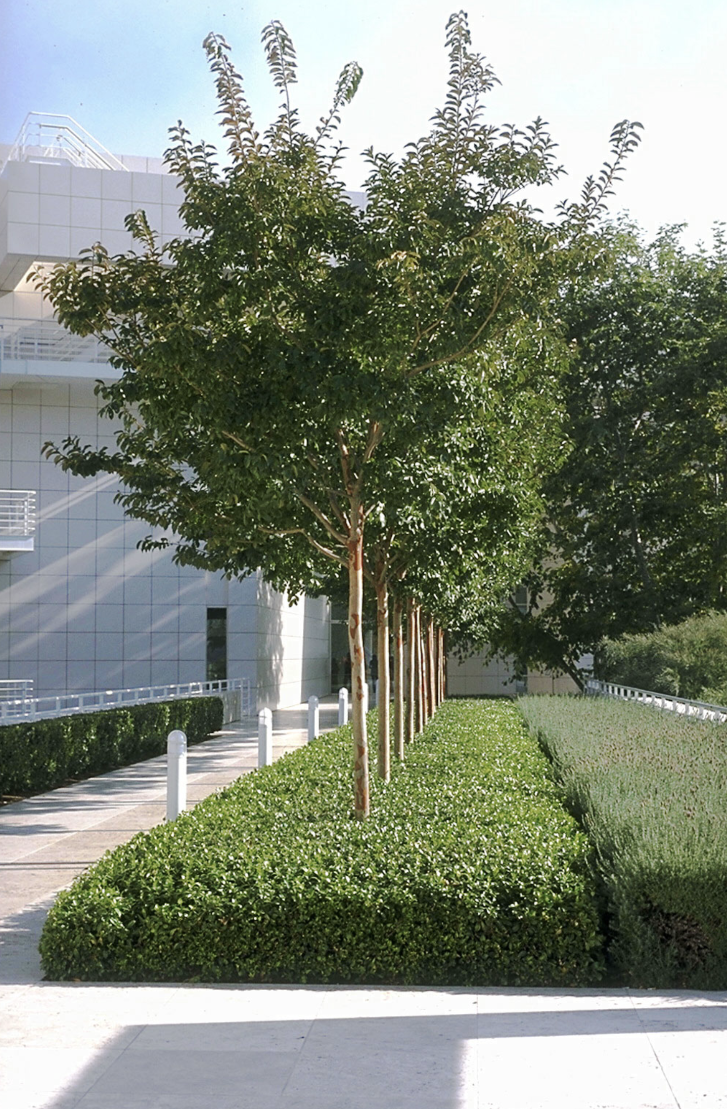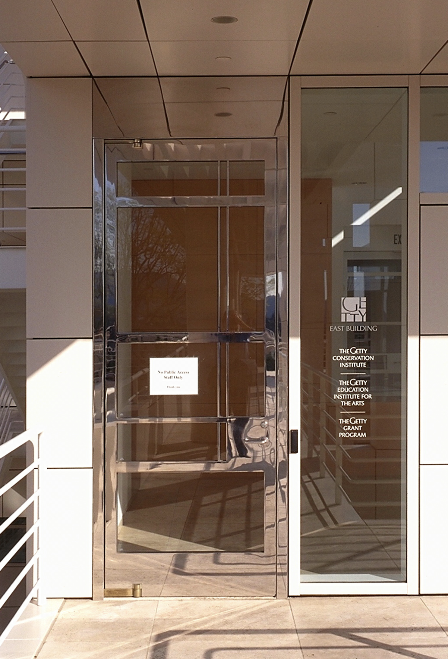 Meier's design for the Getty Center exhibits significant departures from his previous work. One example involves his decision to create an assemblage of buildings instead of a stand-alone structure. This decision forced him to consider urban-planning concerns, such as the relationship of buildings and the nature and sequencing of their interstitial spaces. His response is a 24-acre campus emphasizing freedom of movement between human-scaled edifices and through generous courtyards and gardens. His choice of materials represents another change. Local resident groups rejected both Meier's signature white-enameled exteriors and his alternate choice of metal panels but approved his later recommendation of rough-cleft Italian travertine for rectilinear surfaces and complementary colored enameled aluminum panels for the curvilinear areas. Cutting the fossilized stone into 30-inch blocks to conform to the grid used as the basis of the Getty design presented another challenge, requiring the invention of a guillotine-type apparatus. In addition, Meier devised a method of supporting the cladding on metal plates, leaving open seams between blocks and space between waterproofed interior surfaces and the travertine, diverting rainfall behind the stone to protect the rough exterior from erosion. Meier's suspension of the travertine panels denies the weight and massing of masonry, prompting some critics to describe the stone as having a fake appearance. The nontraditional handling of the material does produce insubstantiality and unfortunate results in some areas, particularly in the surface irregularity of the tall piers in the garden courtyard, but overall, the effect of the travertine's variations in color and texture complements the tiled surfaces and contributes to the unified aesthetic of the complex.