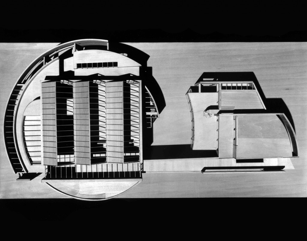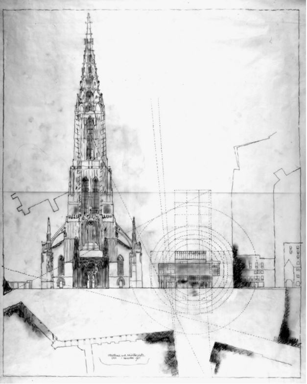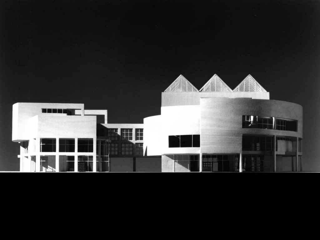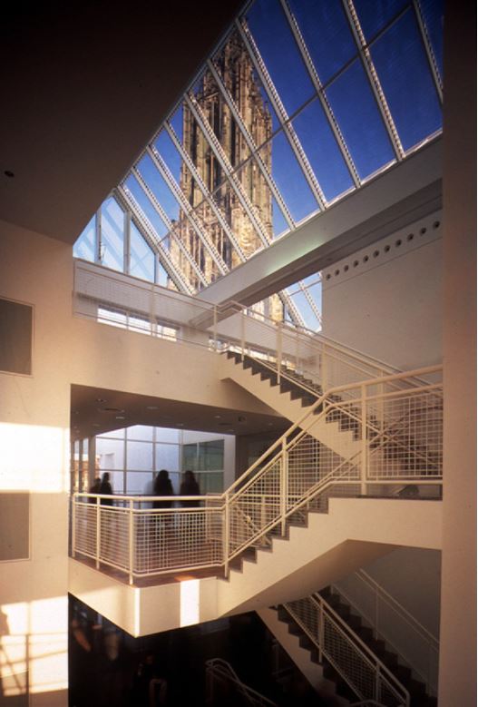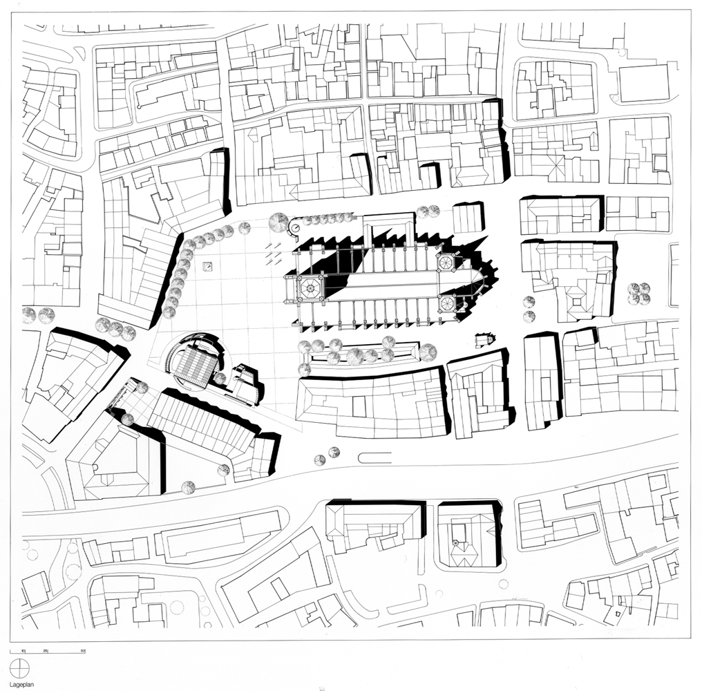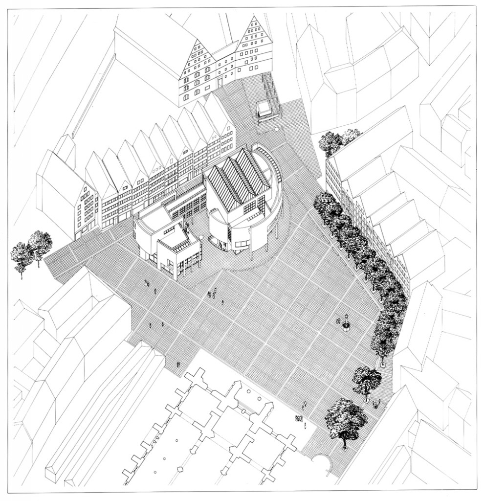 The main drum form functions as a counterpoint to the cathedral as one enters the square from the west and southwest. An asymmetrical stair and a freestanding elevator afford access from the ground floor to the lecture hall and exhibition spaces above, while a loggia/bridge at the upper level links the restaurant to the entry foyer on the ground floor and the exhibition spaces above.
