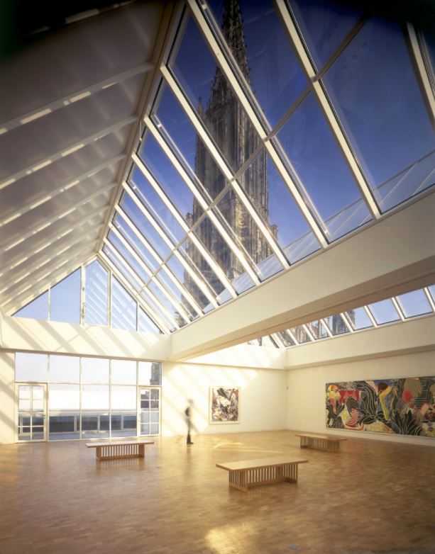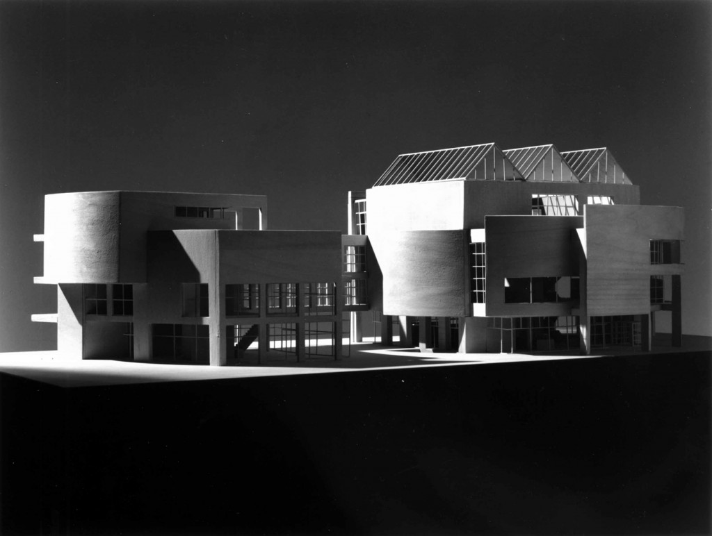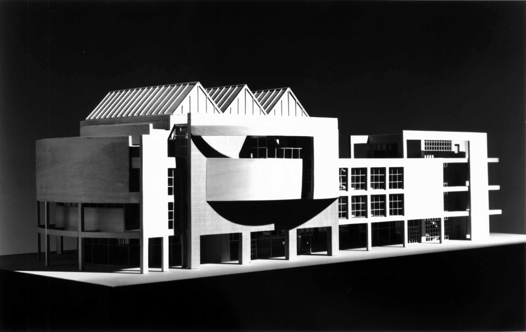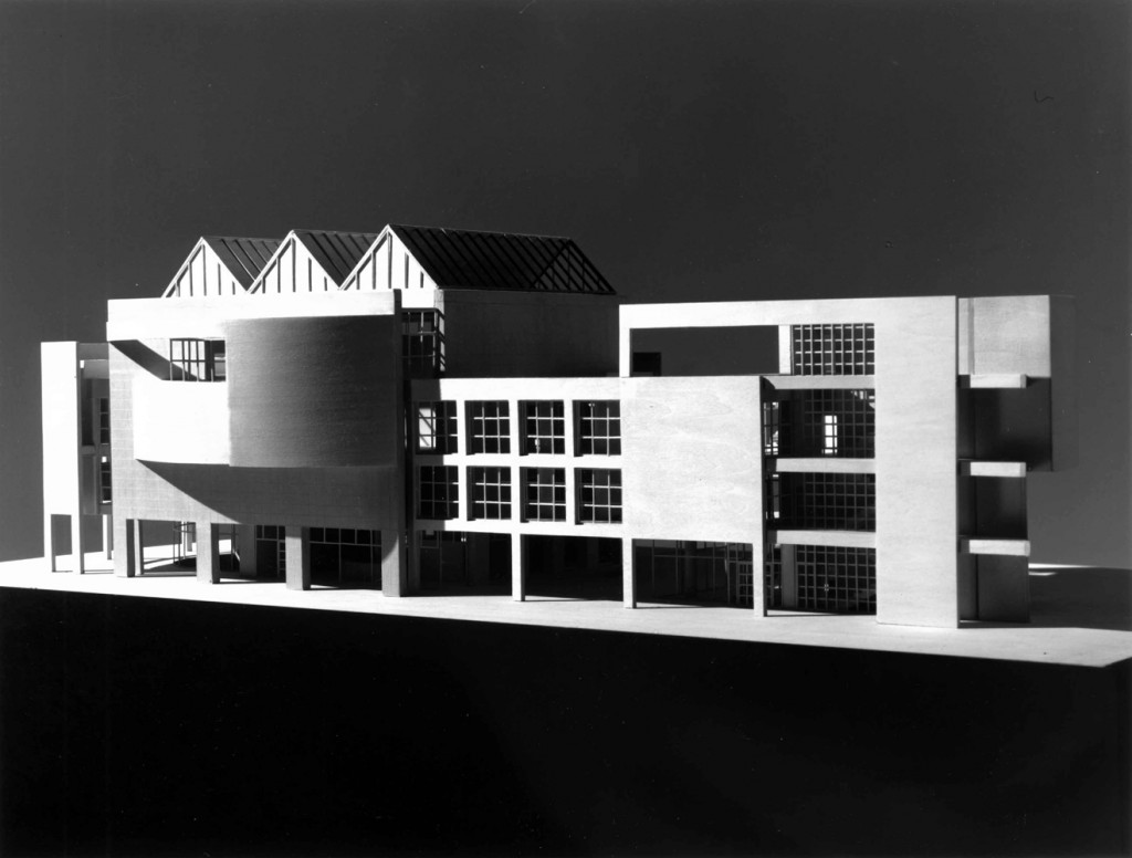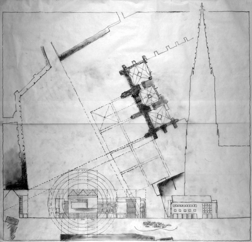 The main drum form functions as a counterpoint to the cathedral as one enters the square from the west and southwest. An asymmetrical stair and a freestanding elevator afford access from the ground floor to the lecture hall and exhibition spaces above, while a loggia/bridge at the upper level links the restaurant to the entry foyer on the ground floor and the exhibition spaces above.
