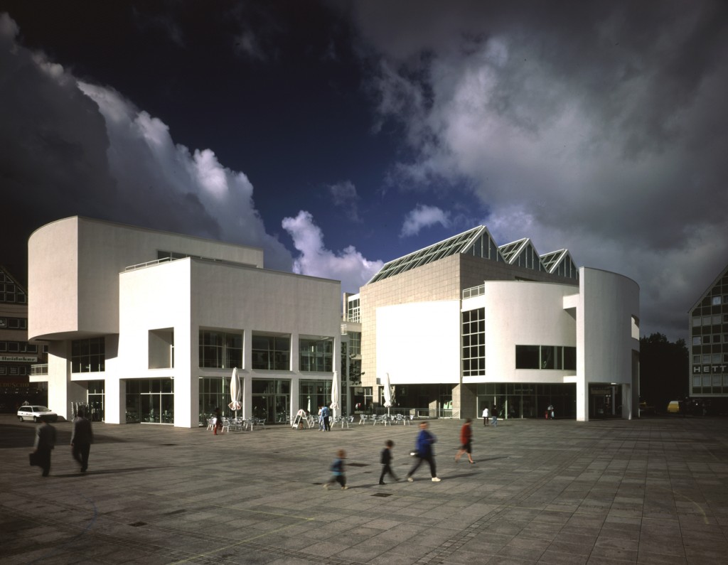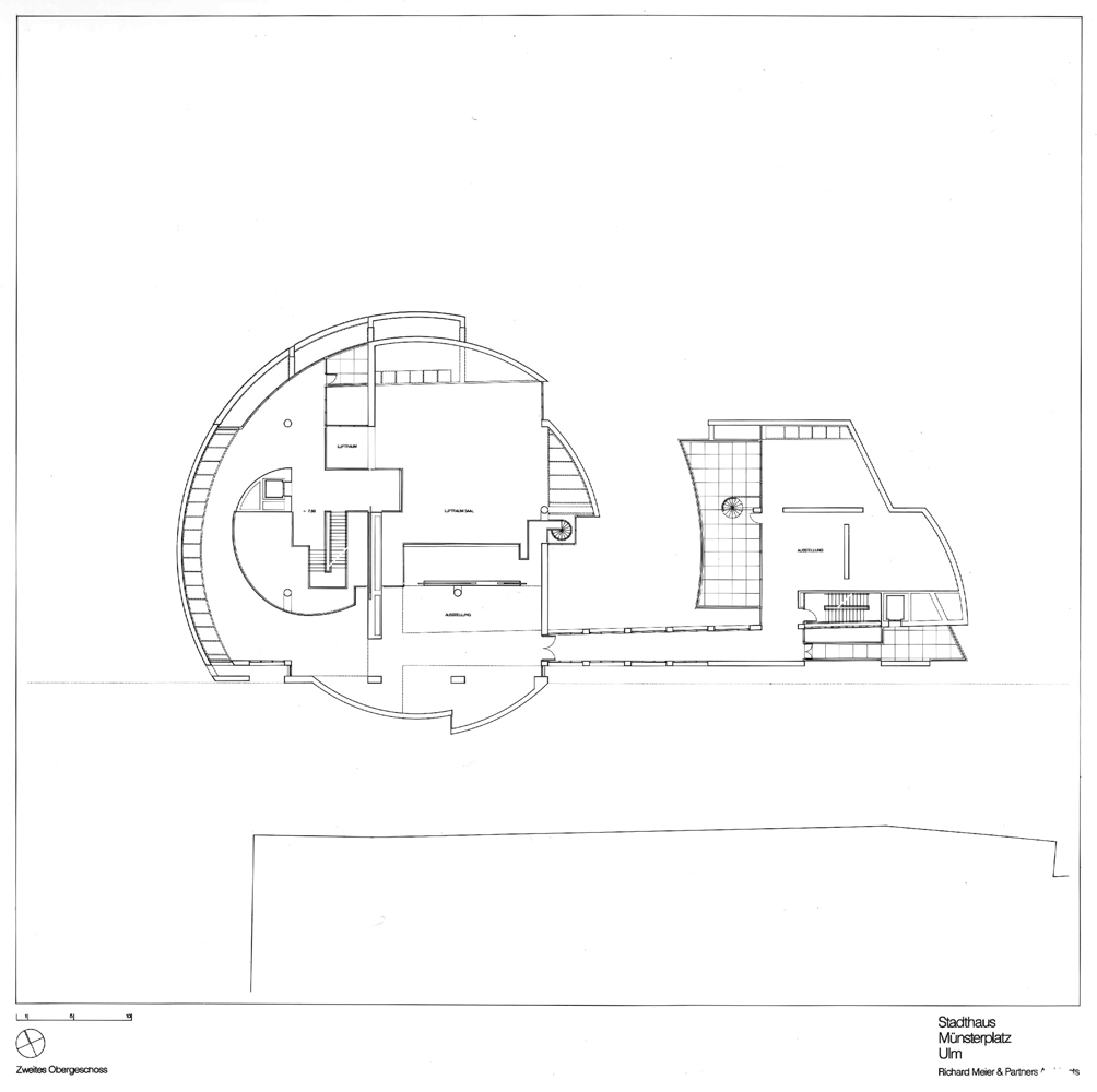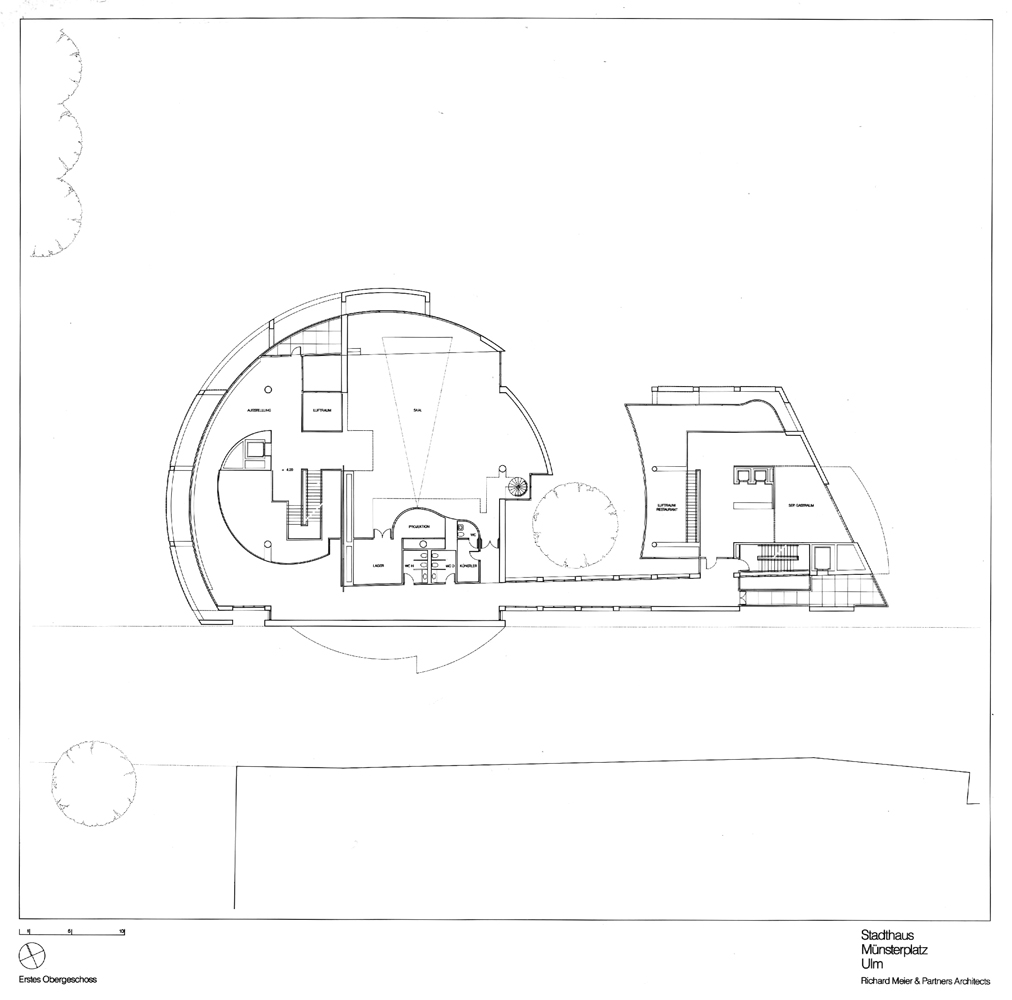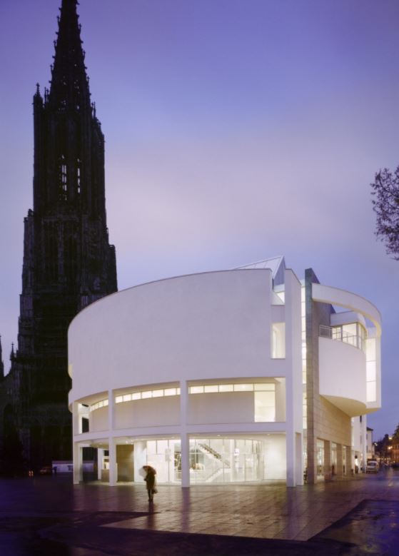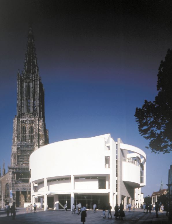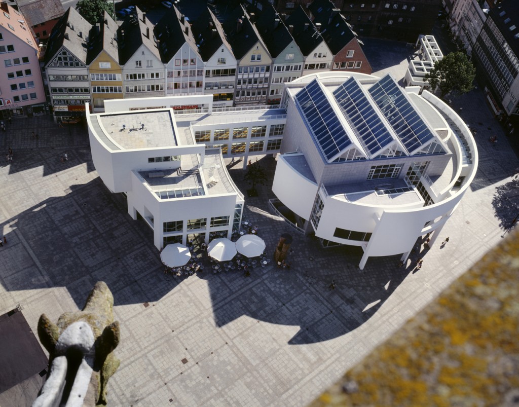 Conceived as a programmatic and cultural complement to Ulm’s Münsterplatz and the historic mass of its cathedral, this Stadthaus establishes a modest, secular, civic presence within the main square of the city. The building houses a visitors’ center, a ticket office, and a café terrace on the ground floor, and a top-lit, multilevel gallery space-cum-lecture hall on the floors above. With its striking cylindrical form capped by three prominent roof skylights, the building imparts a decisively civic character to the mainly commercial frontage of the square.