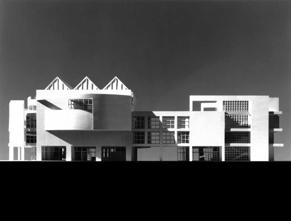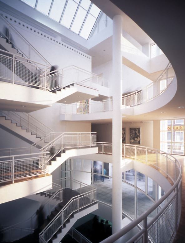 The main body of the building derives its form from the geometry of the cathedral and the square. It is based on a nine-square structural bay system augmented on three sides by concentric peripheral walls modified and curtailed by intersecting axes and regulating lines.