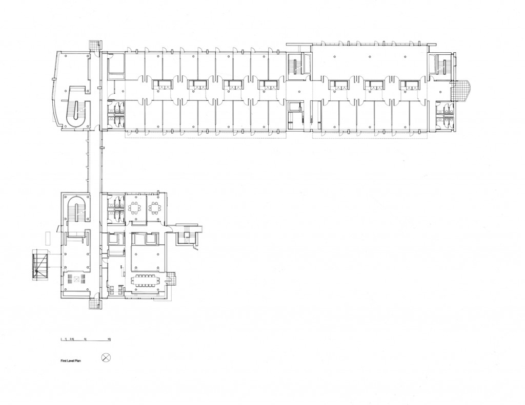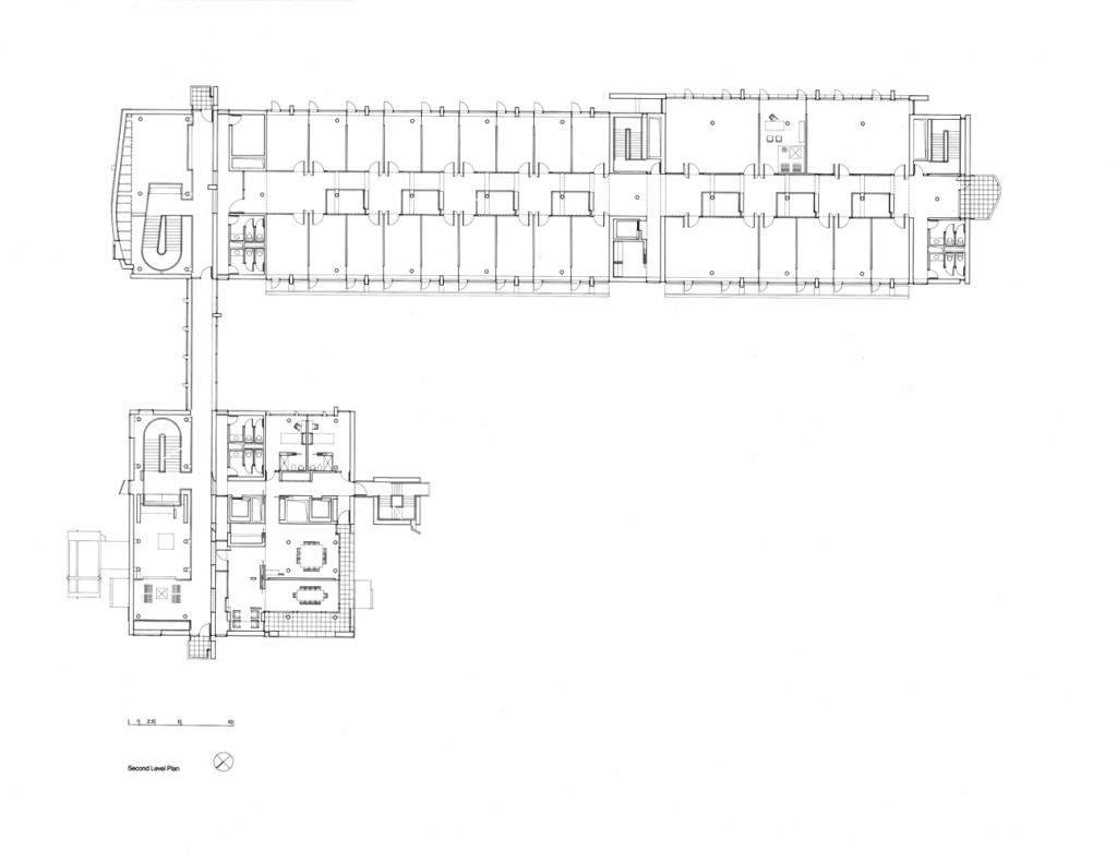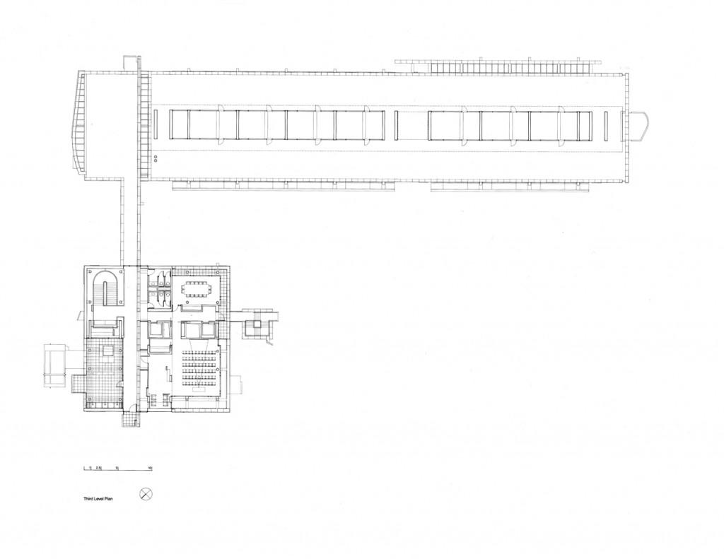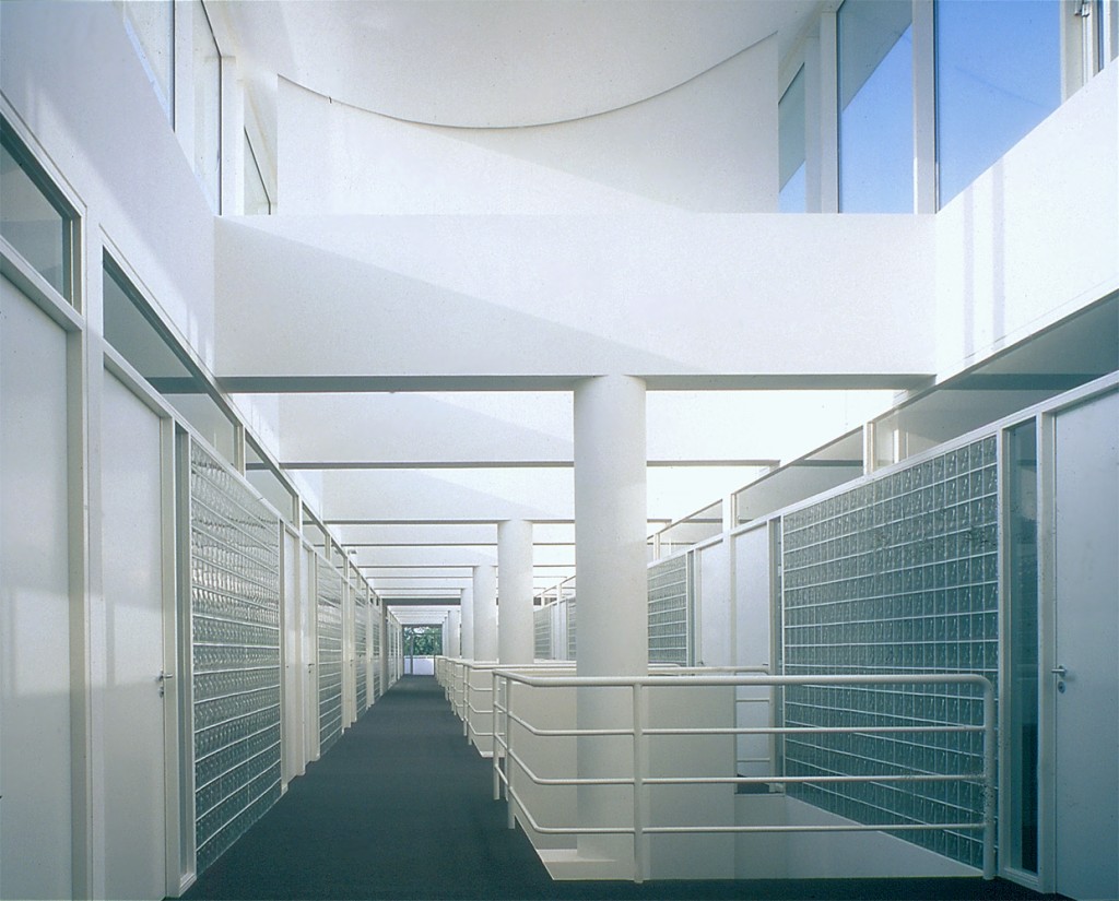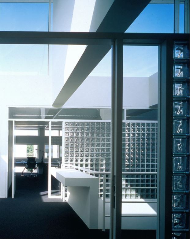 The two-story elevated office slab has two main entrances: one at the northeast end with an honorific stair, echoing a similar feature in the reception building, and another at midpoint equipped with an independent elevator core serving the executive offices in the southwest half of the slab. Both the executive and the staff offices are served from top-lit, double-height, double-loaded corridors with continuous access on one side and passerelles to office clusters on the other. The voids between passerelles illuminate lower corridors and unify the internal space.