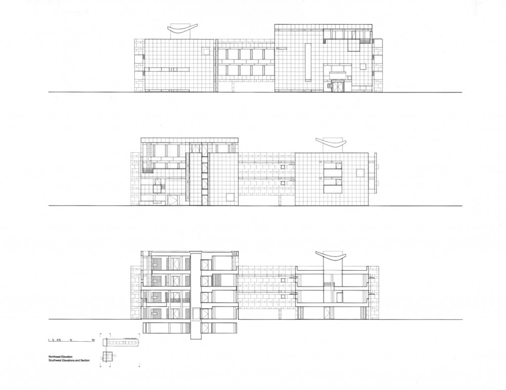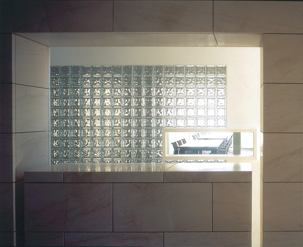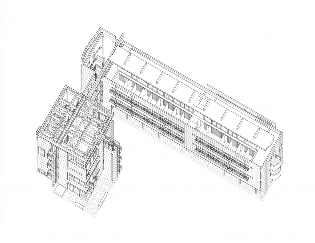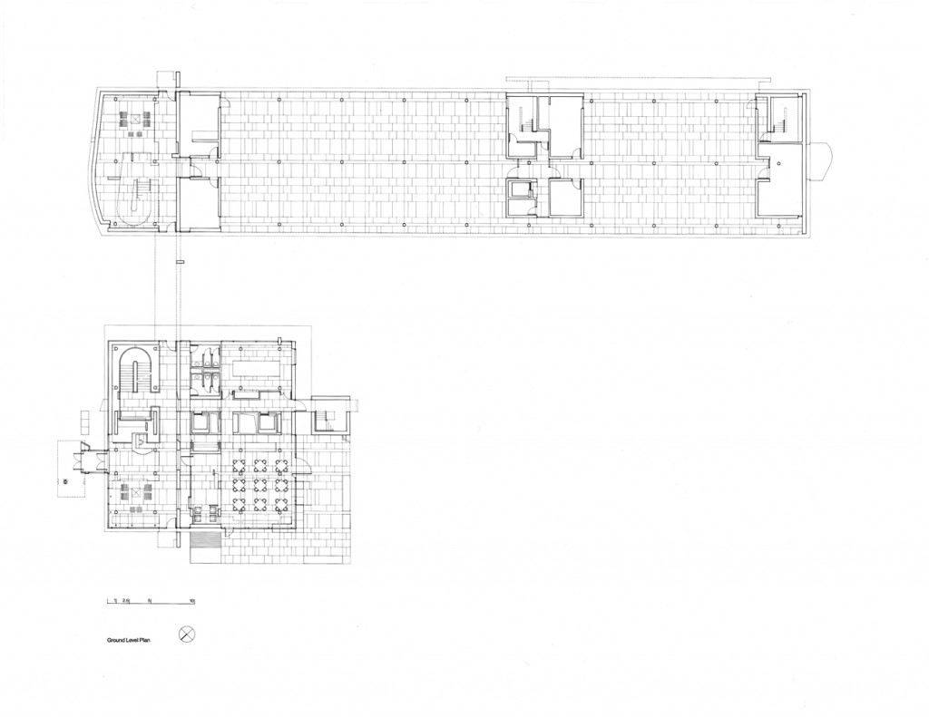 The two-story elevated office slab has two main entrances: one at the northeast end with an honorific stair, echoing a similar feature in the reception building, and another at midpoint equipped with an independent elevator core serving the executive offices in the southwest half of the slab. Both the executive and the staff offices are served from top-lit, double-height, double-loaded corridors with continuous access on one side and passerelles to office clusters on the other. The voids between passerelles illuminate lower corridors and unify the internal space.