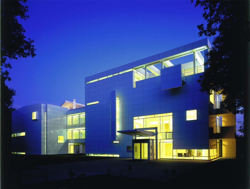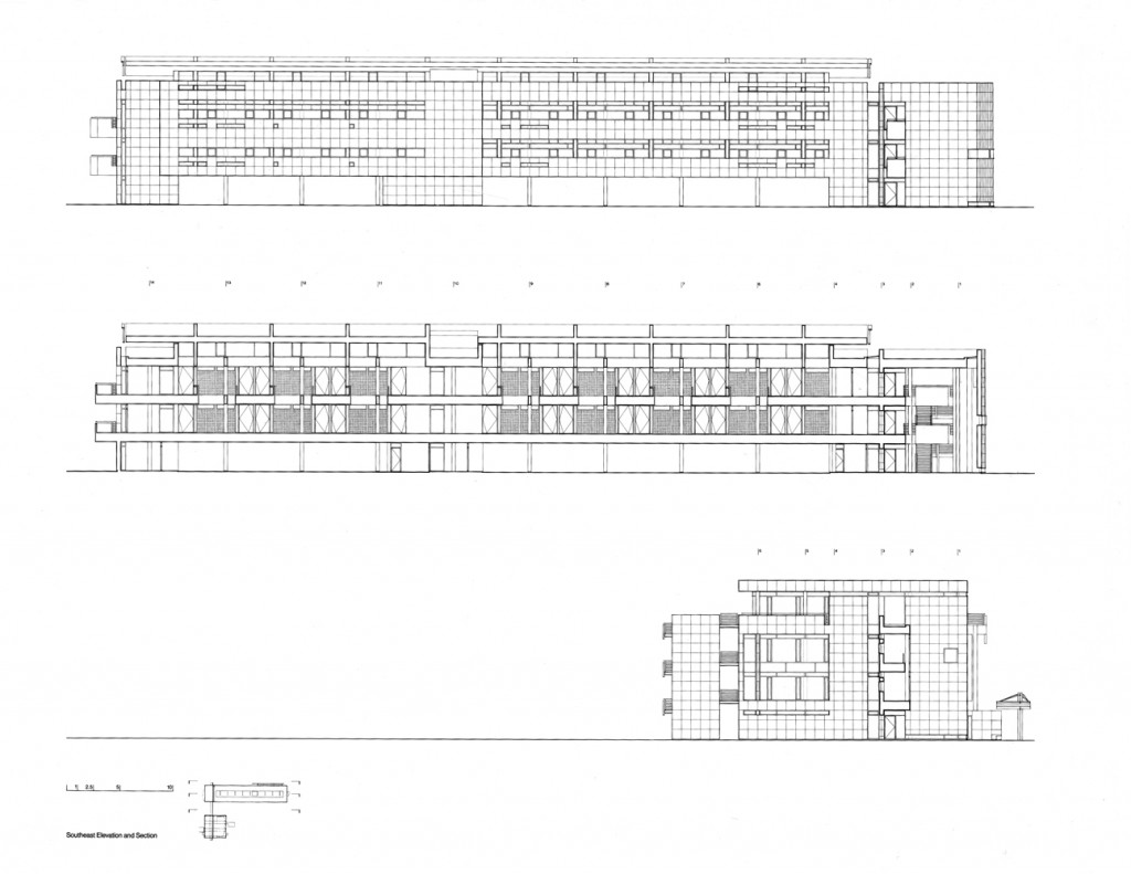 Sophisticated in its exterior treatment, the office slab sets up a counterpoint between the main structure of freestanding cylindrical columns and the projecting concrete blades that maintain structural continuity in the spandrel wall. Horizontal strip windows plus horizontal sun screens add further syncopation to the façade.
