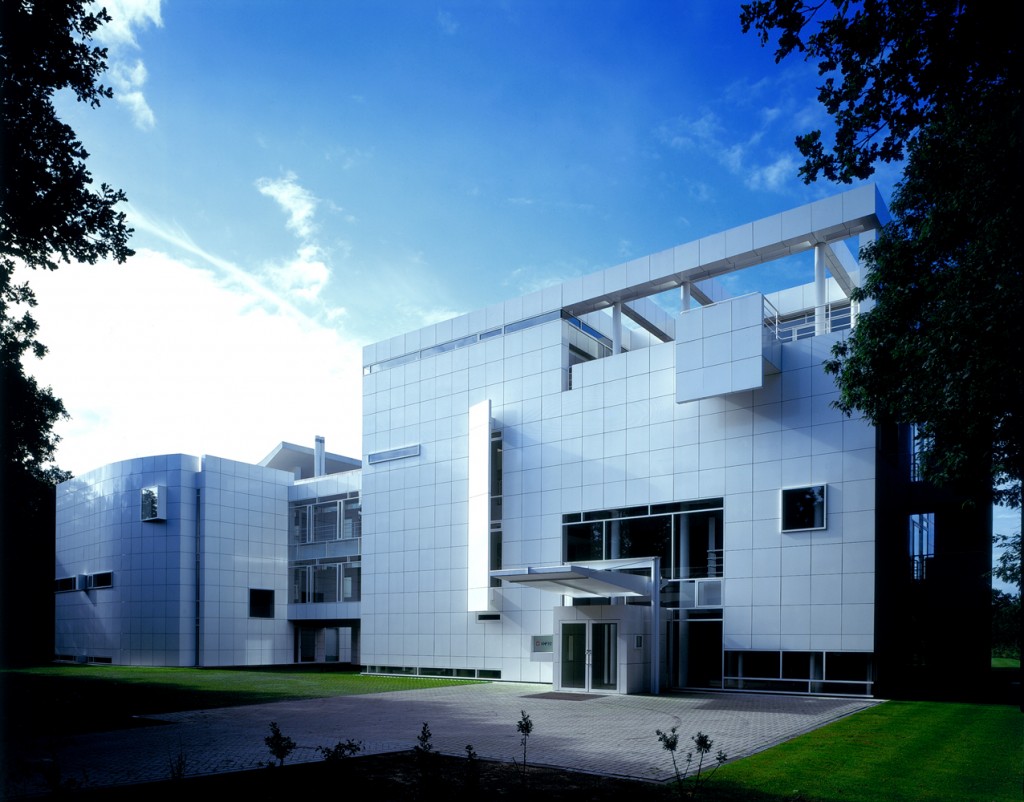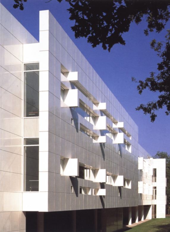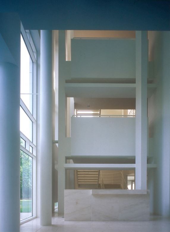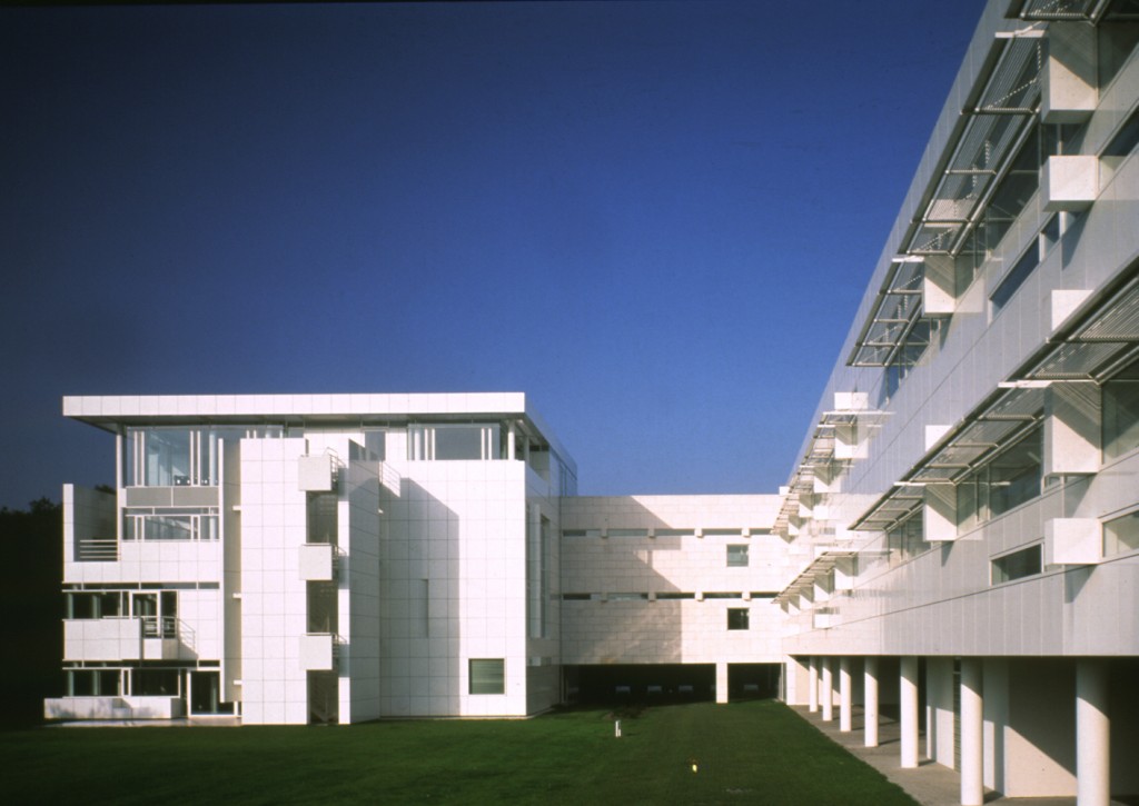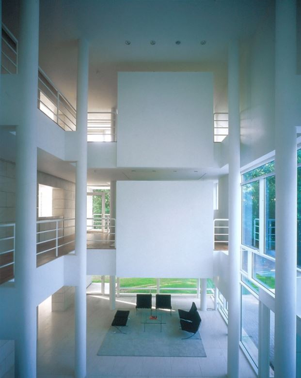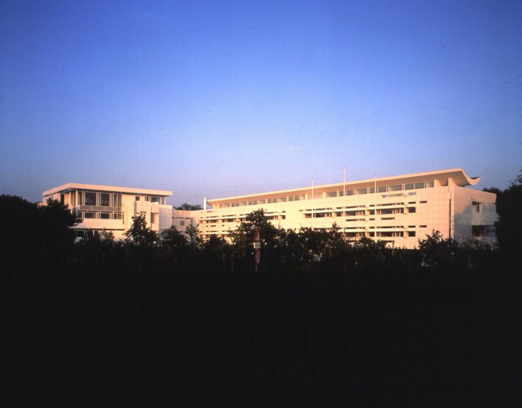 This headquarters for a prominent international paper company is set in a clearing in a densely wooded area. The building consists of two interconnected structures: a four-story cubic reception building and a two-story office slab elevated on pilotis. The former provides dining facilities on the lower two floors, with general staff convening in a double-height restaurant at grade and executives and visitors in mezzanine dining rooms above. These private dining spaces overlook the main space and open to terraces facing southwest and southeast. Guest offices and meeting rooms are on the second floor, with a 60-seat lecture hall and conference room above.