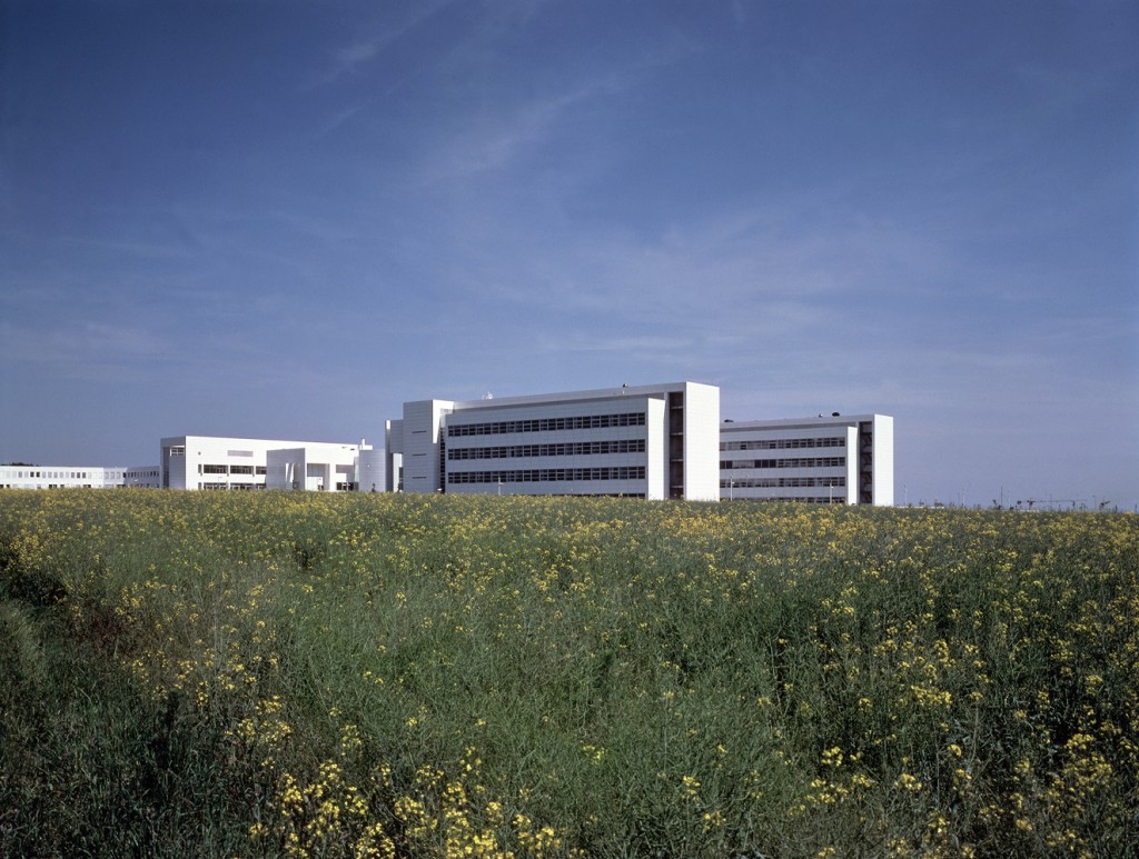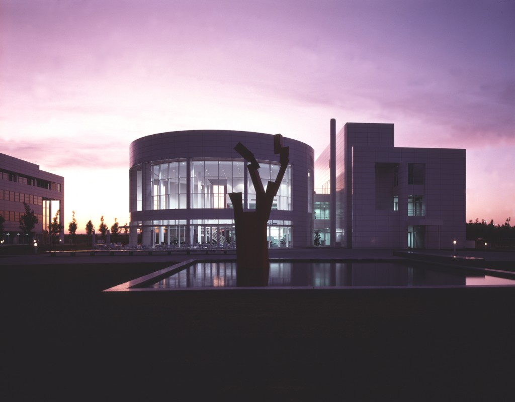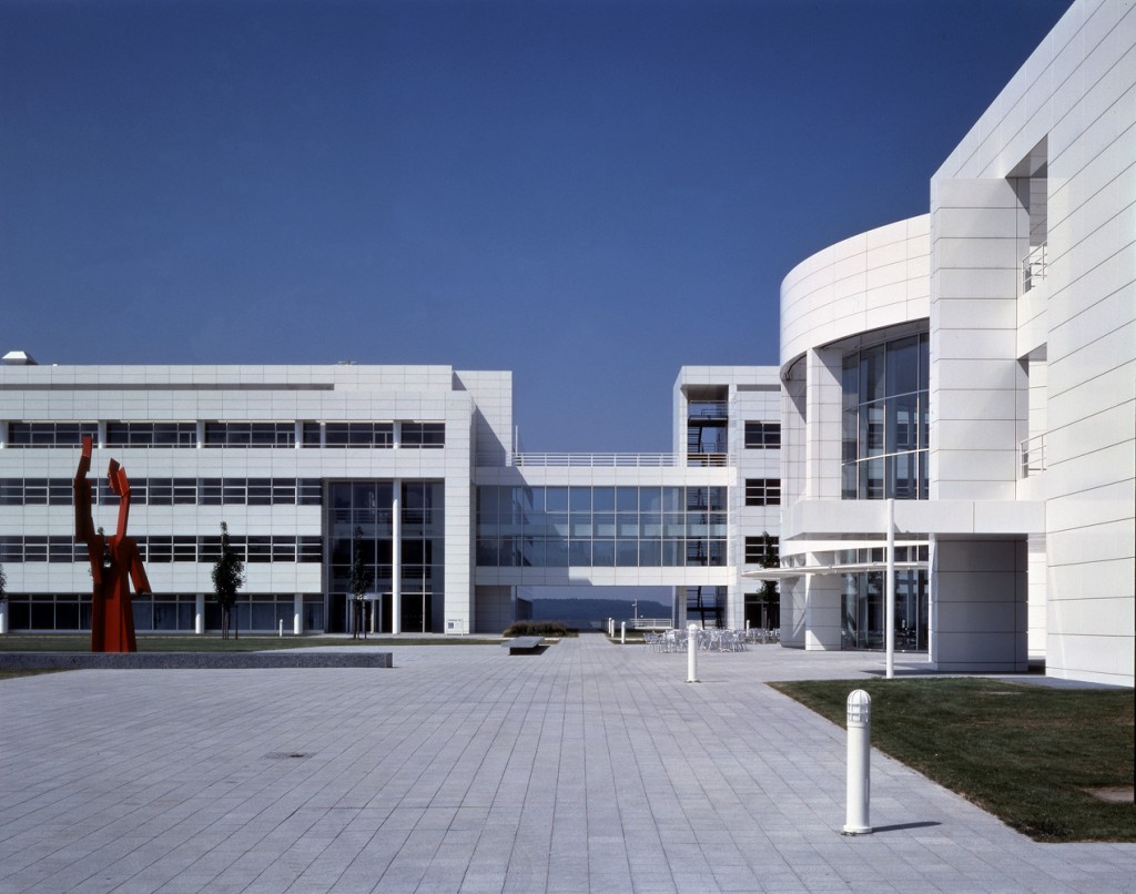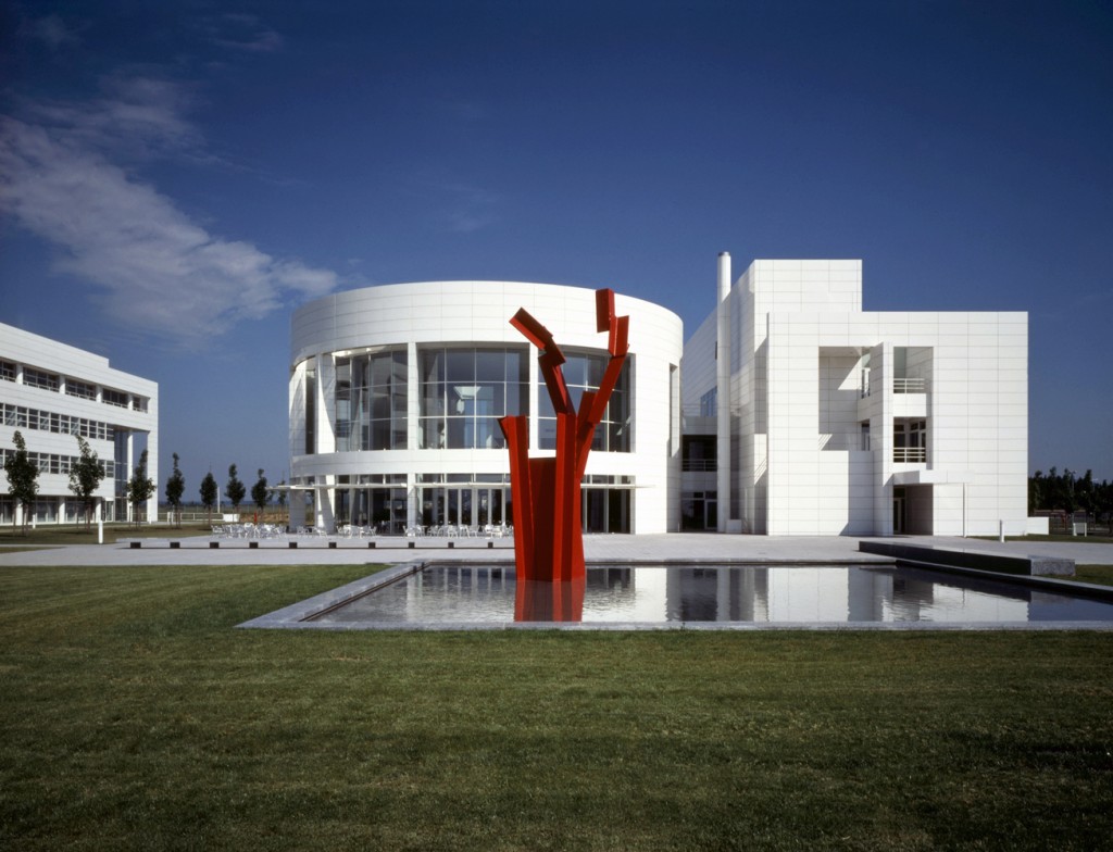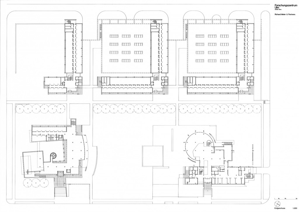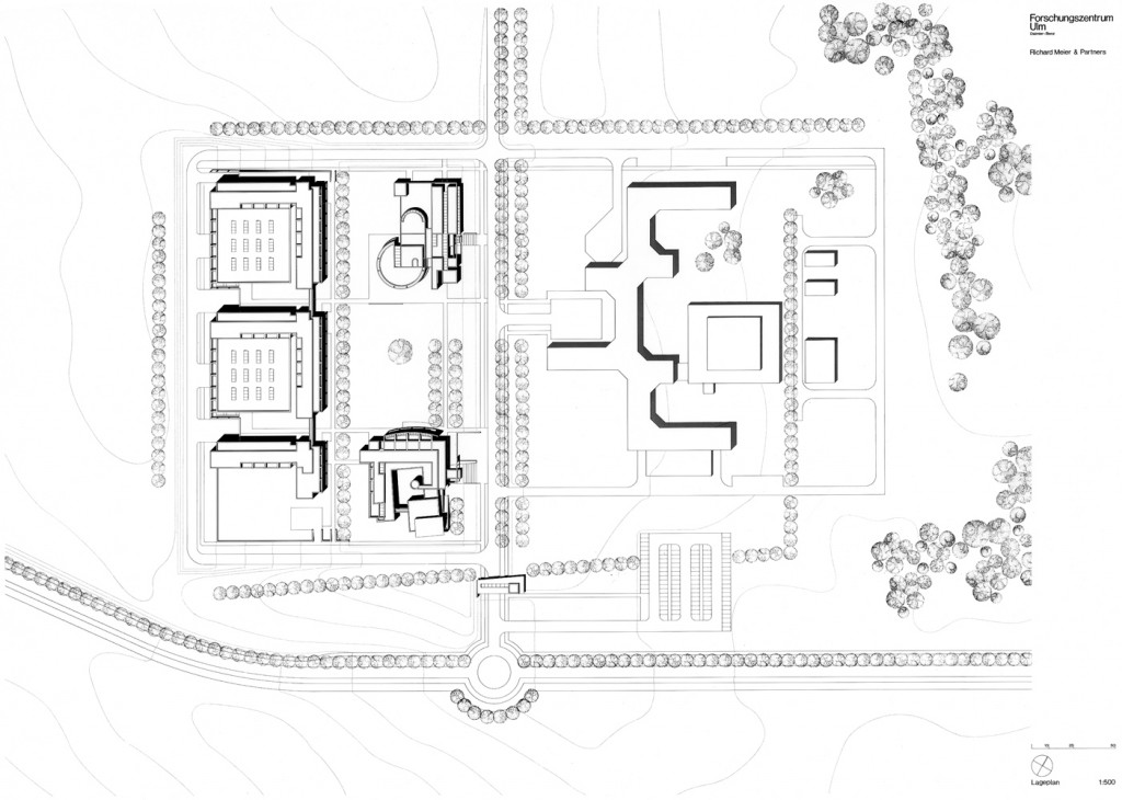 These laboratory/research facilities for Daimler-Benz in Ulm are the partial realization of a master plan for a larger research campus. The campus is organized as a repetitive grid of L-shaped office/laboratory units on either side of a central greensward. Within this space is a semipublic building housing a cafeteria/ restaurant on the ground floor and meeting rooms and a library on the second floor. This building serves as the sociocultural core of the complex. At present, this somewhat Jeffersonian plan is flanked by three new office laboratory units to the west and by a preexisting brick-faced research complex to the east.
