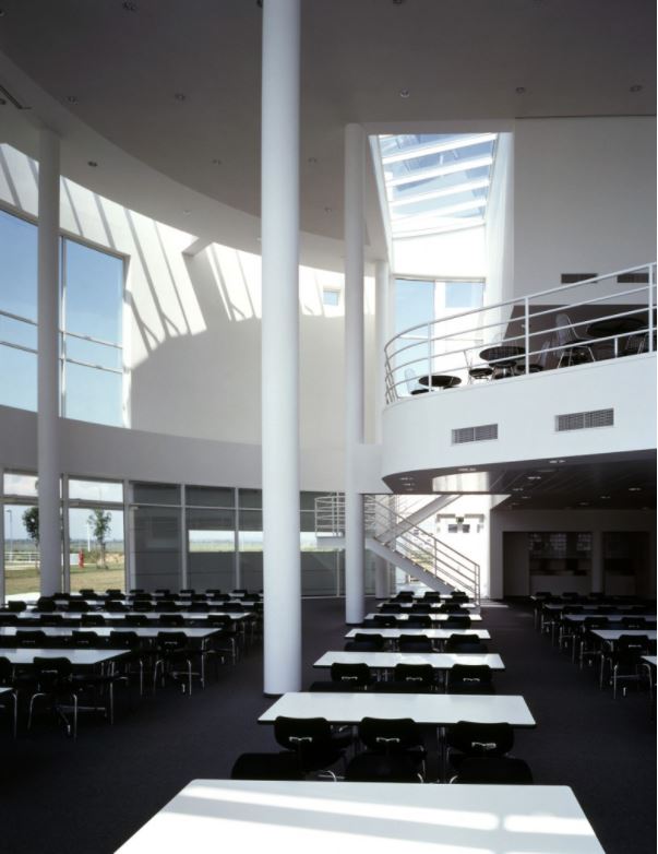 The two research modules built in the first phase share a large, open basement workshop for the fabrication of oversized components. This space is lit by skylights in the turf-covered roofs that span the factory/ laboratory space below. A depressed ring road serves this lower industrial level, thus preserving unobstructed views from the laboratories over the city of Ulm to the south and southeast and over the open country to the north and northwest. While security clearance is required throughout, all circulation is primarily pedestrian, with employees and visitors entering the compound via a central parking area to the north of the present phase. A single internal access road bounds the southeastern edge of the greensward. |